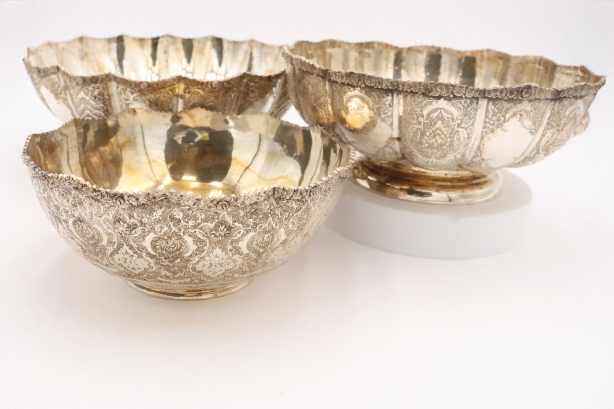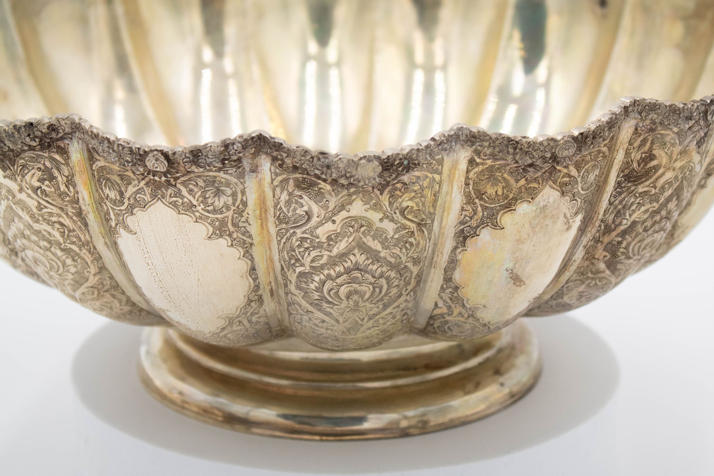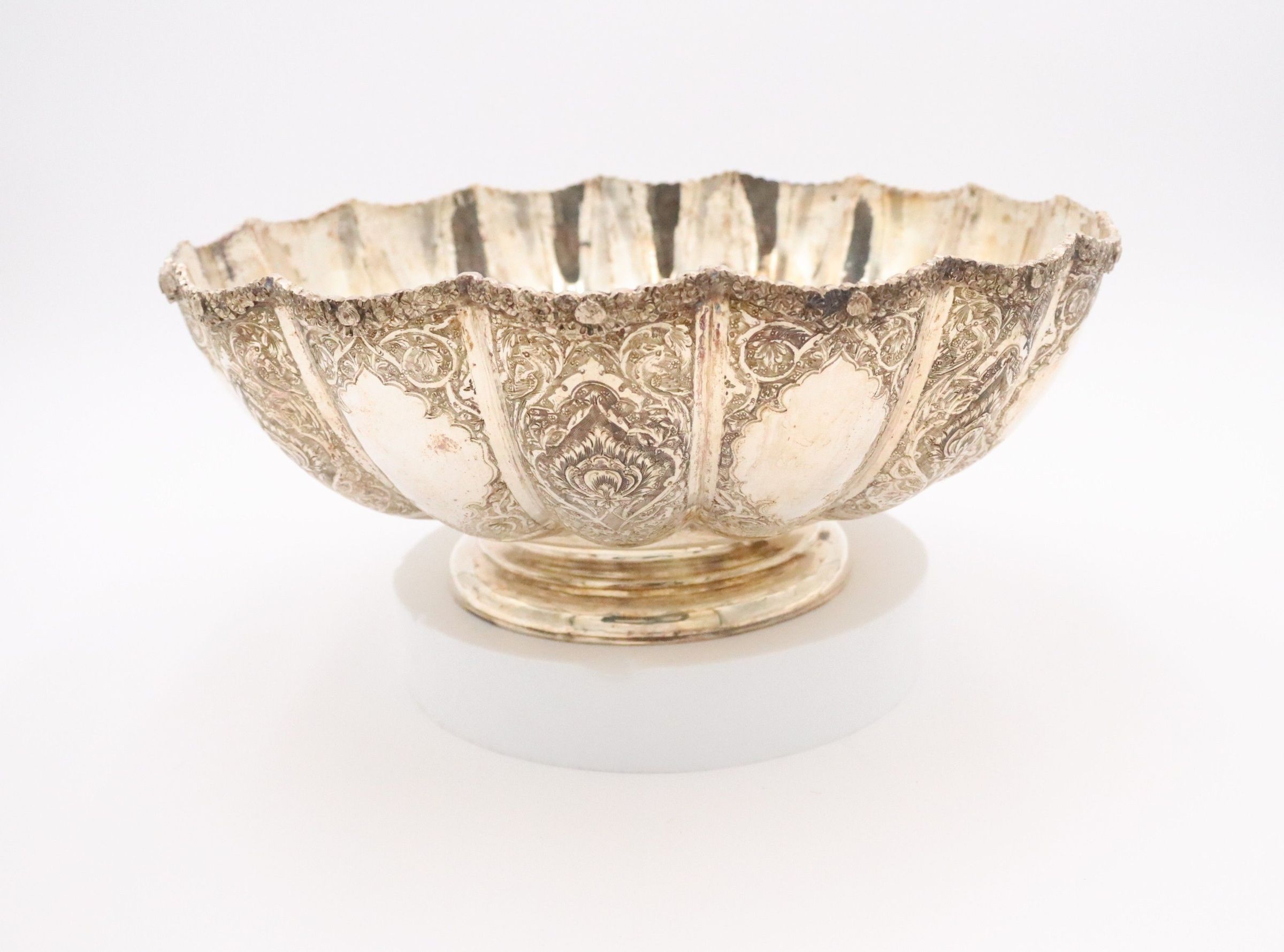 Small sterling silver scalloped serving bowel with engravings of vines and swirls. It was made during the early-20th century in Persia, now modern-day Iran. It was likely made by noted silversmith, Mohammad Bagher Parvaresh, in Isfahan, Iran.Context