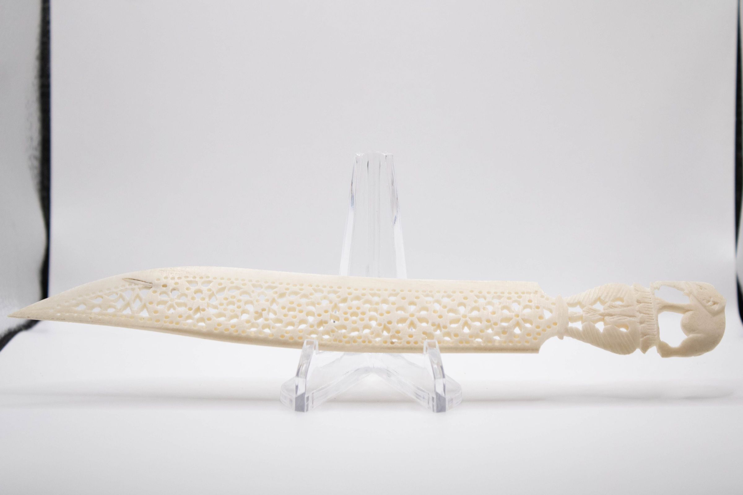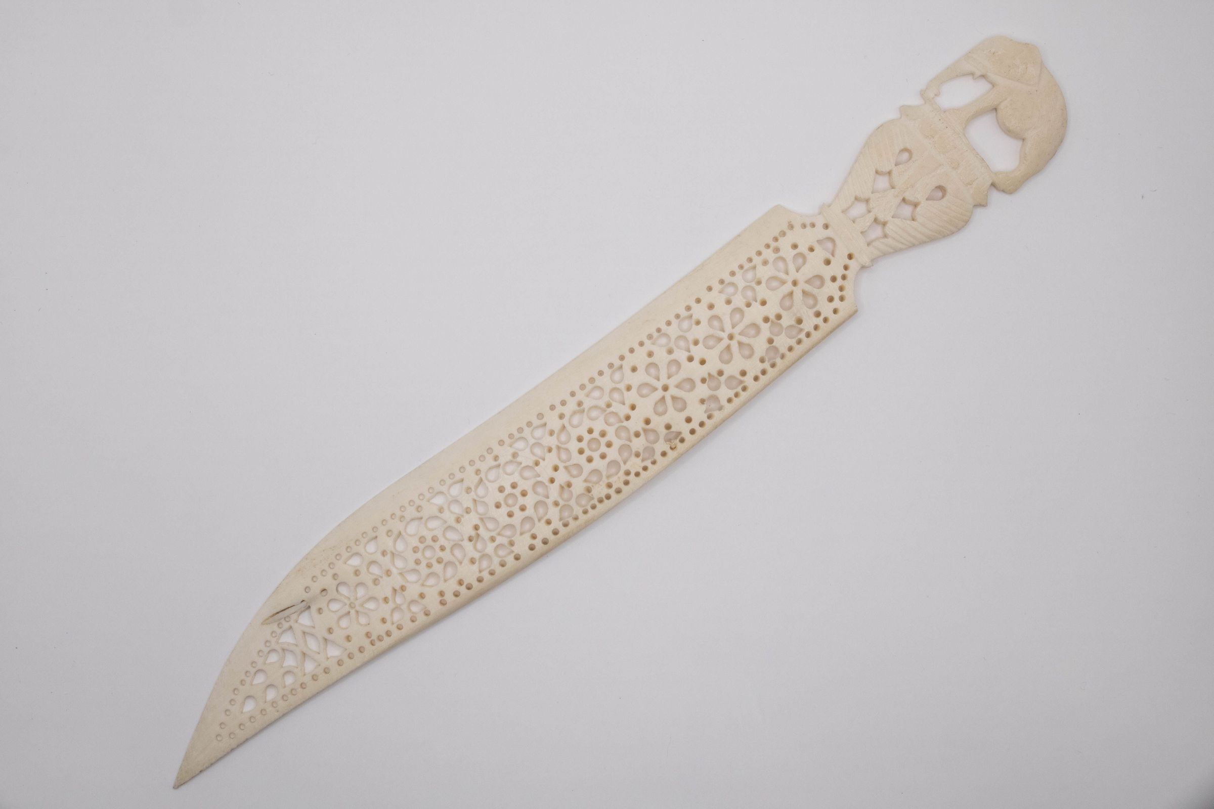 Small ivory letter opener with elephant on handle. It is decorated with cutouts in a floral pattern along the blade. The letter opener was made in India.Context