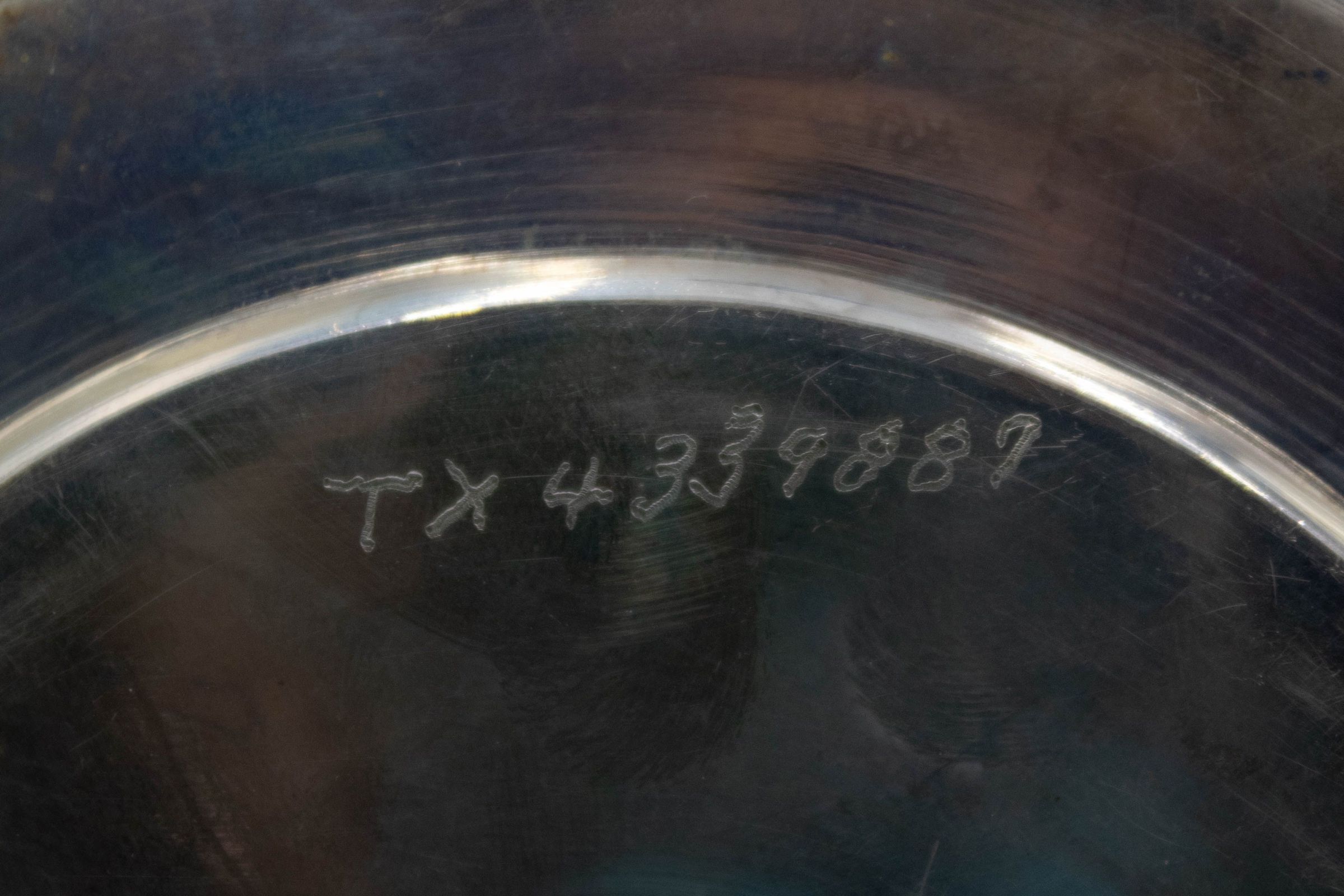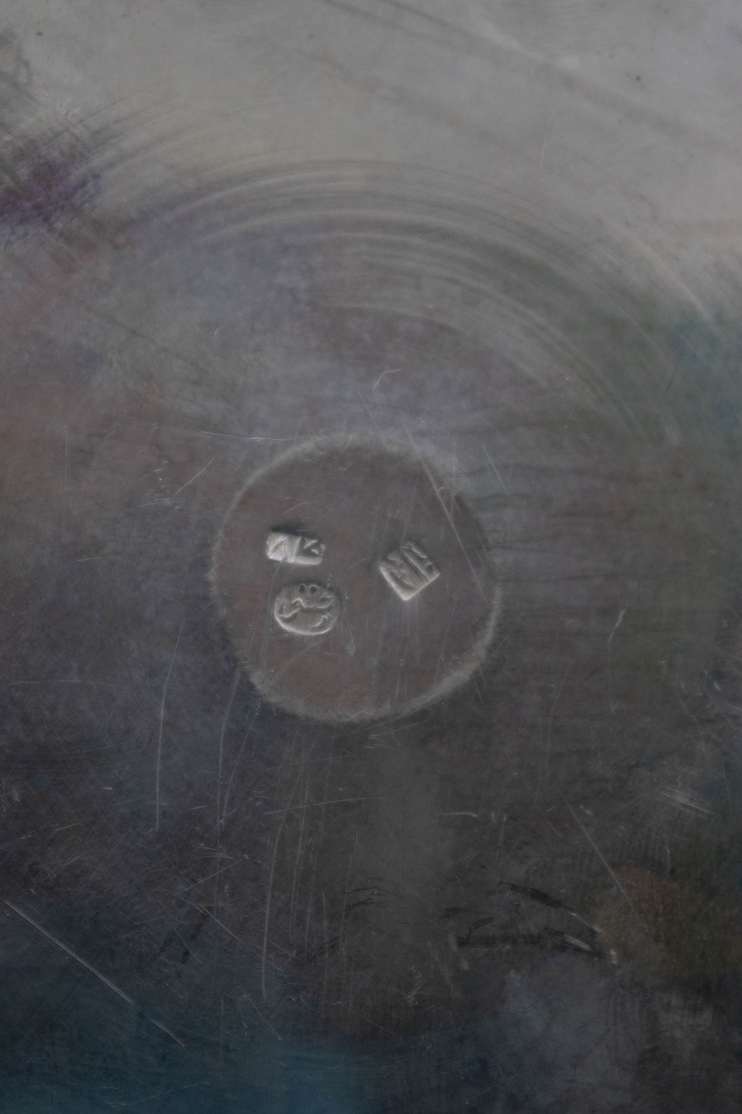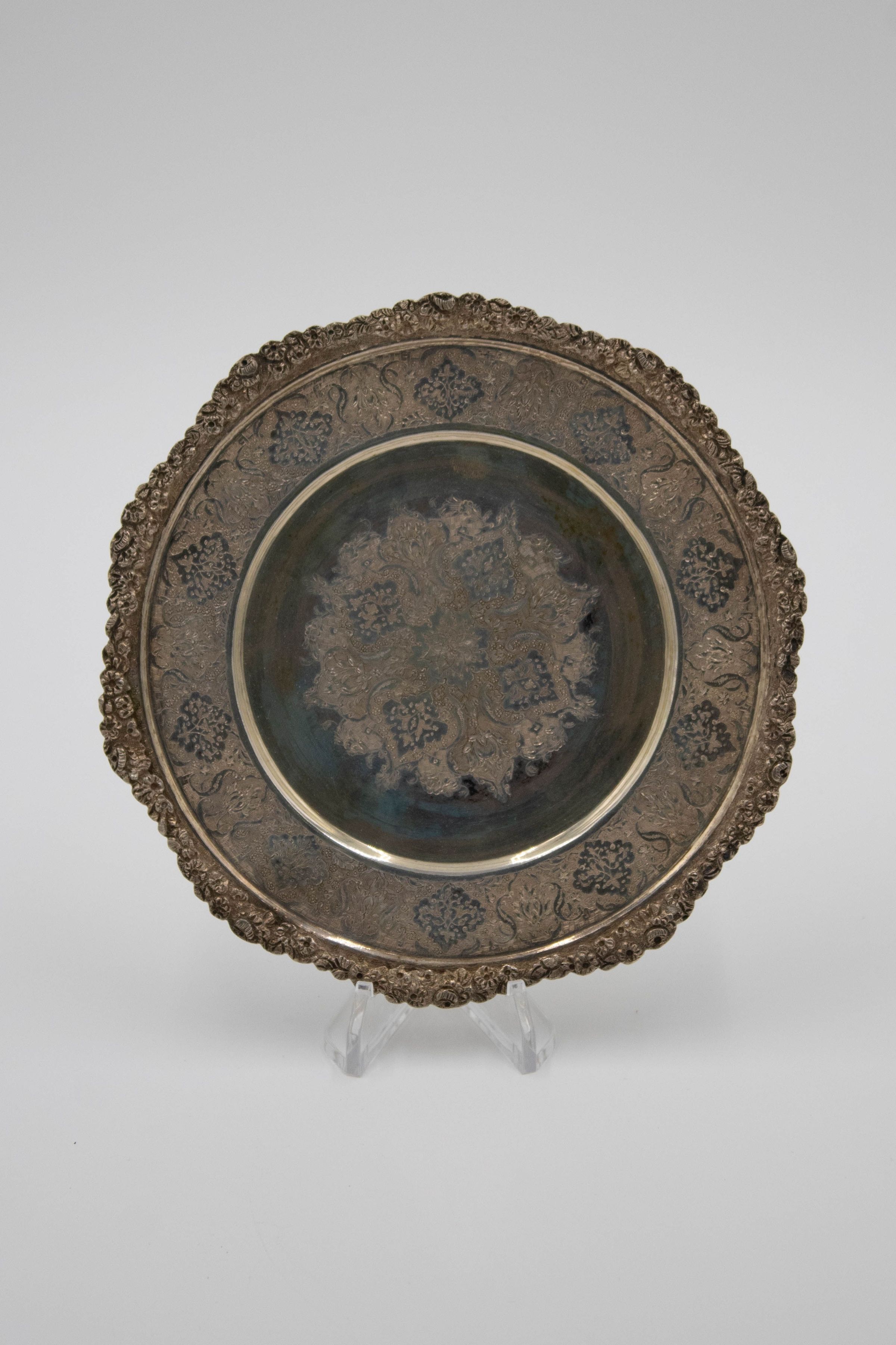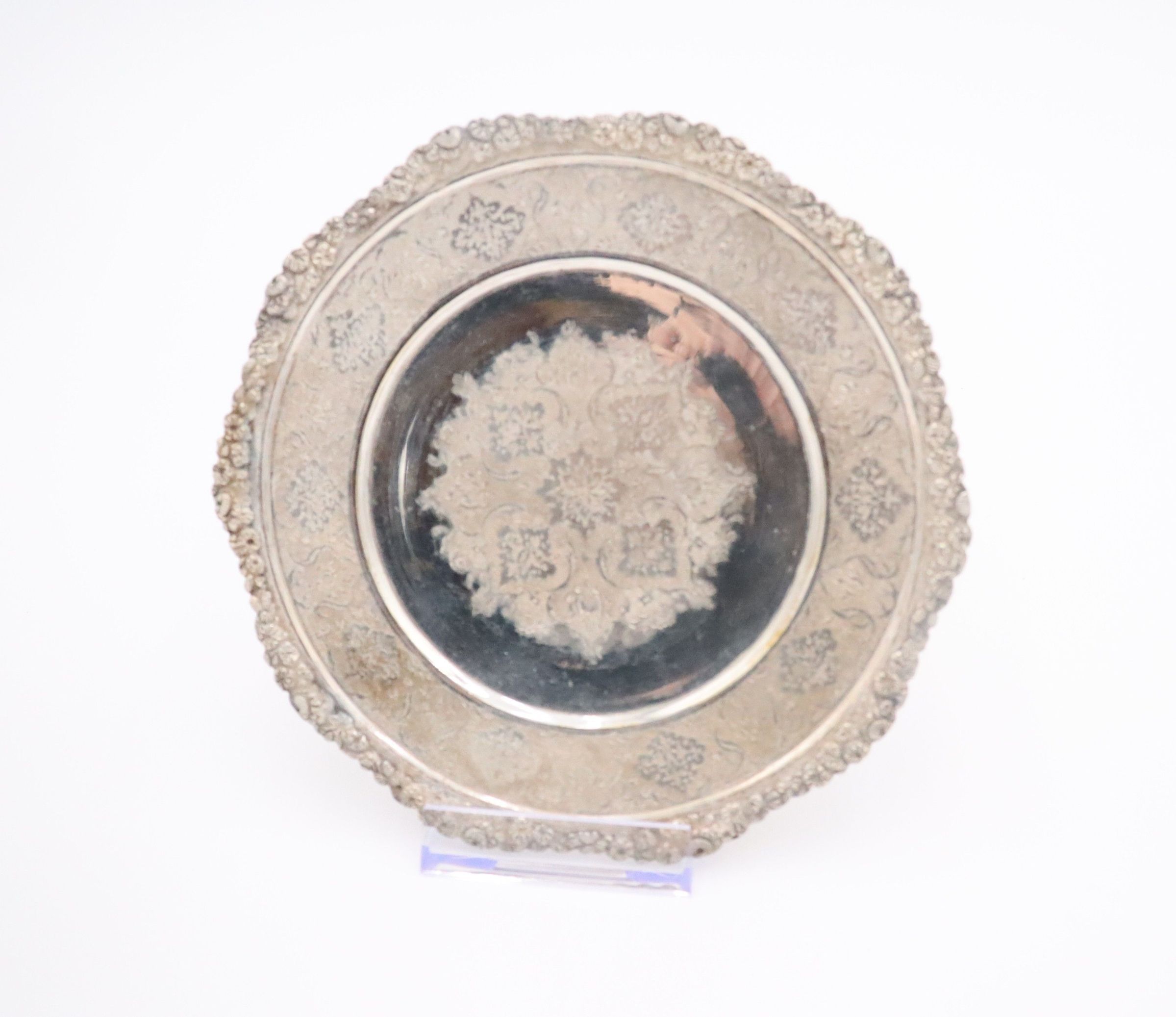 Small round silver plate engraved with repeating pattern.