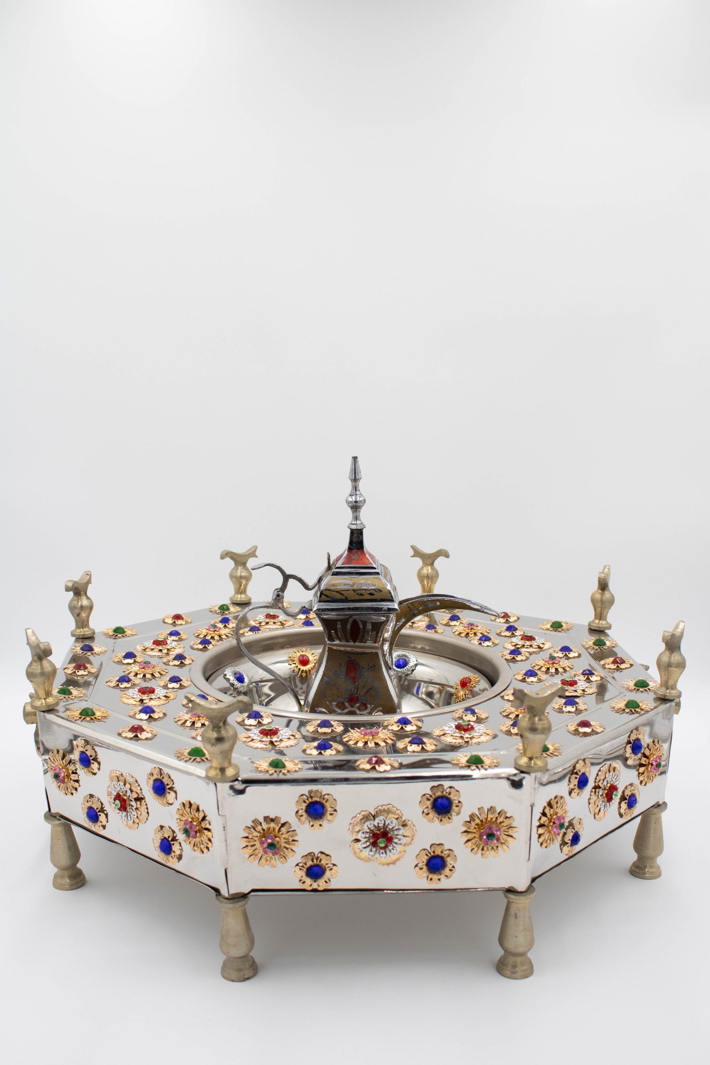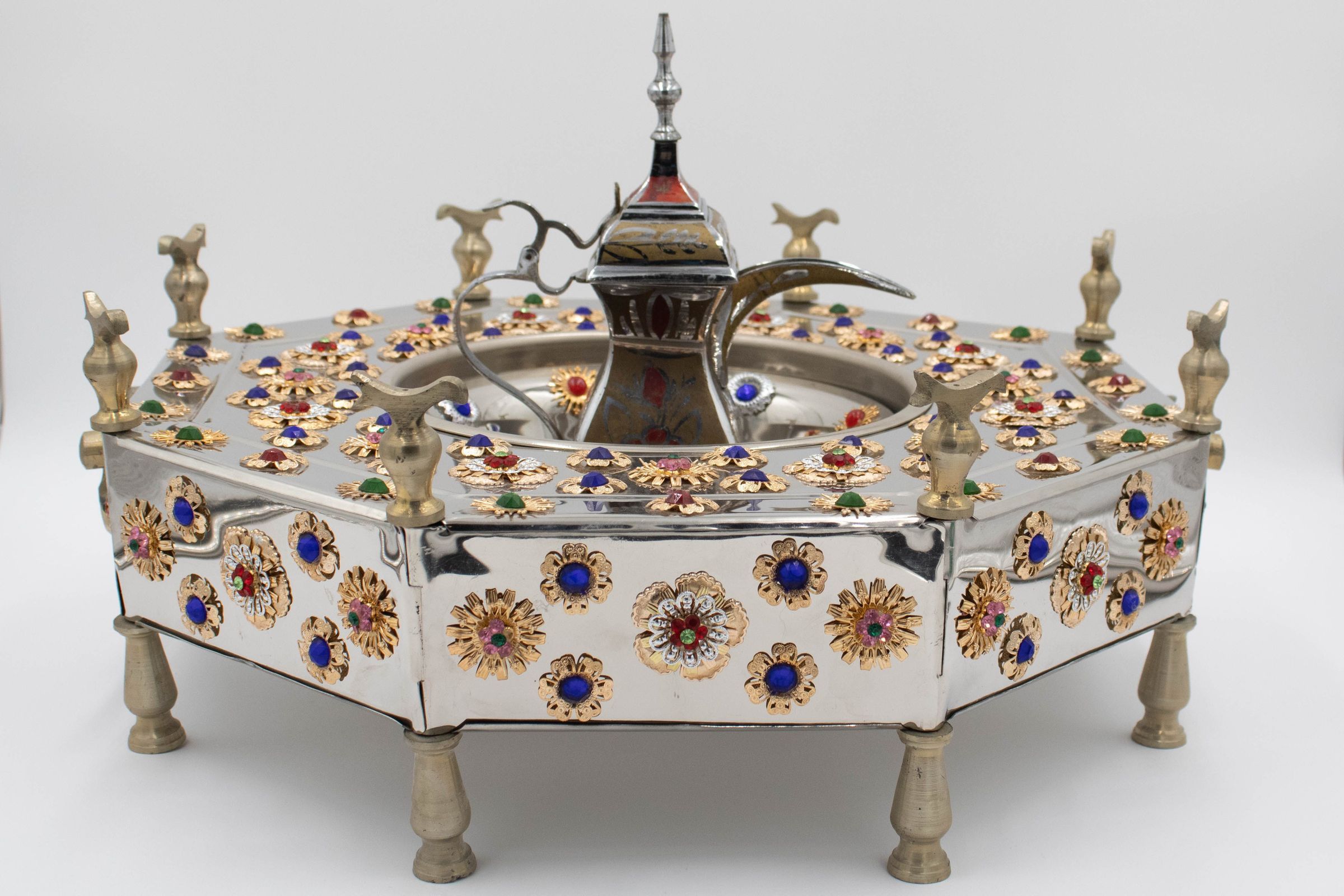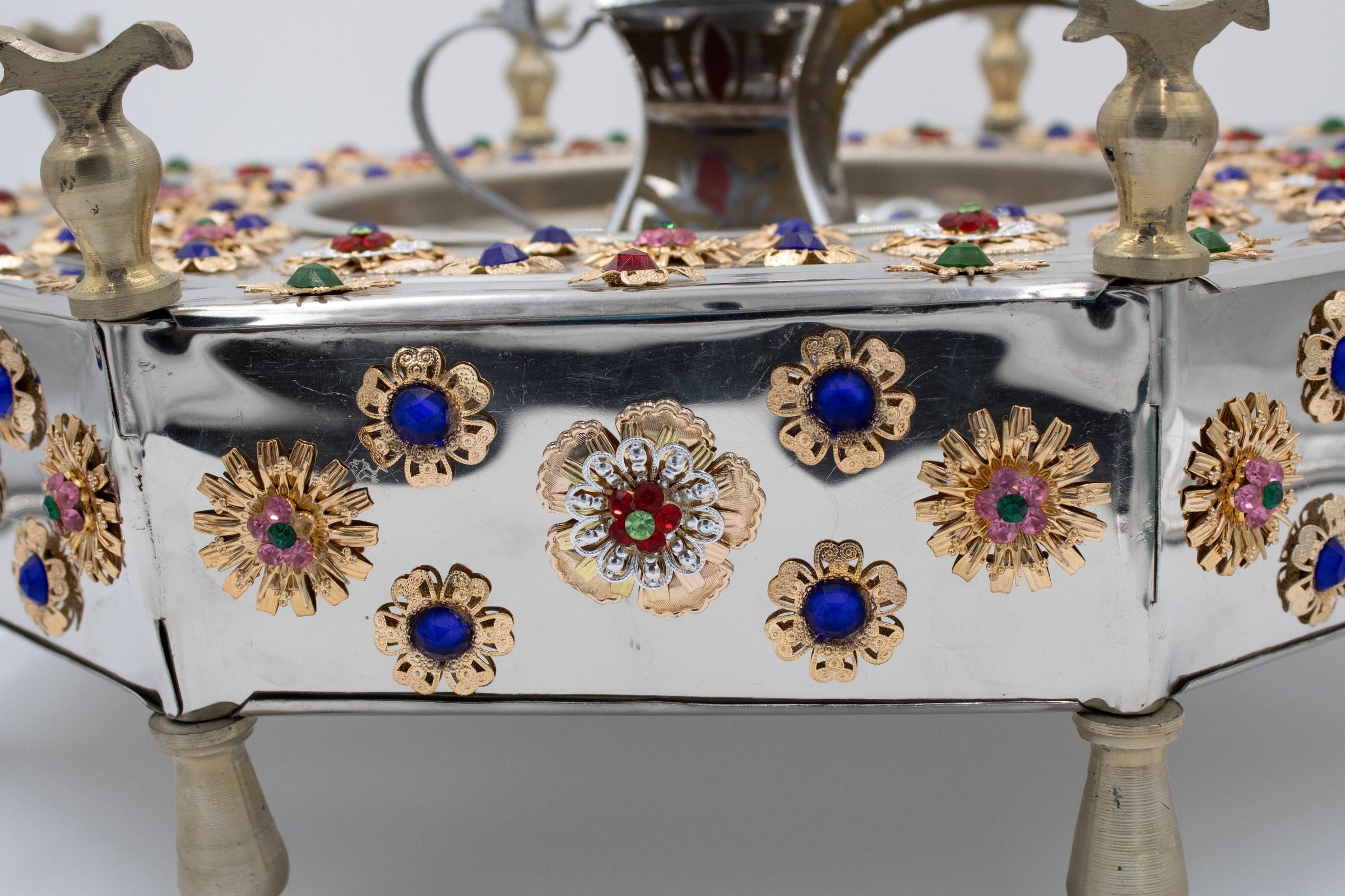 Stainless steel and brass brazier with gold floral and stone appliques, studded with genuine jewels.Context