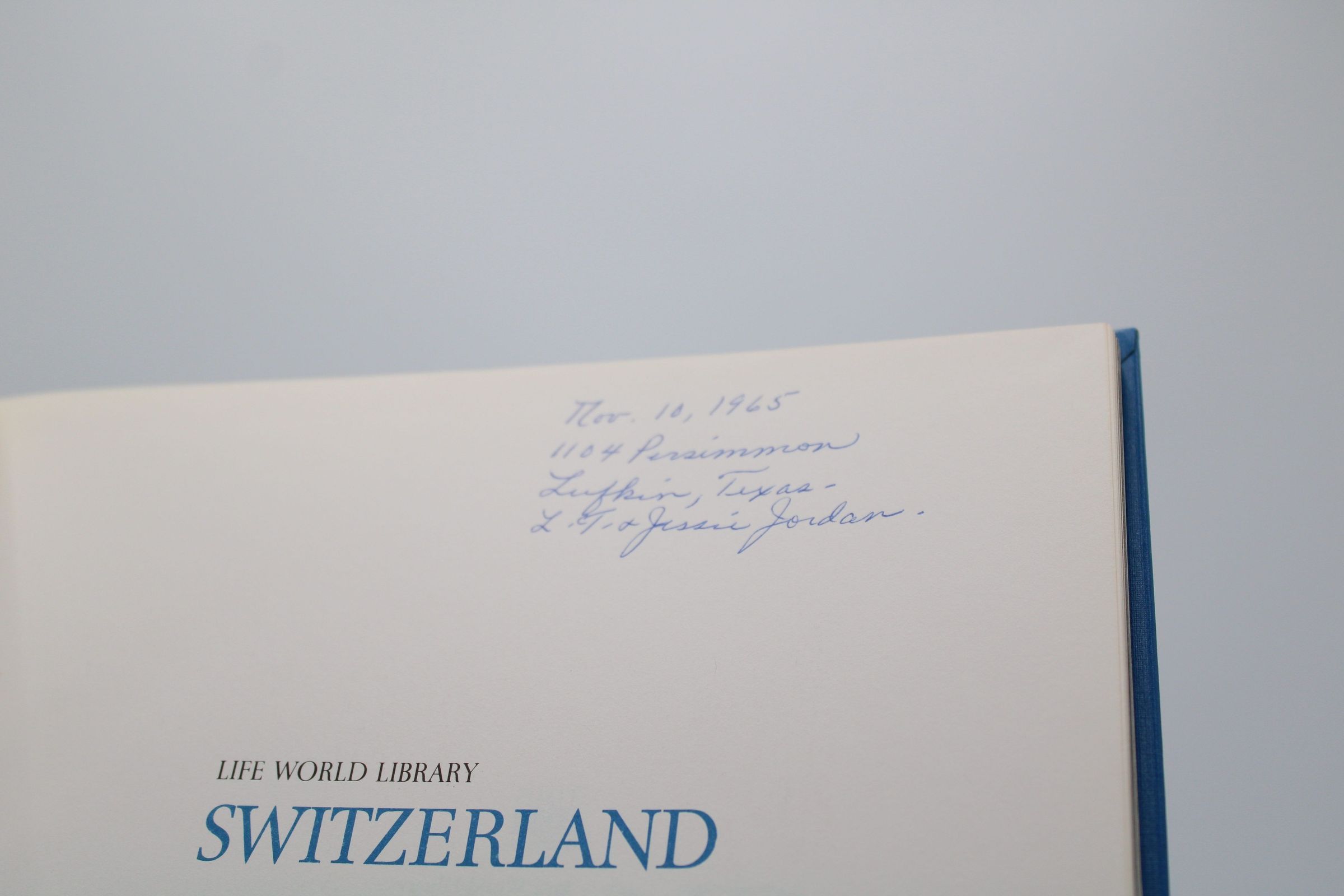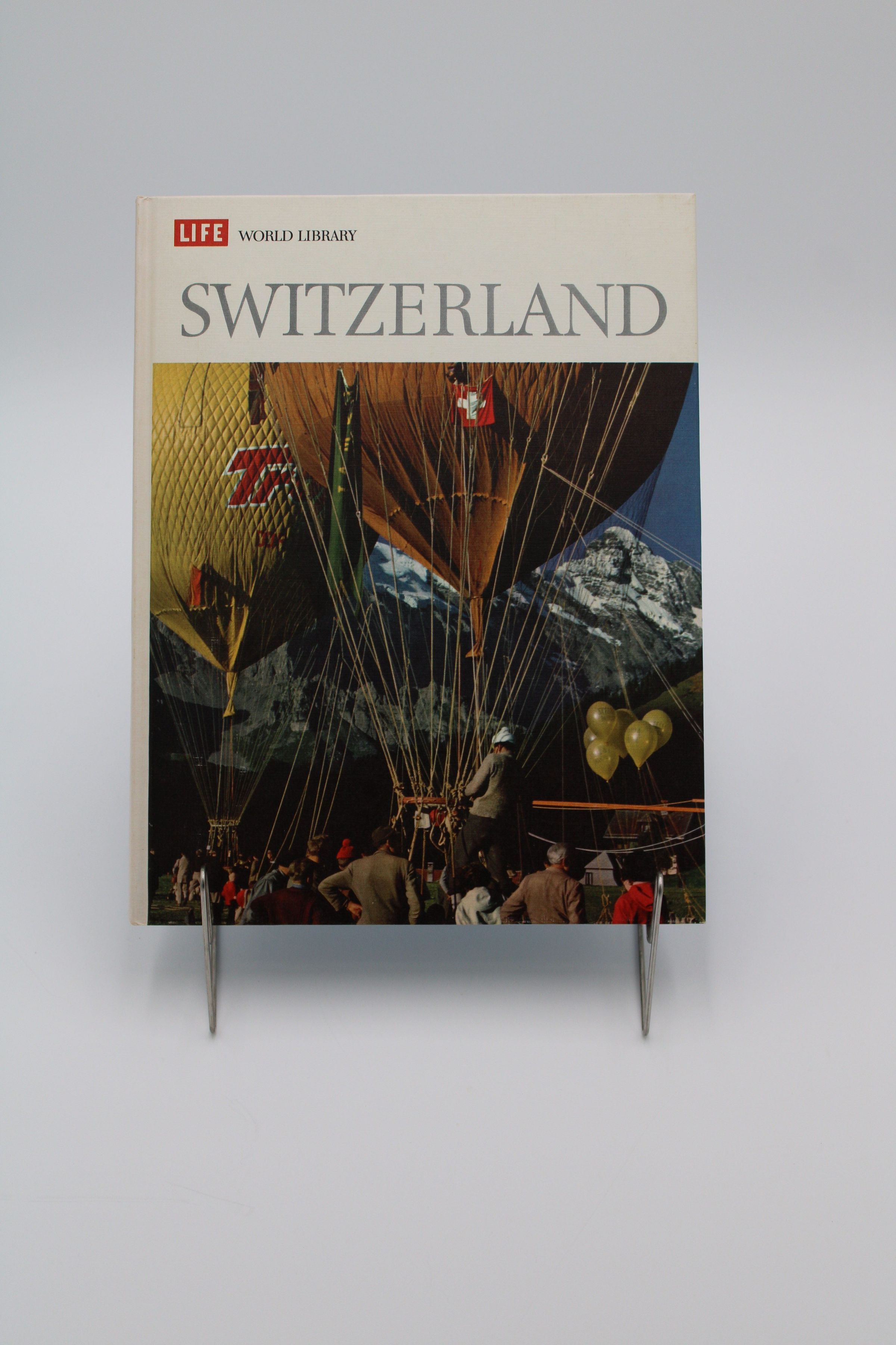 The front cover of “Switzerland” features a colored photograph of the release of two hot air balloons near the Swiss Alps.