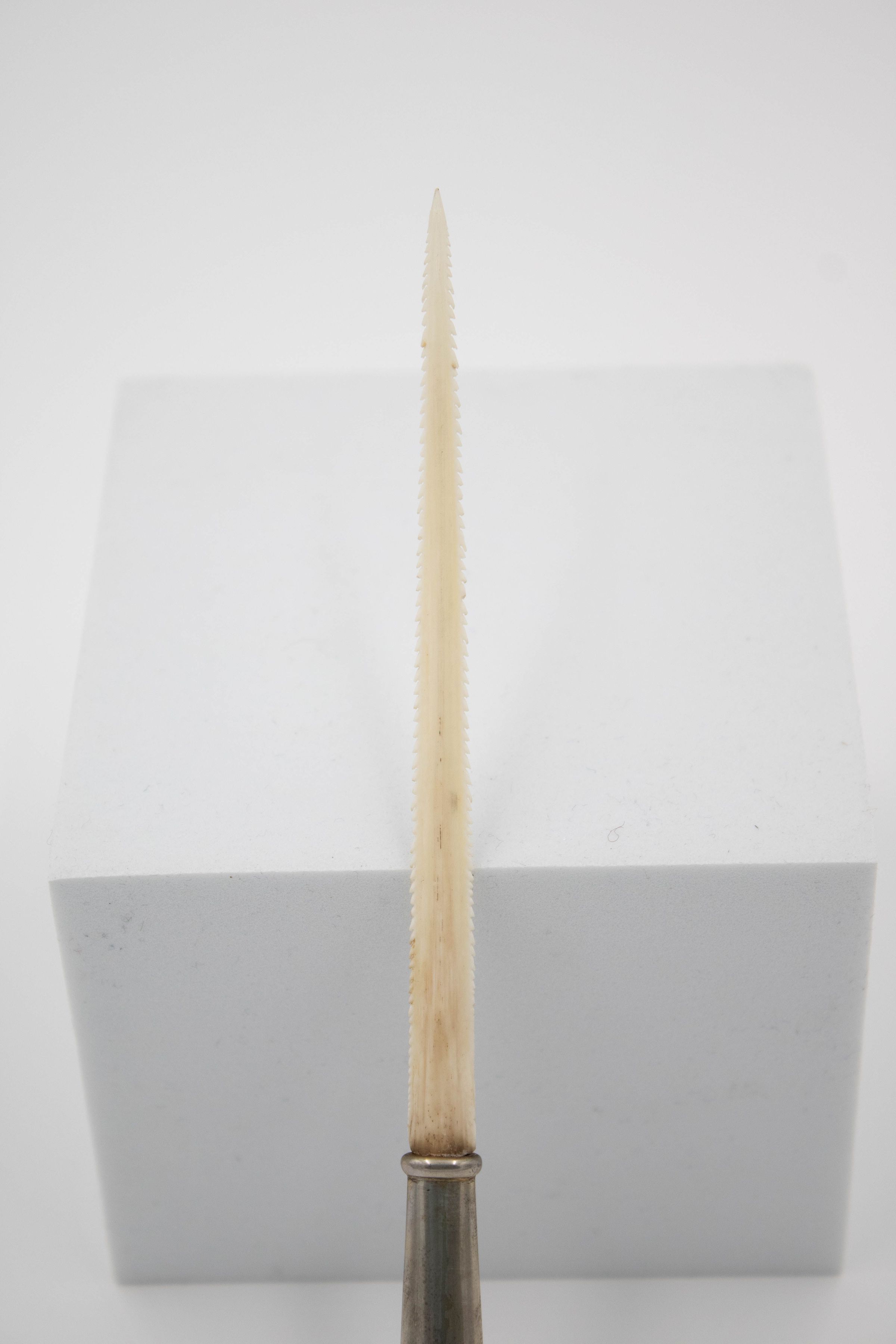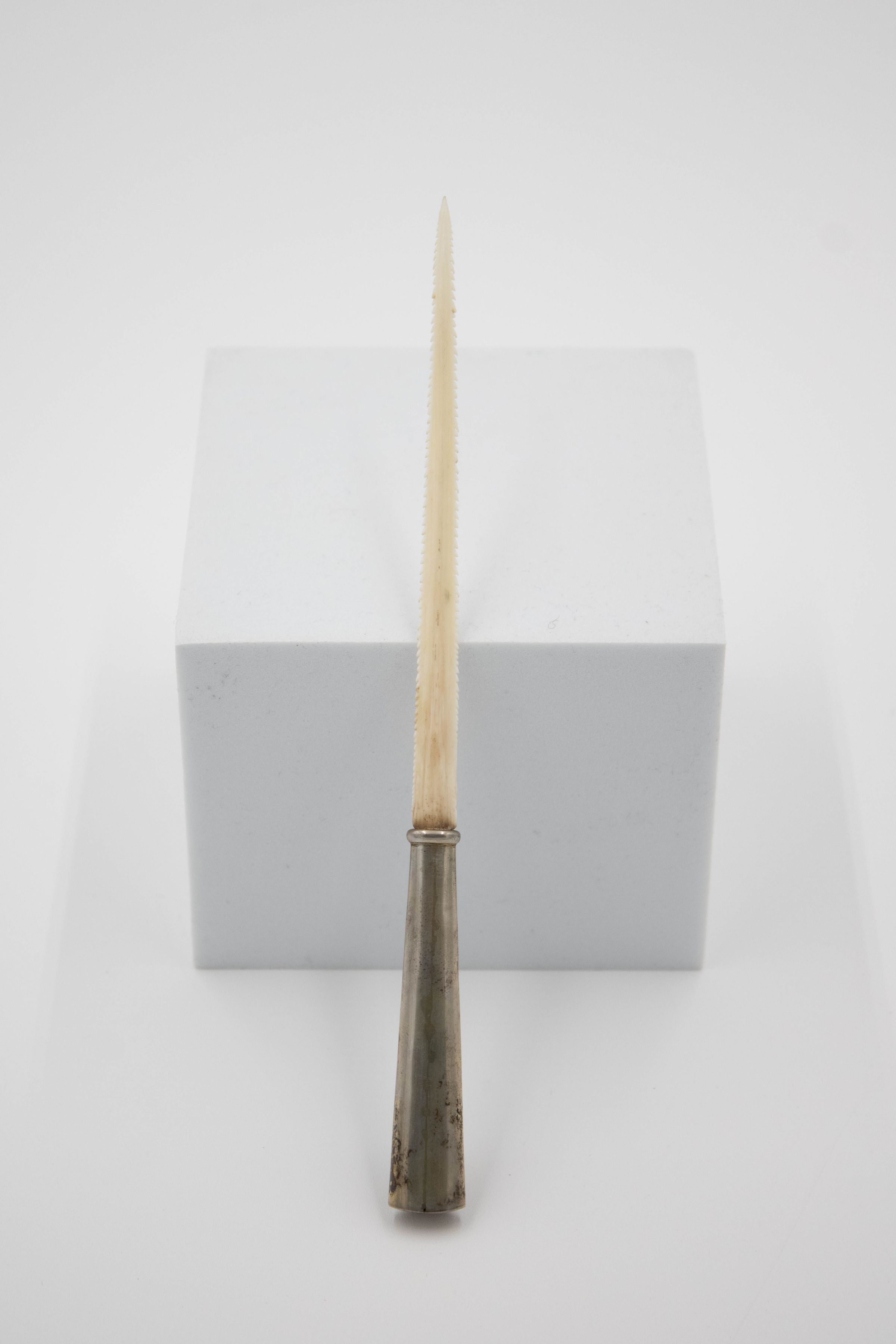 Small, double-edged letter opener with sterling silver handle and swordfish blade.Context