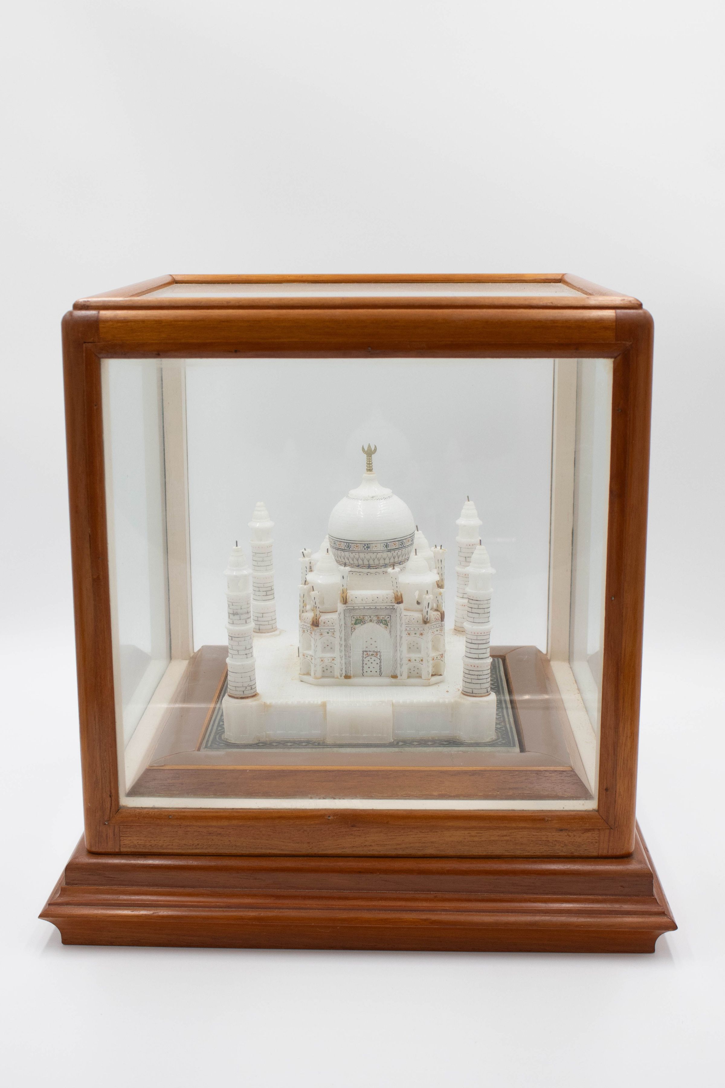 Model of Taj Mahal lamp in a glass case framed in wood.Context