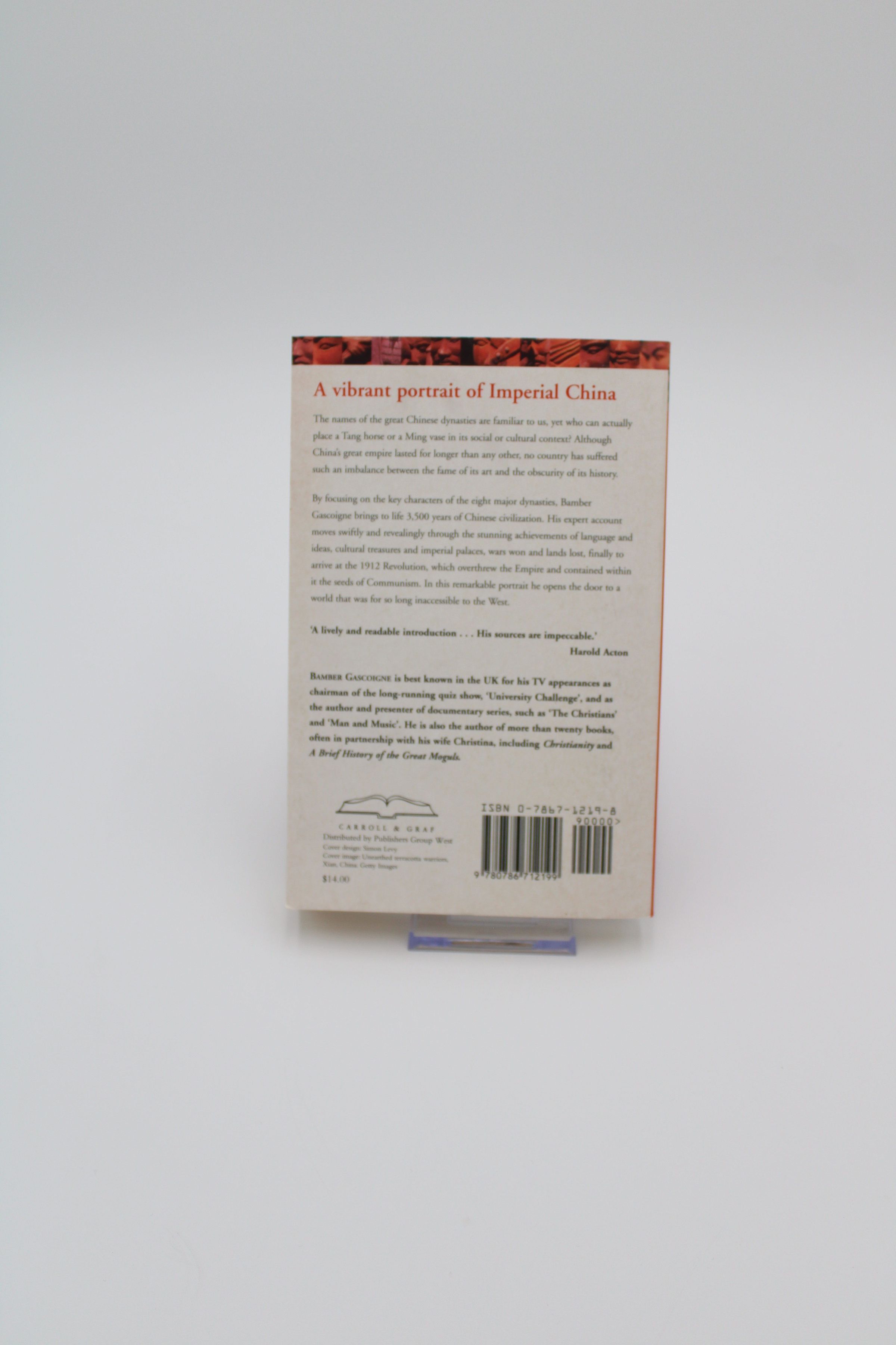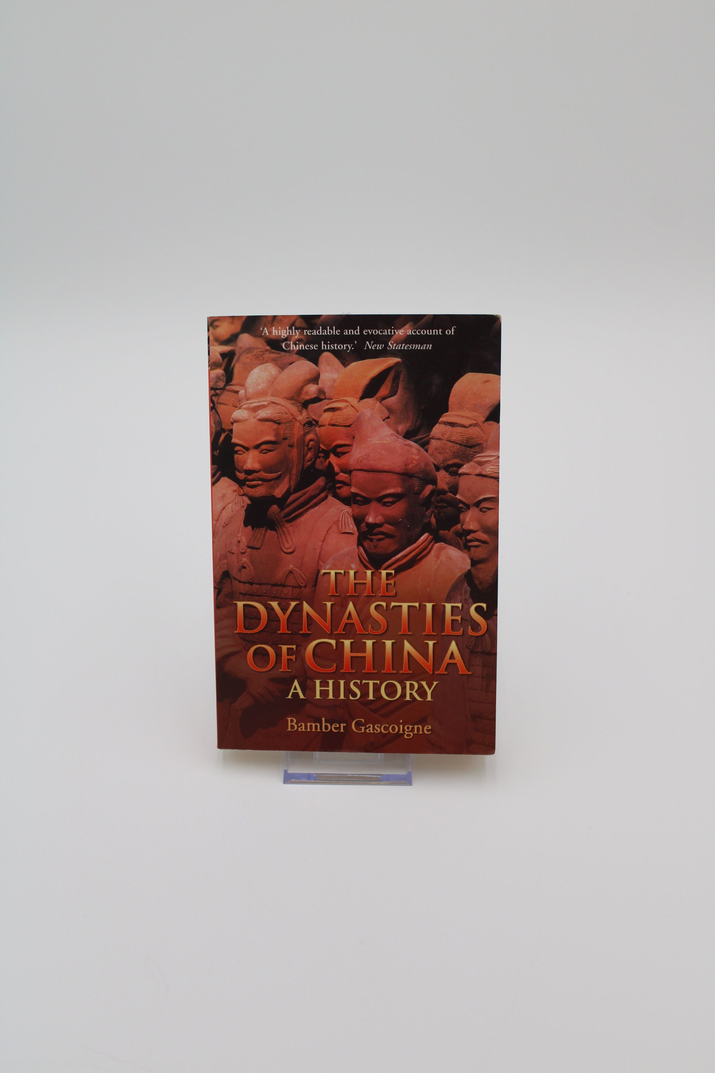 The Front Cover of "The Dynasties of China" features a red-shaded picture of the Terracotta Army as well as the book title and subtitle "A History" in a serif orange font.