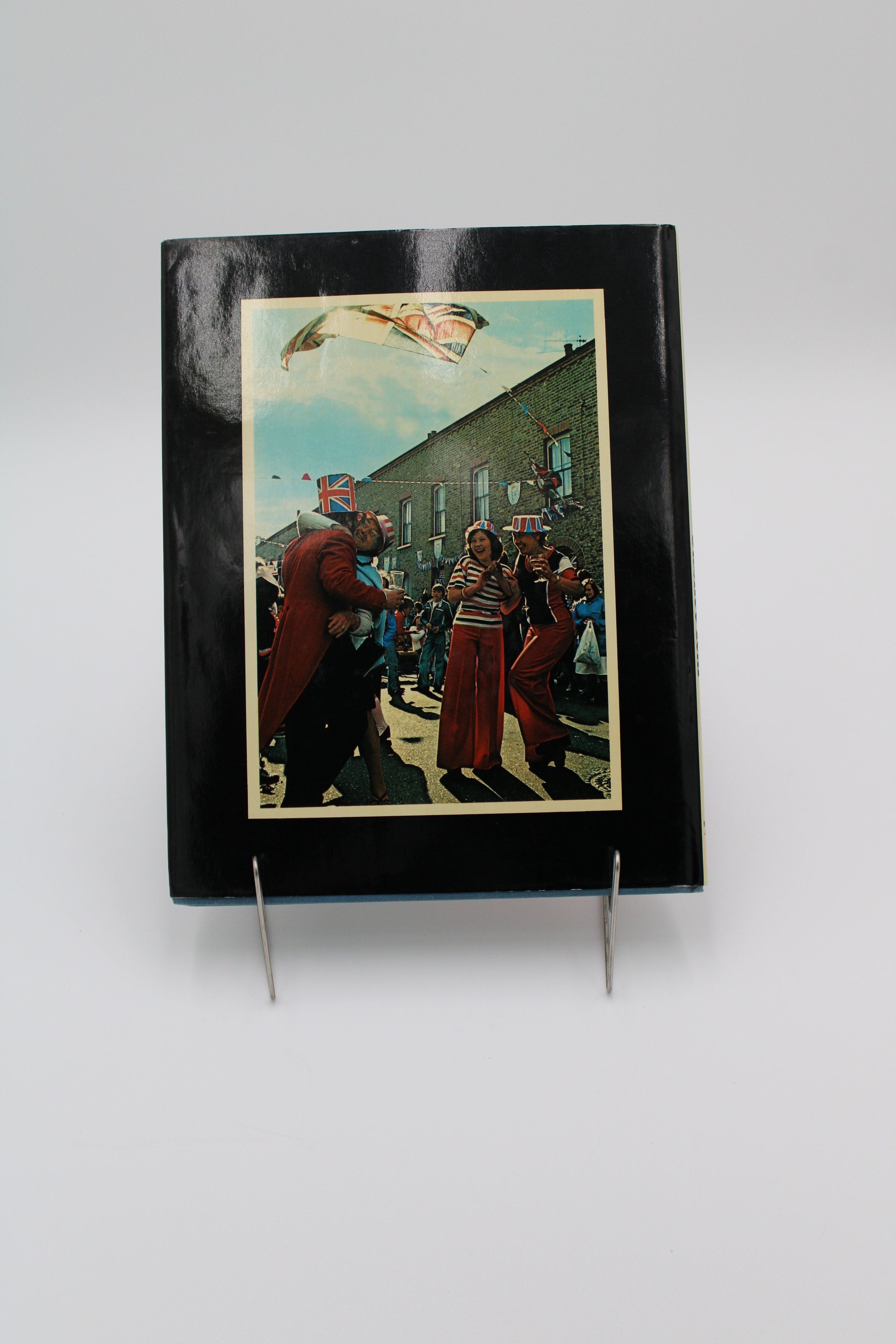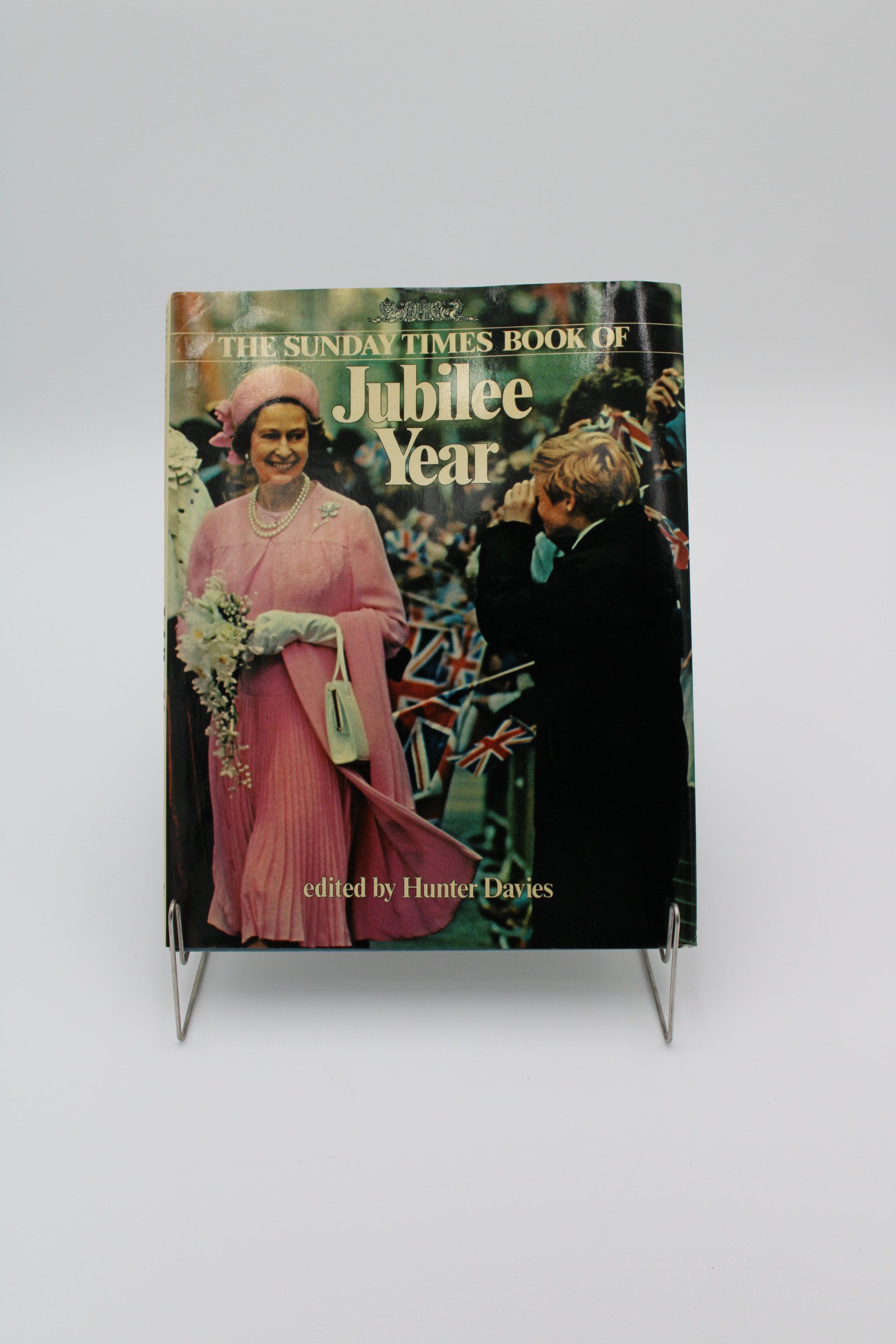 The cover features Queen Elizabeth wearing a pink dress, coat, and hat. She is holding flowers walking through a crowd of people holding miniature British flags. It has the title and "edited by Hunter Davies," written on the cover.