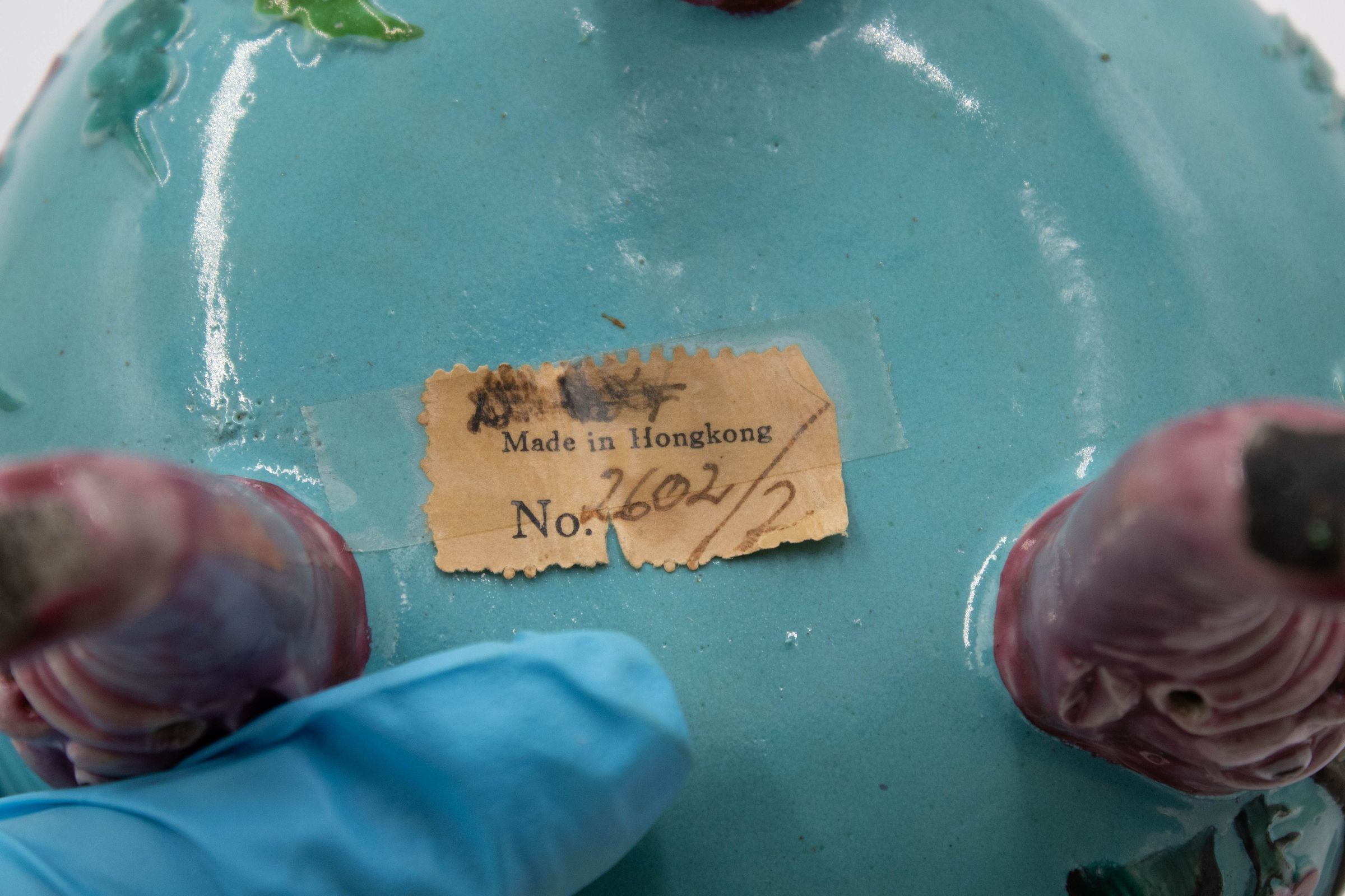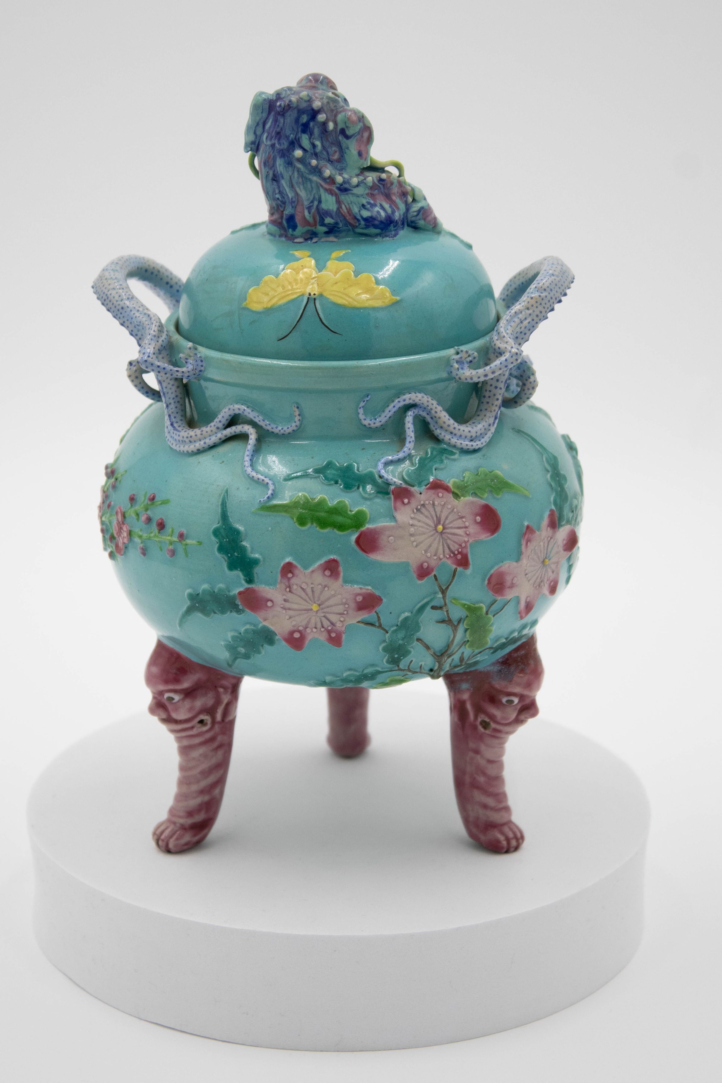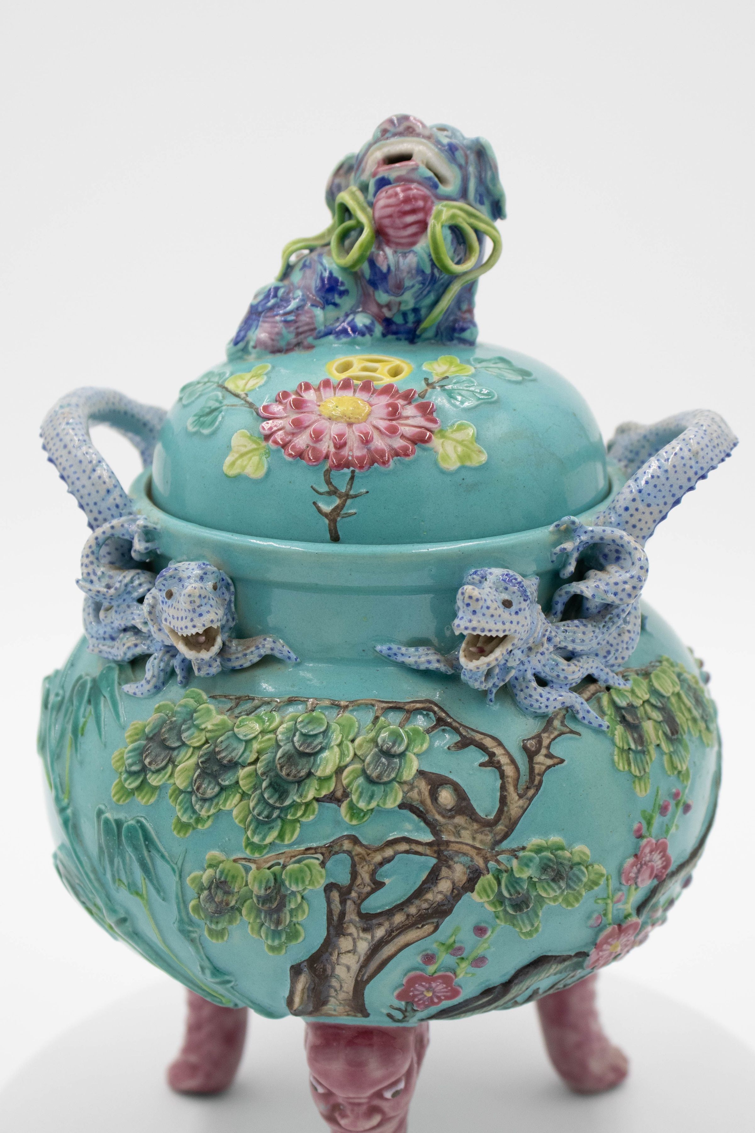 Turquoise Chinese footed incense burner decorated with a Chinese elm tree, pink lotus flowers, and blue dragons. The burner was made in Hong Kong.Context