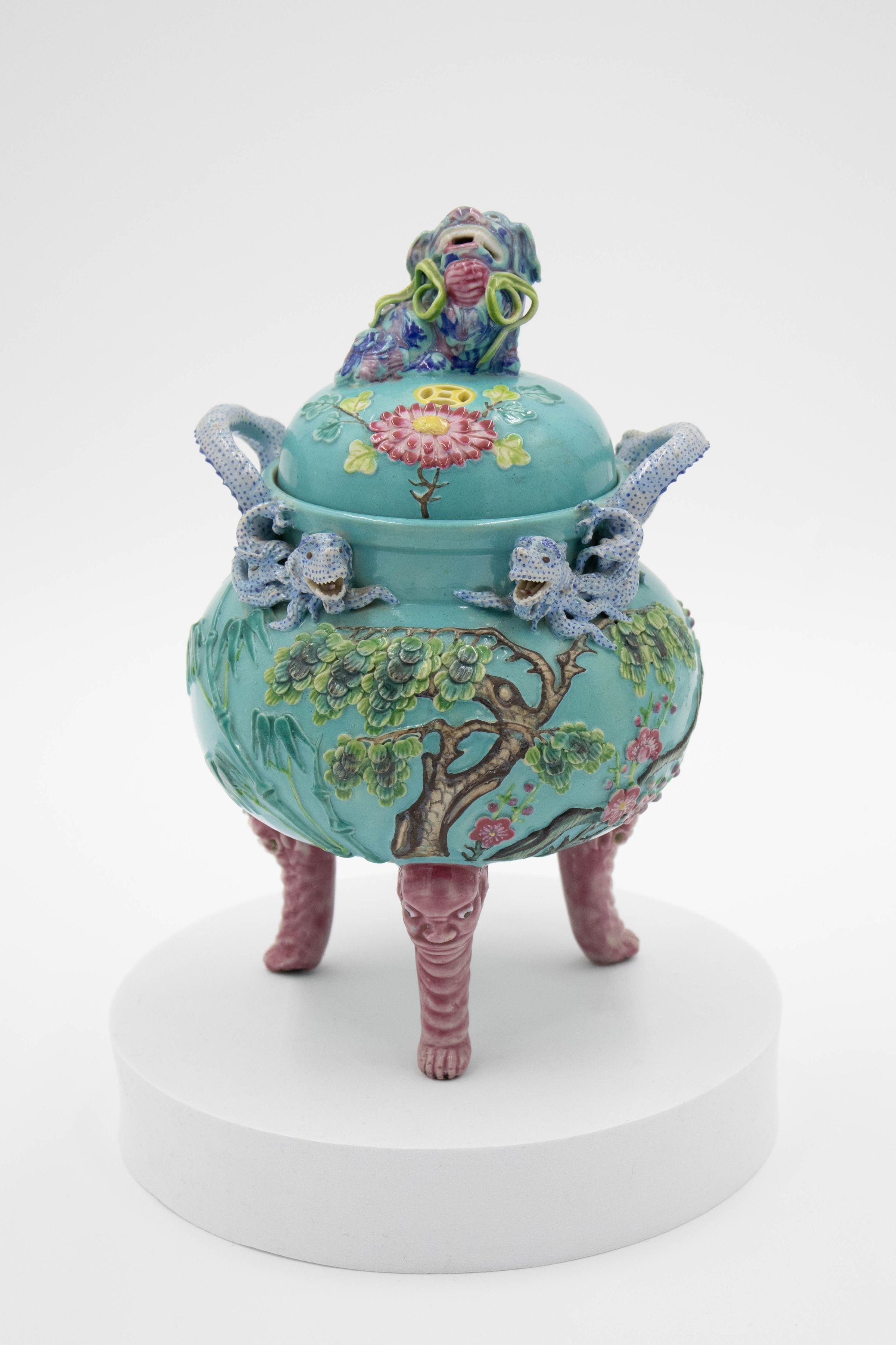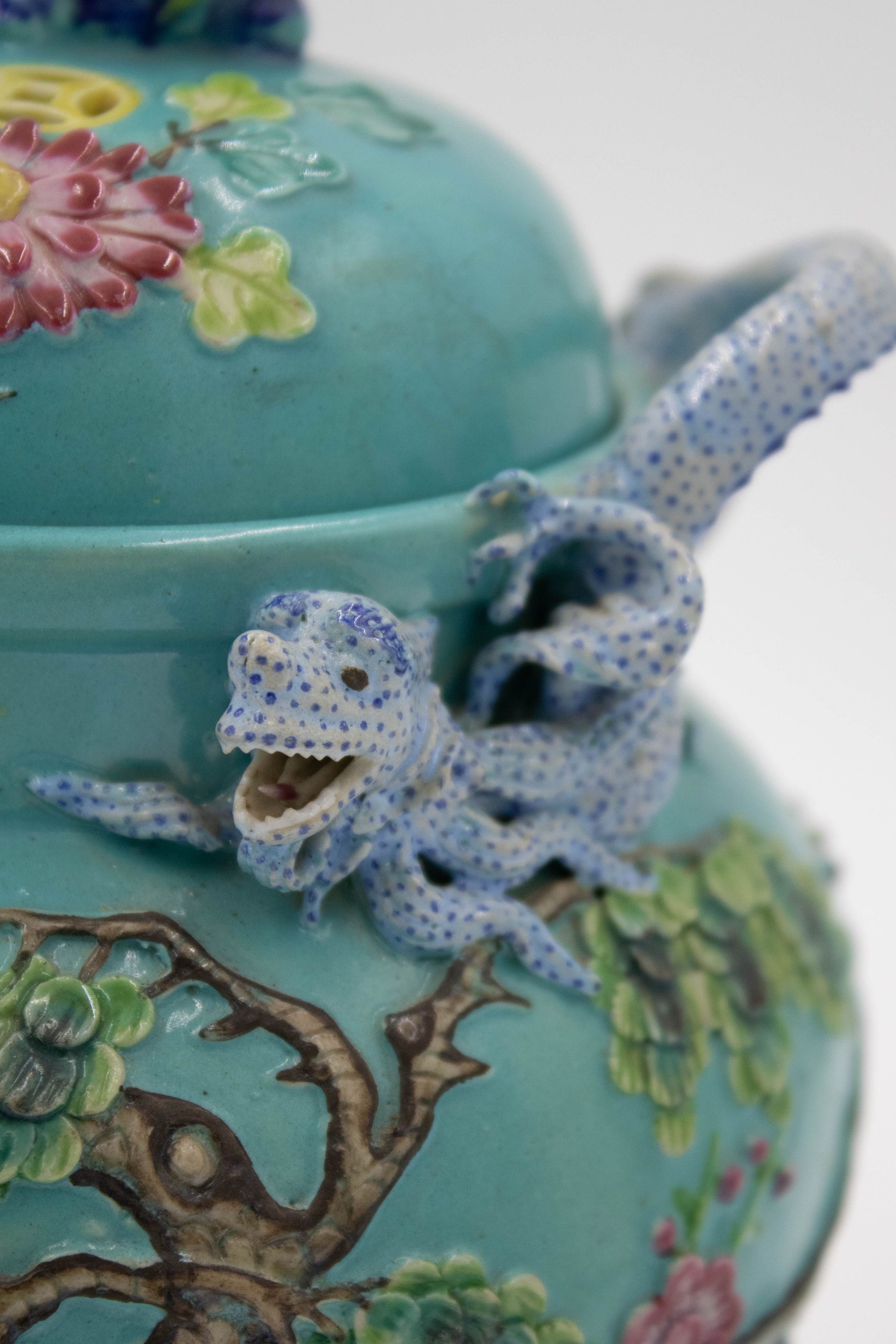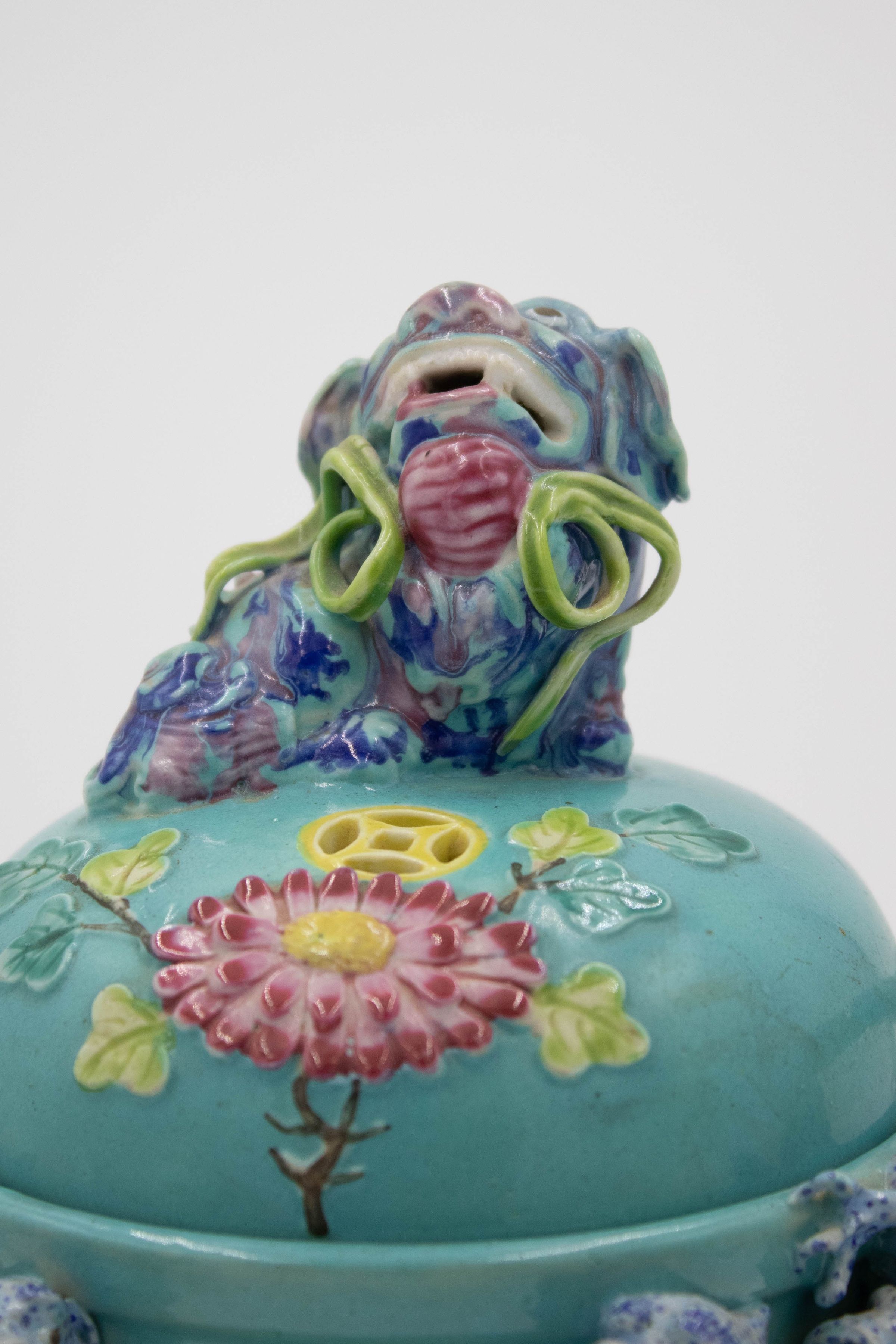 Turquoise Chinese footed incense burner decorated with a Chinese elm tree, pink lotus flowers, and blue dragons. The burner was made in Hong Kong.Context