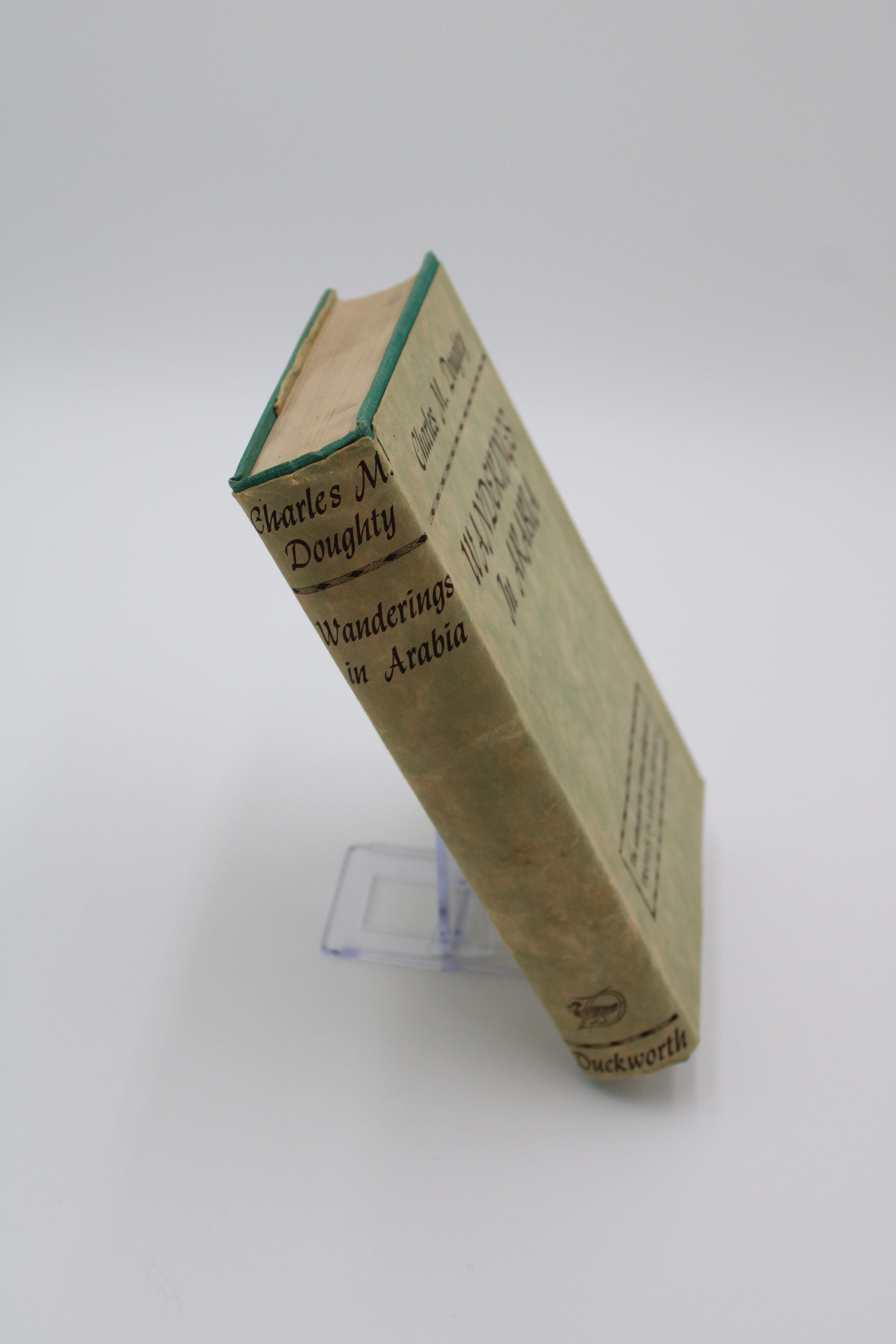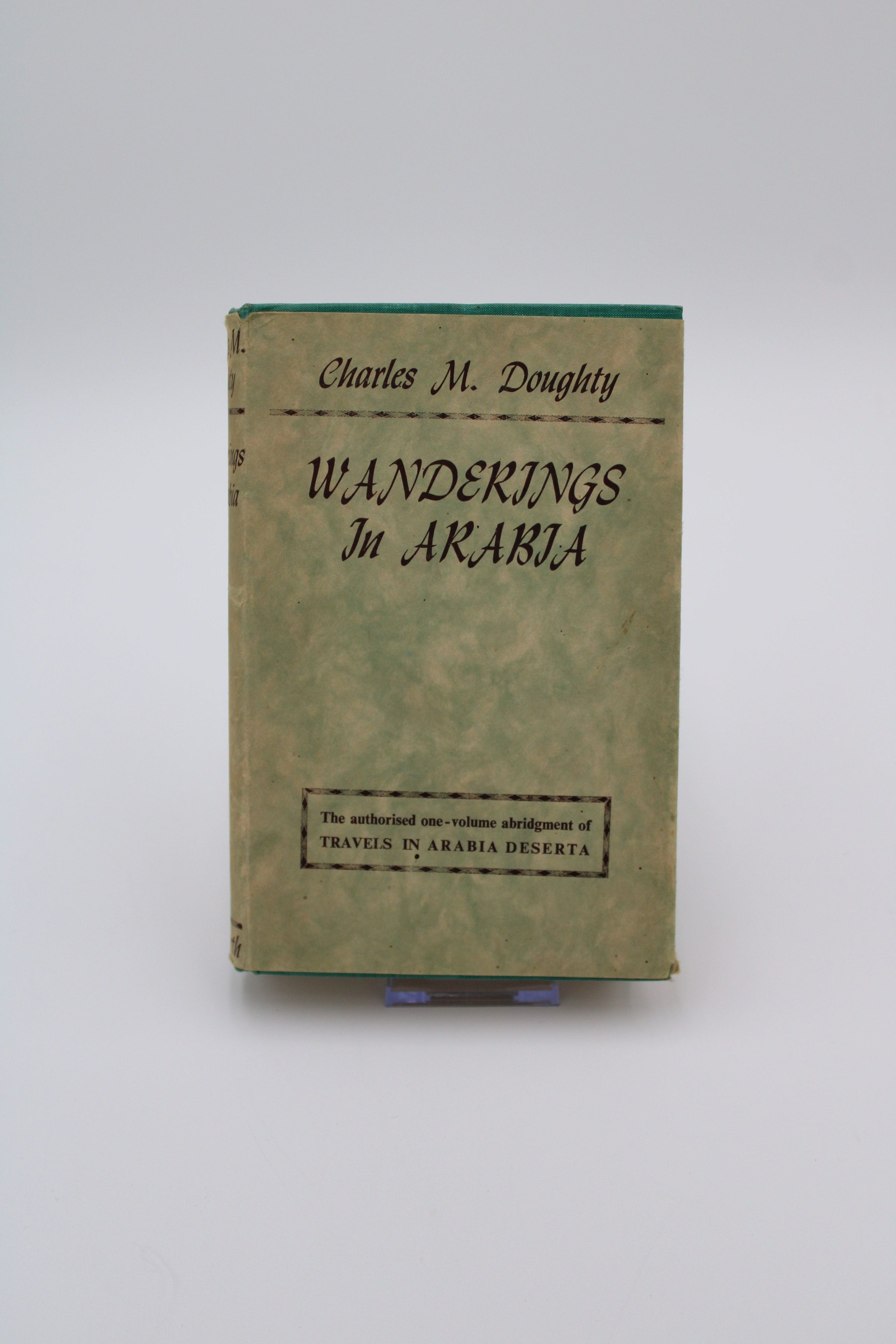 The cover is a patchy green color with brown text that reads the title and author, as well as "The authorized one-volume abridgment of TRAVELS IN ARABIA DESERTA."