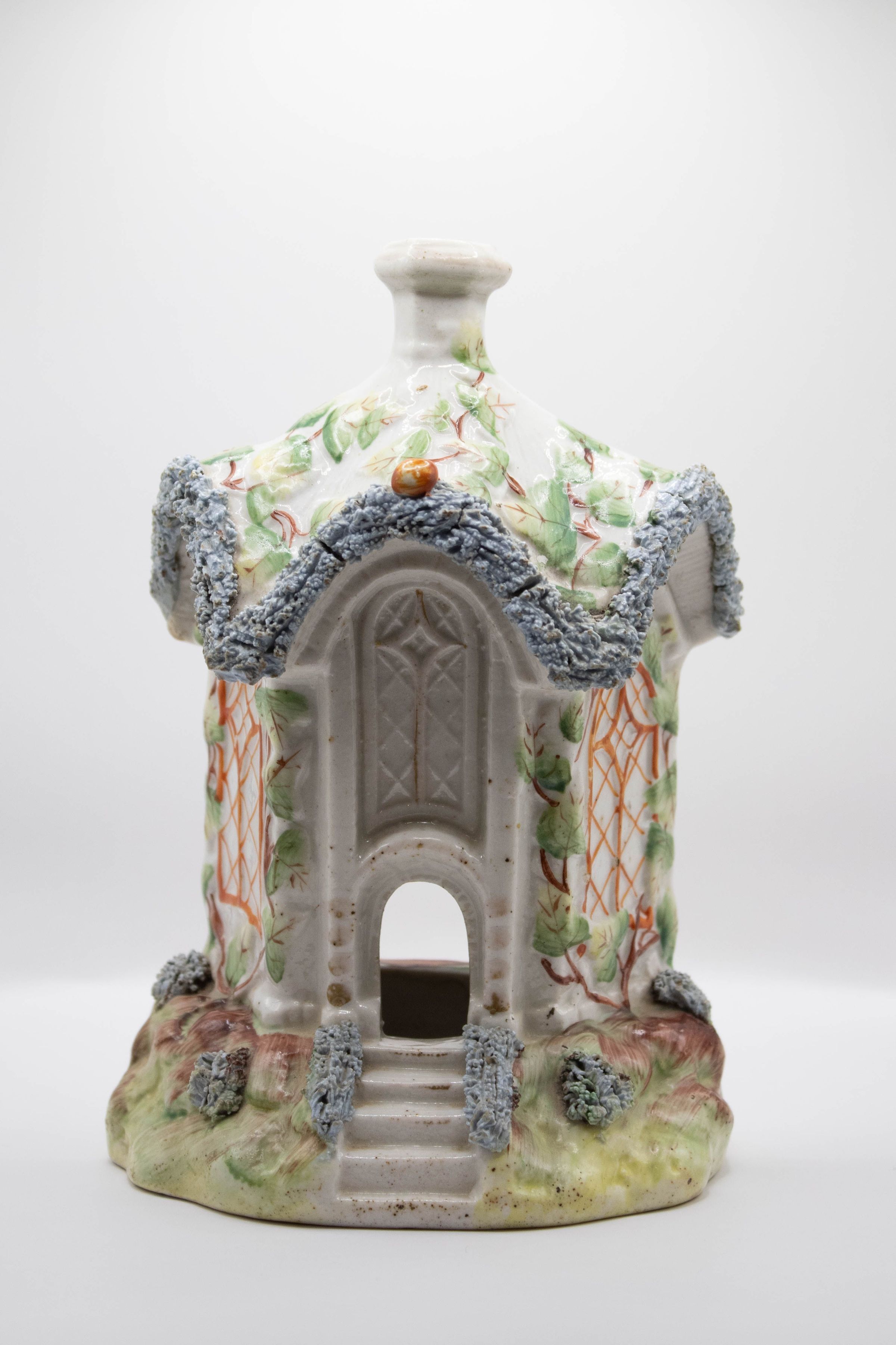 White ceramic gazebo painted with green ivy accents; Staffordshire Pottery gothic pastille burner c. 1830 English William IV period, modeled as a rustic Temple of Vesta.Context