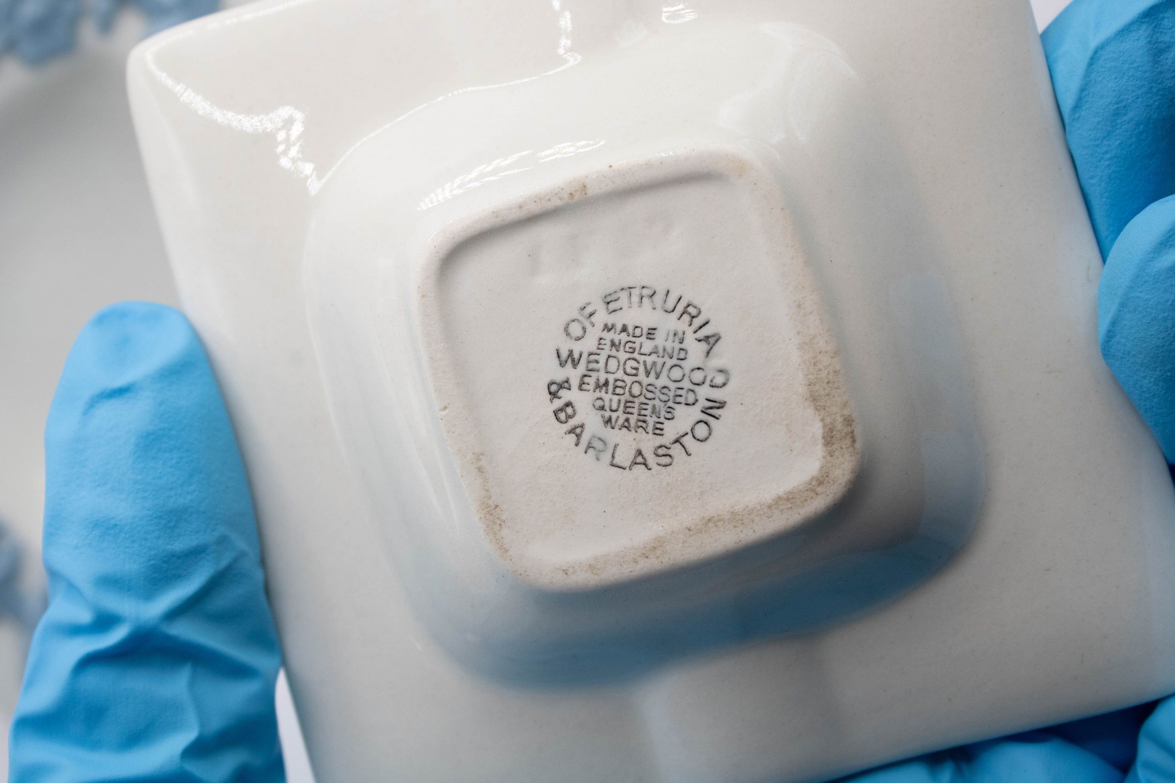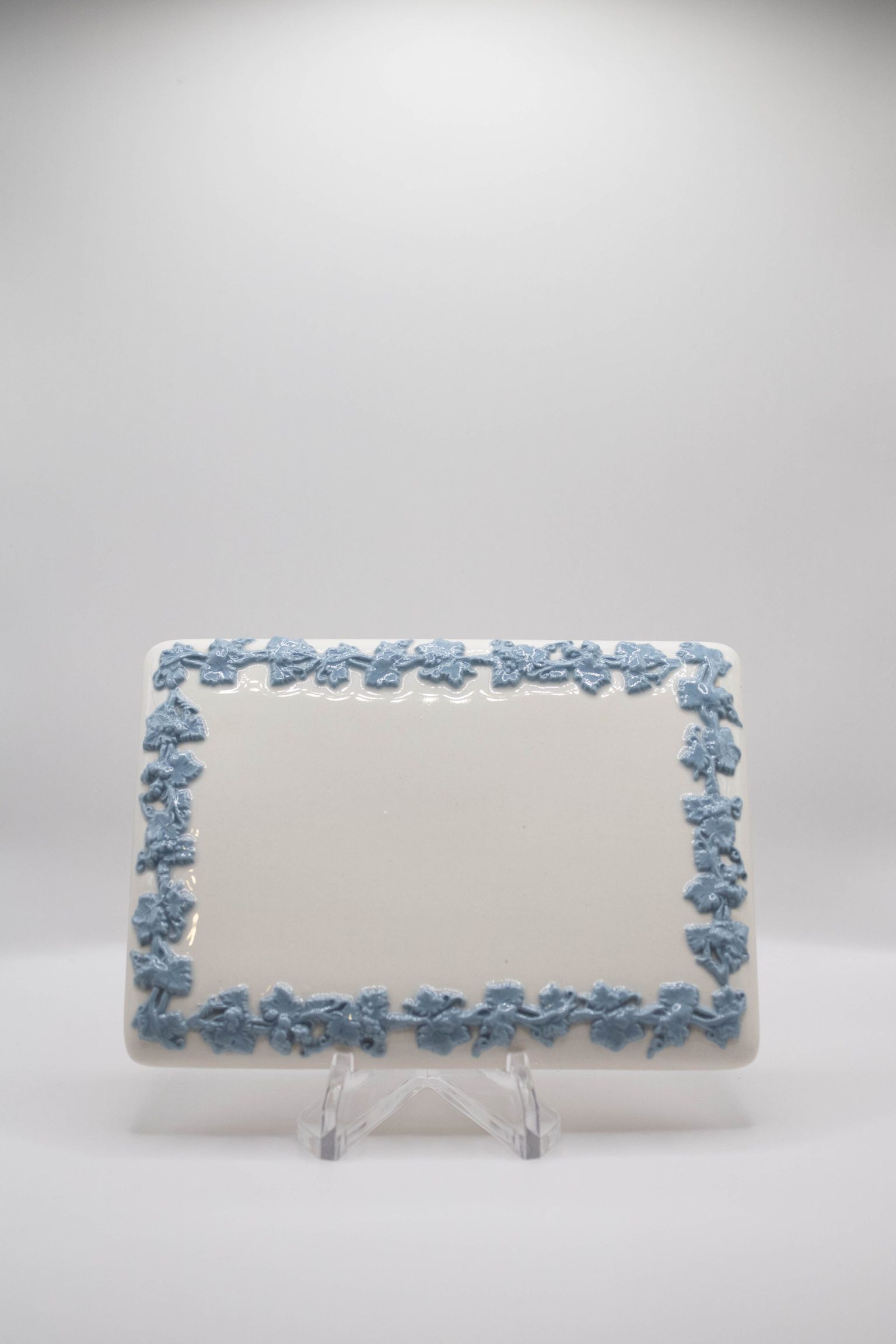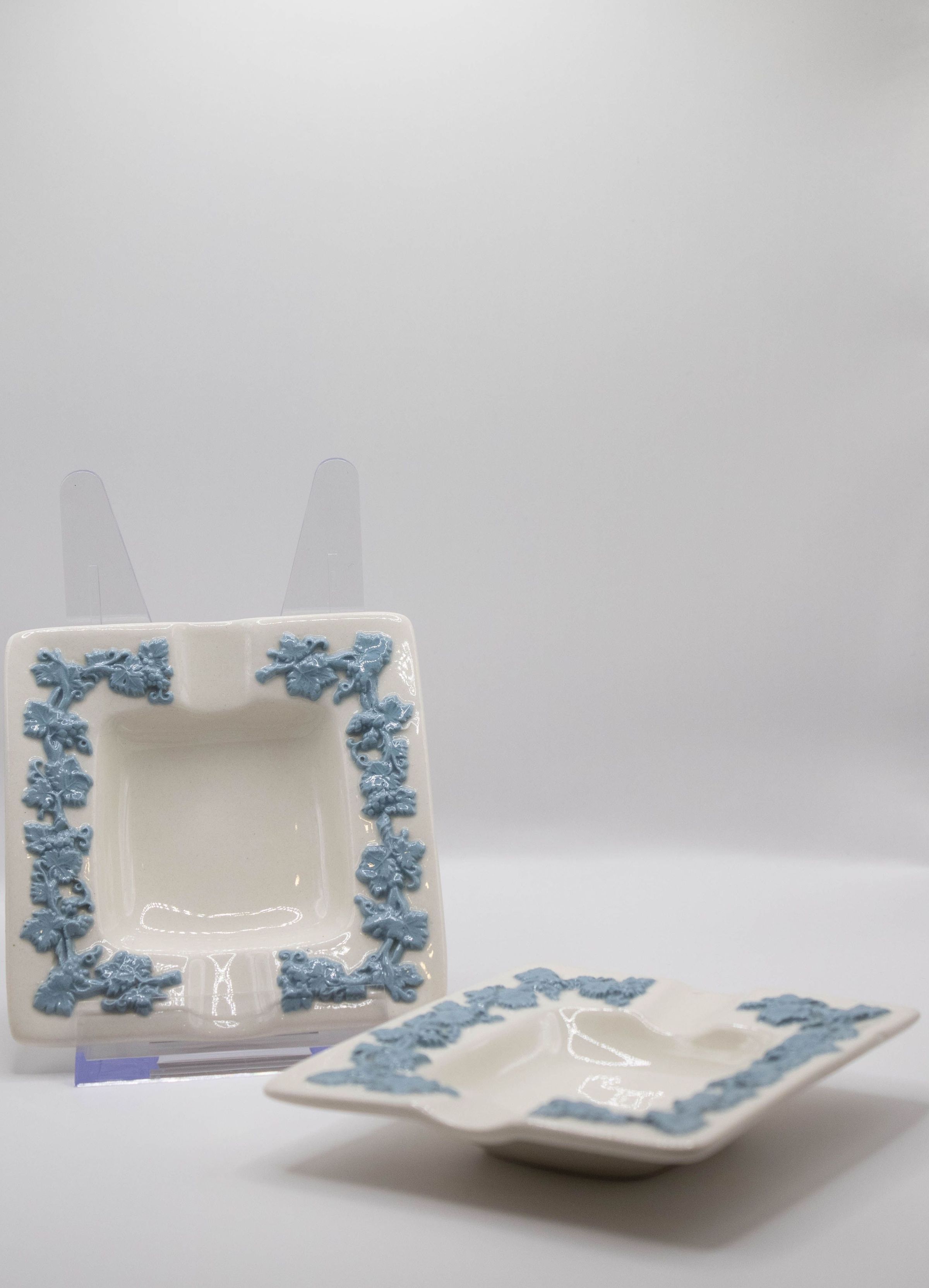 White square ashtrays with blue ivy detail on edges.Context