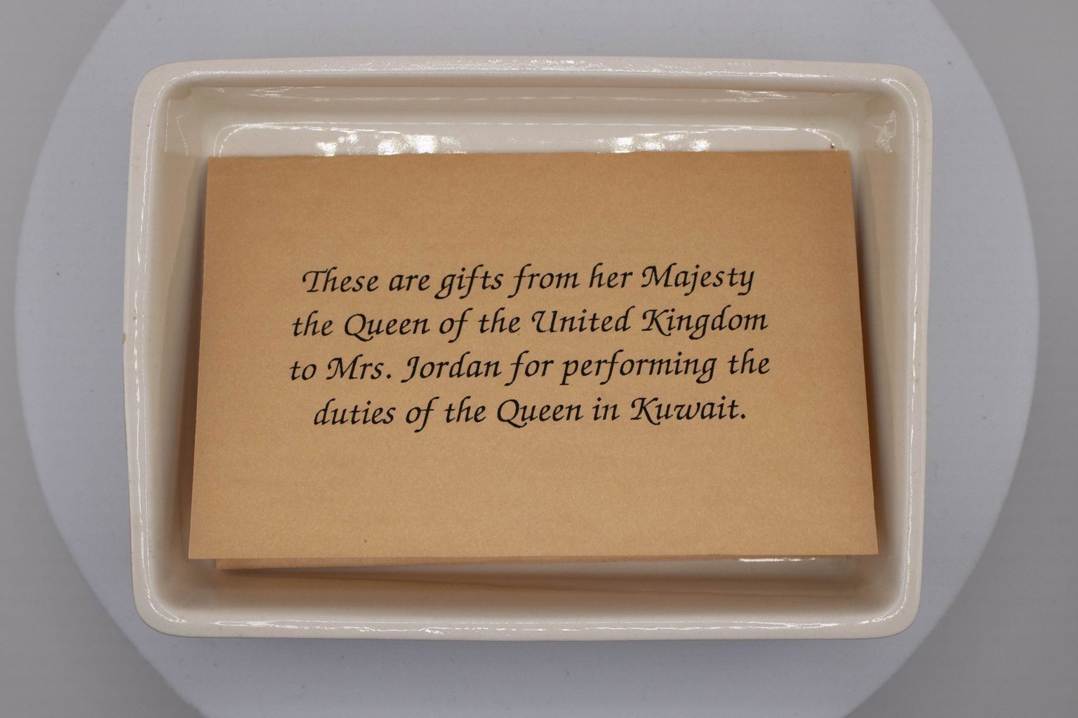 Card inside says these are gifts from Her Majesty the Queen of the United Kingdom to Mrs. Jordan for performing the duties of the Queen in Kuwait.Ethnography