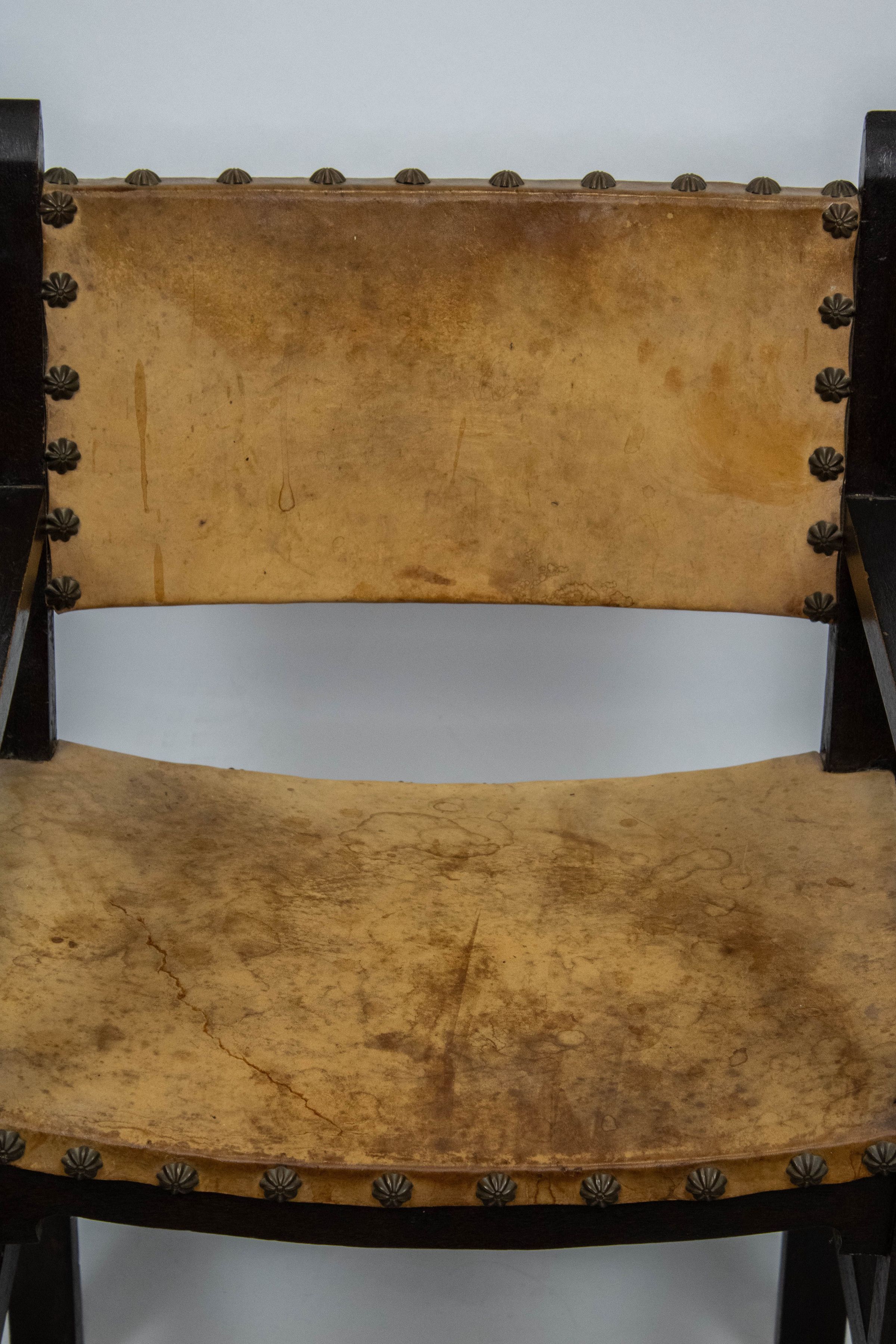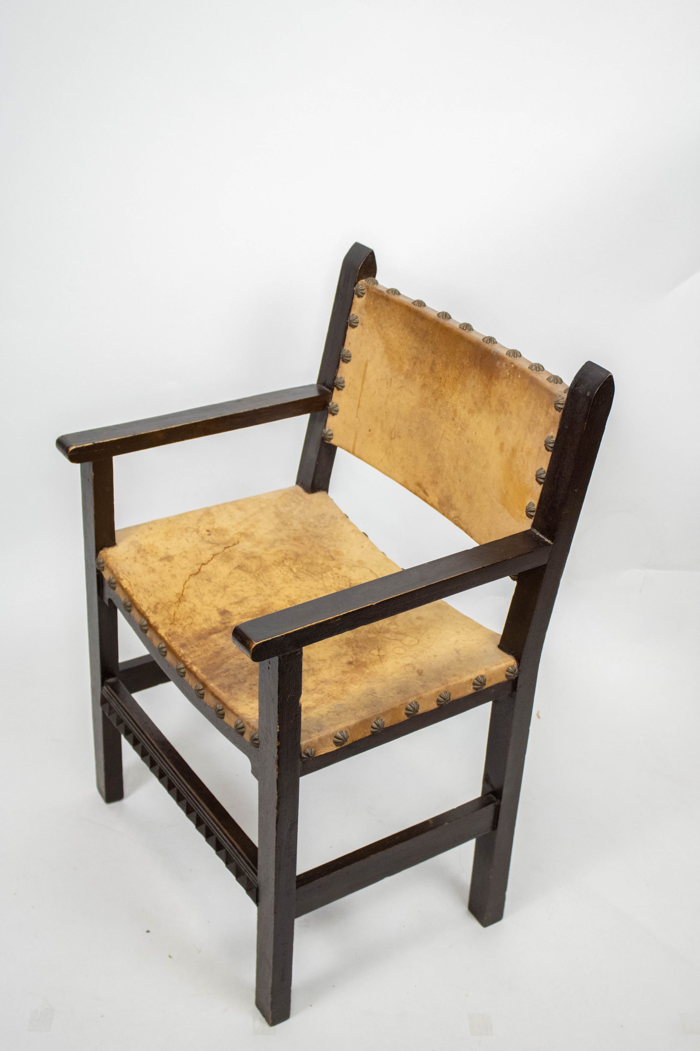 Wooden chair with leather seat and back.