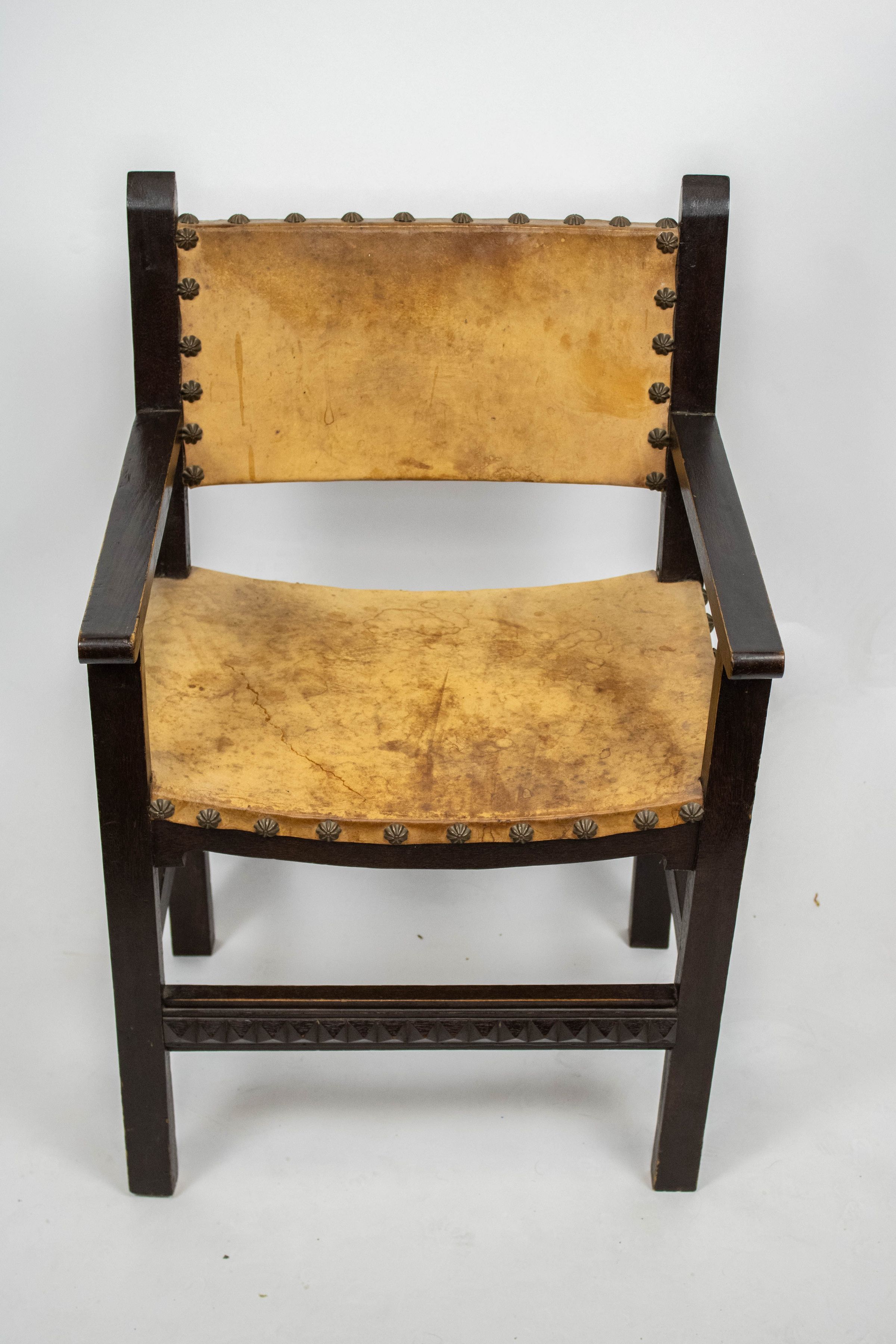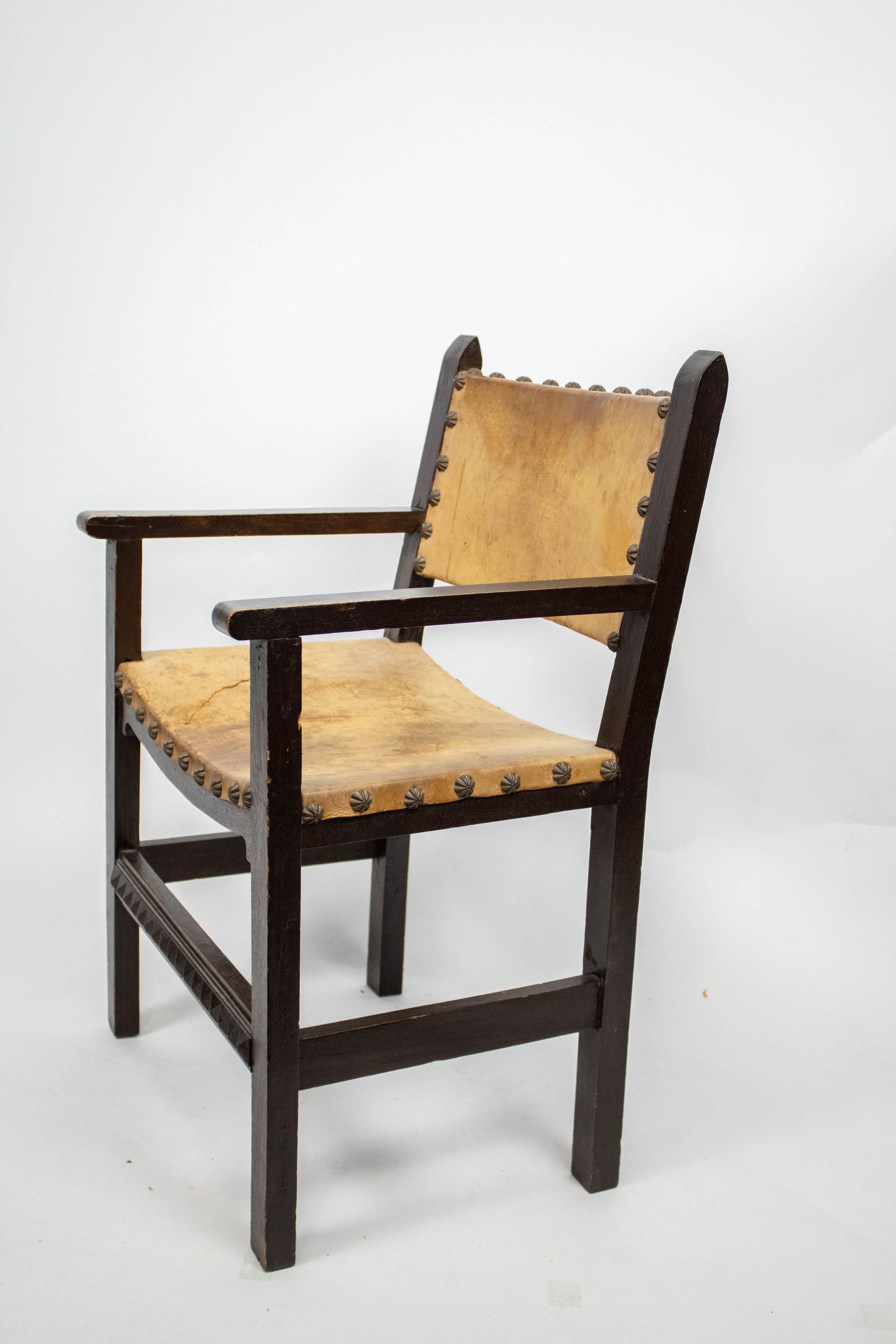 The image displays a wooden chair with a leather seat and back, featuring decorative metal studs.