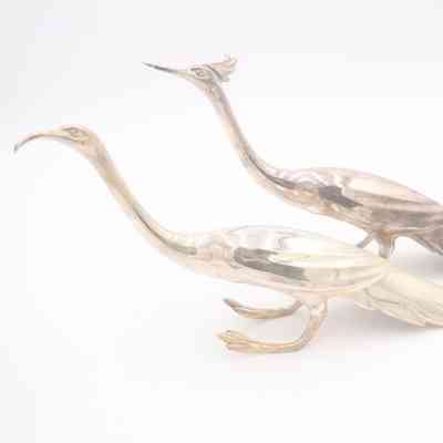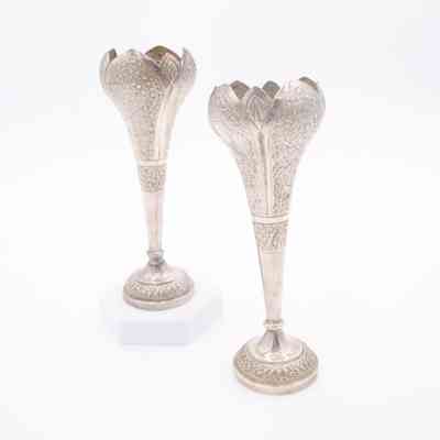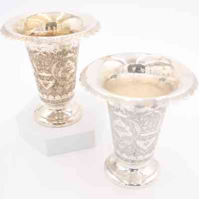 Brass Cachepots with Birds, Flowers, and People Etched on the Sides