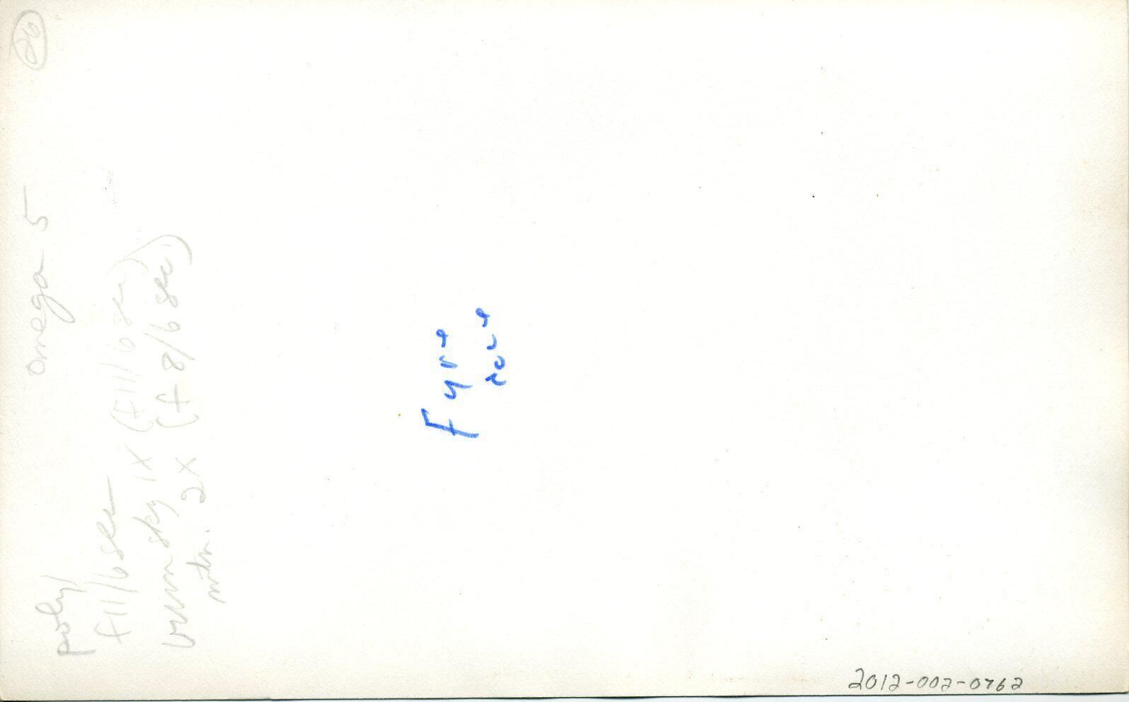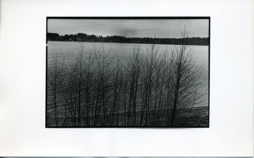Black and white photo of Frye Cove. The view is of water through a row of bare trees. In the foreground is a piece of land, and in the background is the far shore with hills, trees, and buildings. There is a white border on all sides with the side borders being larger. On the back in blue oink is "Fyre [sic] Cove" and in pencil is "poly omega 5 f 11/6 sec trim sky (f 11 6 sec) mtn 2 x (f 8/6 sec)".Made/Created