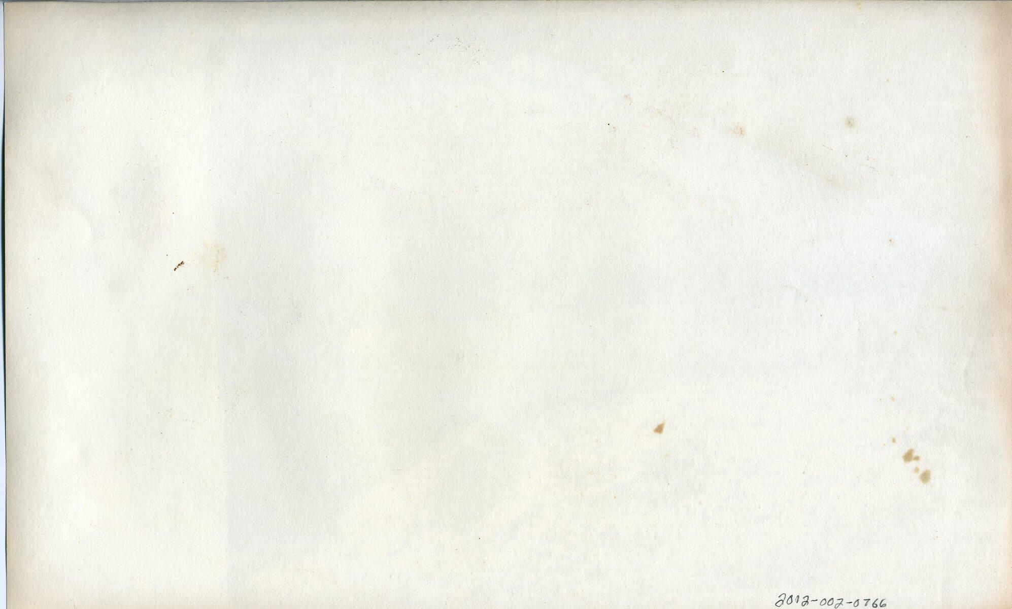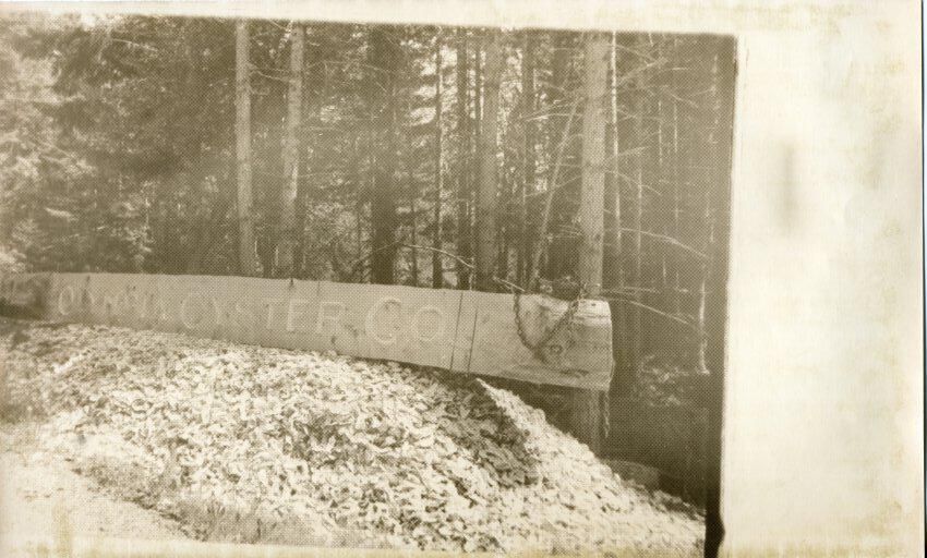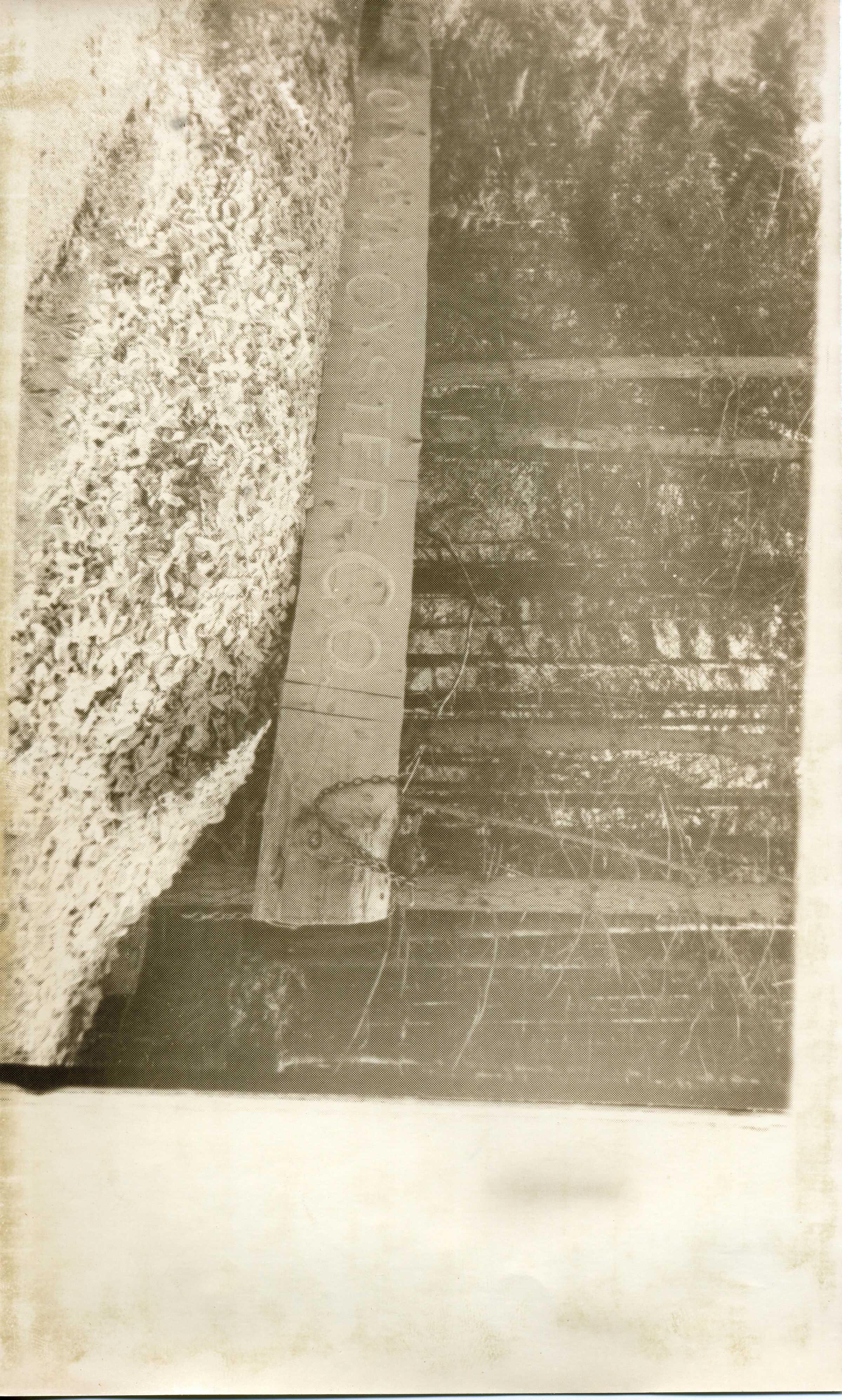 Black and white photo of a section of forest. The image is badly faded and printed crooked on the paper. In the foreground is what appears to be foliage on the shoulder of a road. Behind that is a large metal piece such as might be part of a guard rail. The metal is gray and on it in white letters is "Olympia Oyster Co". At the right end of the metal is a large chain draped down. Behind the metal is a thick stand of fir trees. There is a white border at the top and right side. There is no information on the back.Made/Created