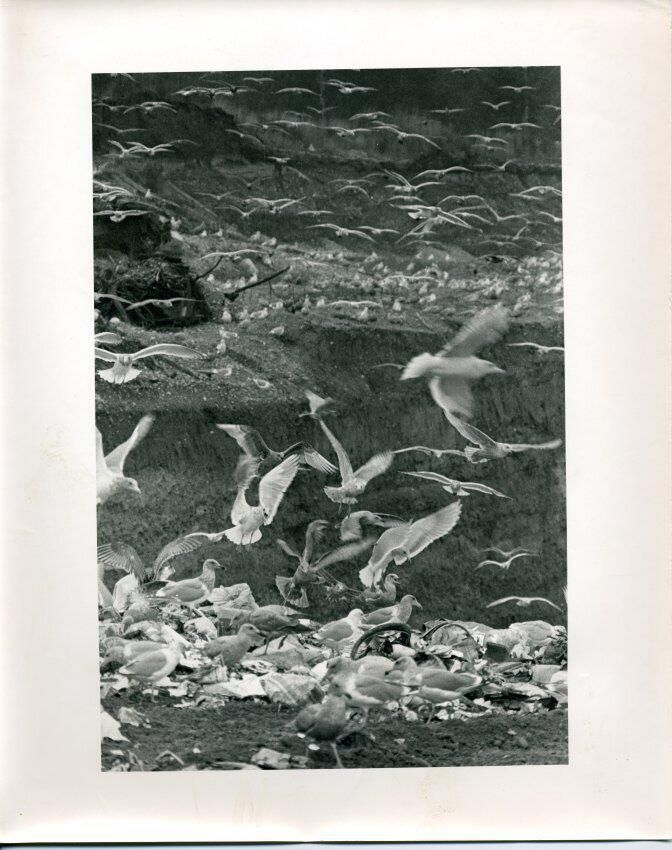 Black and white photo of Sea Gulls, some flying and some on the ground. The gulls may be at a land fill. There is a white border on all sides. There is no information on the back.Made/Created