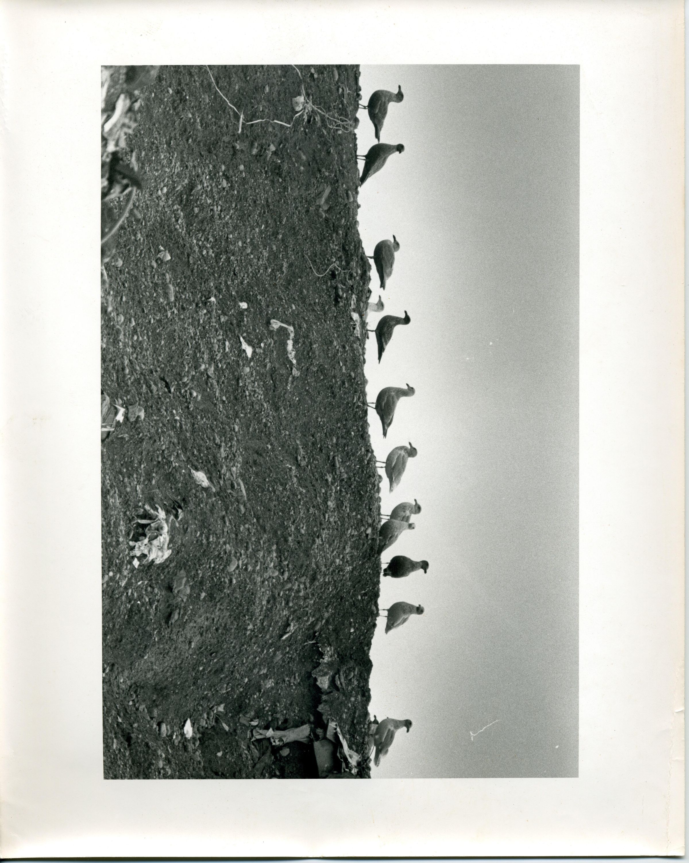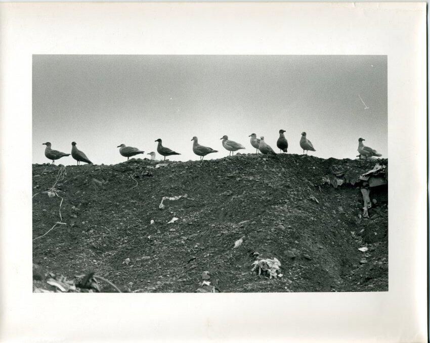 Black and white photo of gulls sitting on the ground at a land fill. The birds are all facing to the left, and there is various debris on the ground in the foreground. There is a white border on all sides. There is no information on the back.Made/Created