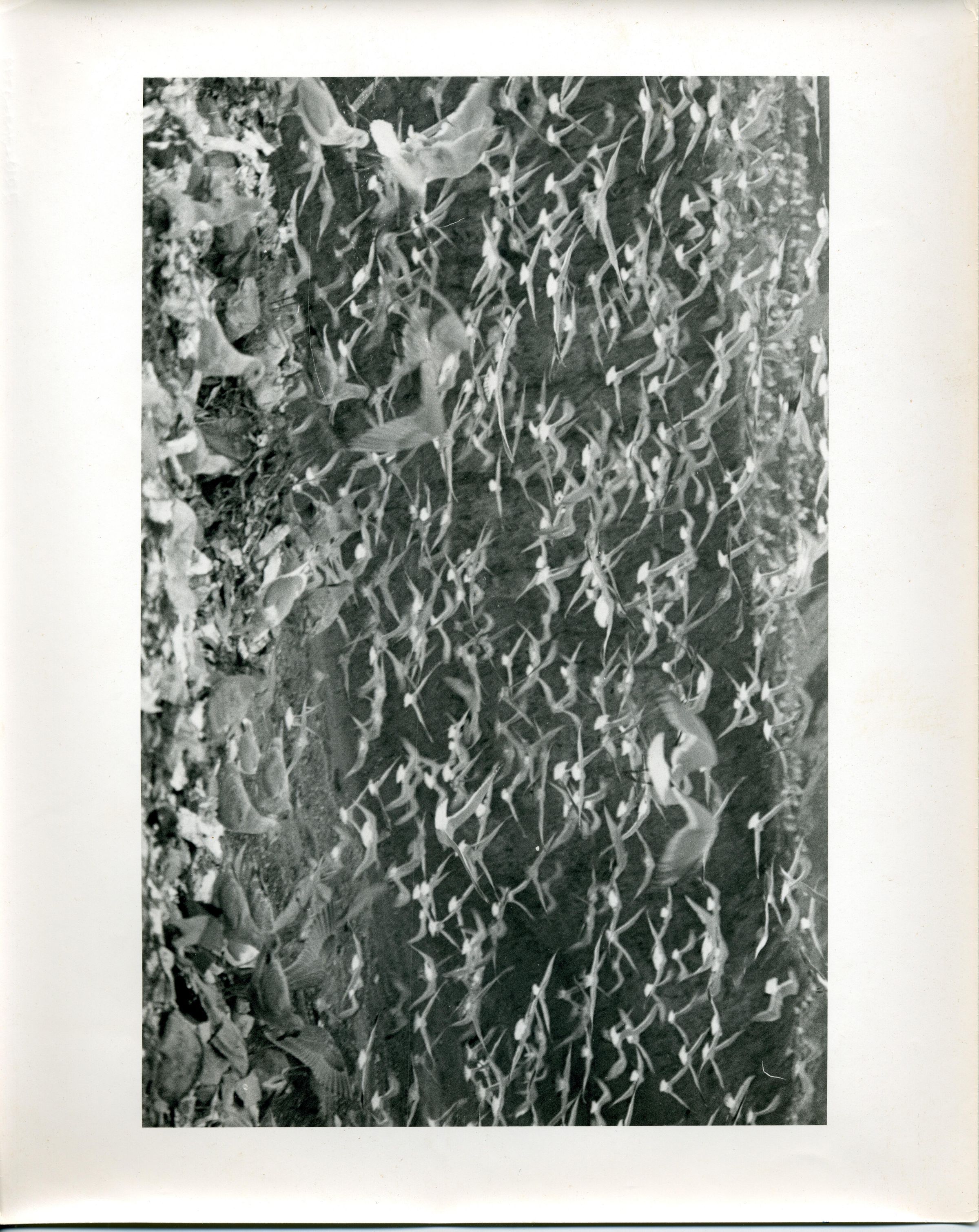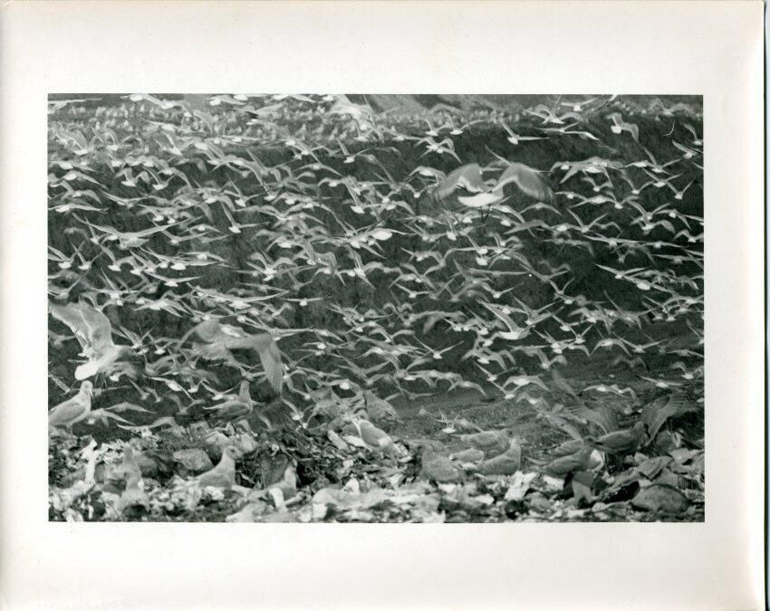 Black and white photo of gulls and other birds at a landfill. A few of the birds are on the ground but most are flying. There is some debris visible on the ground. There is a white border on all sides. There is no information on the back.Made/Created