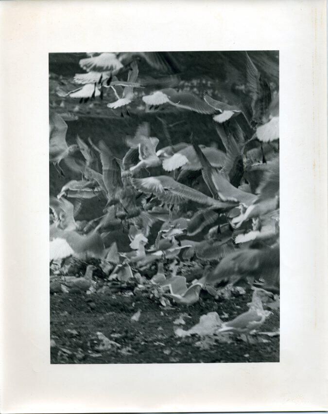 Black and white photo of a landfill. In the foreground is dirt and rocks. Some gulls are on the ground and above them are many more gulls hovering; their wings and tail feathers spread wide. There is a white border on all sides. There is no information on the back.Made/Created