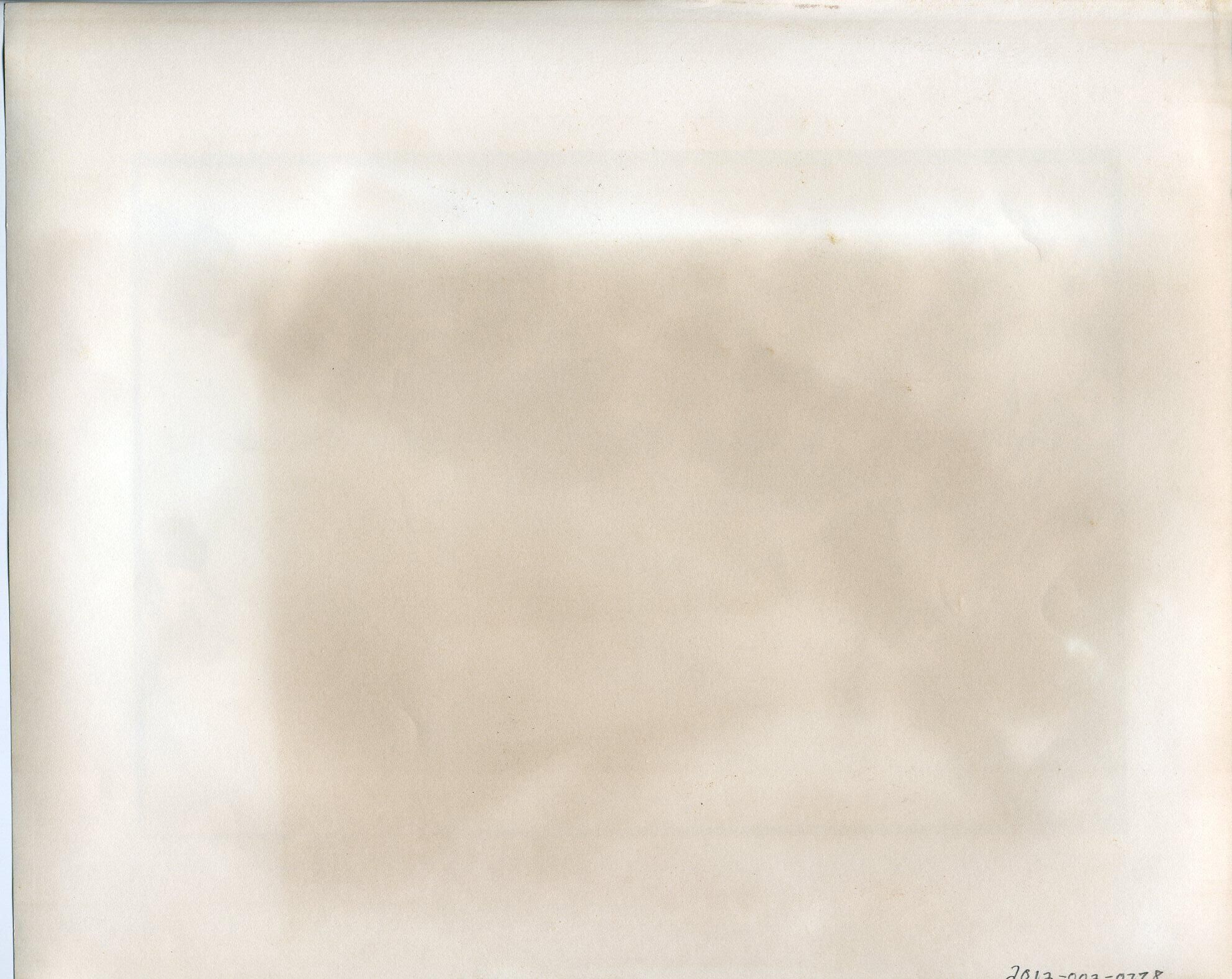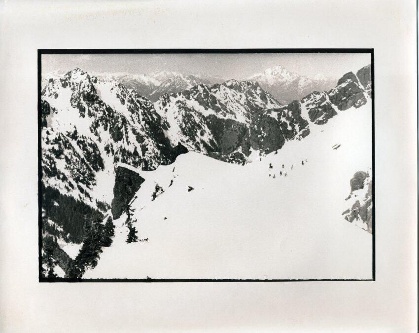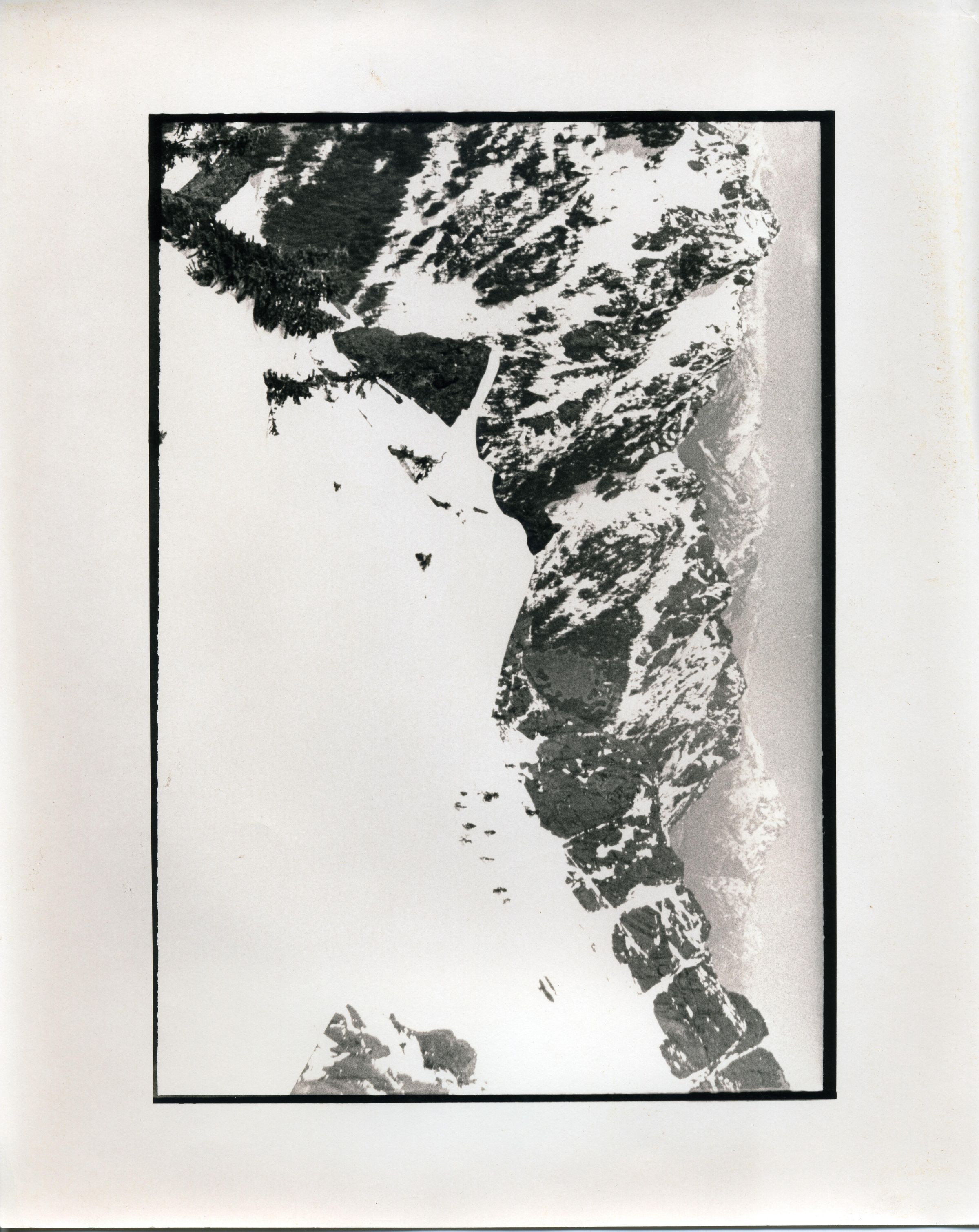 Black and white photo of mountains. The image appears to be an aerial photo of a snow-covered mountain slope with other snow-covered mountains in the background. In the white of the slope area is what appears to be individuals climbing up the slope. There is a thin black border around the image, and a large white border on all sides of the print. There is no information on the back.Made/Created