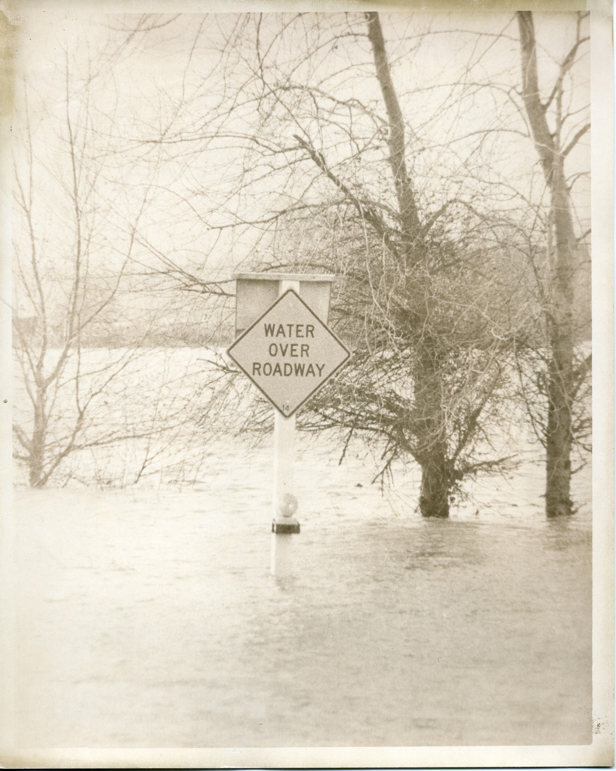 Black and white photo of a flooded area. The lower half of the photo is water with a dim image of low hills in the background. In the center of the image is a white post on which is a square sign at the diagonal that says "Water Over Roadway". The back of another sign is at the top of the post. Near the bottom of the post is what appears to be a flashing light. Bare trees are slightly behind the post. There is a white border on all sides. There is no information on the back.Made/Created