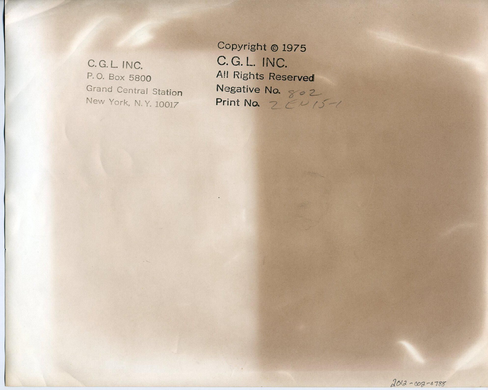Black and white photo of Stonehenge. It is not clear whether this is the monument in England or the one in Eastern Washington. In the foreground is what appears to be a grass field and in the middle distance are the stones of the monument. There is a white border on all sides. On the back in a black stamp is "C. G. L. inc. P. O. Box 5800 Grand Central Station New York, N. Y. 10017" and another stamp says "Copyright c 1975 C. G.. L, inc. All rights reserved Negative No. 802 Print No. zen 15-1". The negative and print numbers are written in pencil.Made/Created