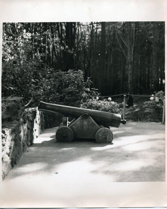 Black and white photo of a cannon. In the center of the image is an old cannon with its barrel pointed slightly up. The barrel is mounted on a support that appears to wooden triangles. At the ends of the support are solid wheels, probably wooden. The wheels are sunk slightly in the surface, suggesting that it is dirt or gravel. At the left is a stone wall with lower openings where a chain crosses. The chain continues in the middle background suspended by metal posts. Behind the cannon are shrubs, possibly Rhododendrons. Behind those are trees. There is a large white border at the top and bottom and a small white border on the sides. On the back in red ink is "100%".