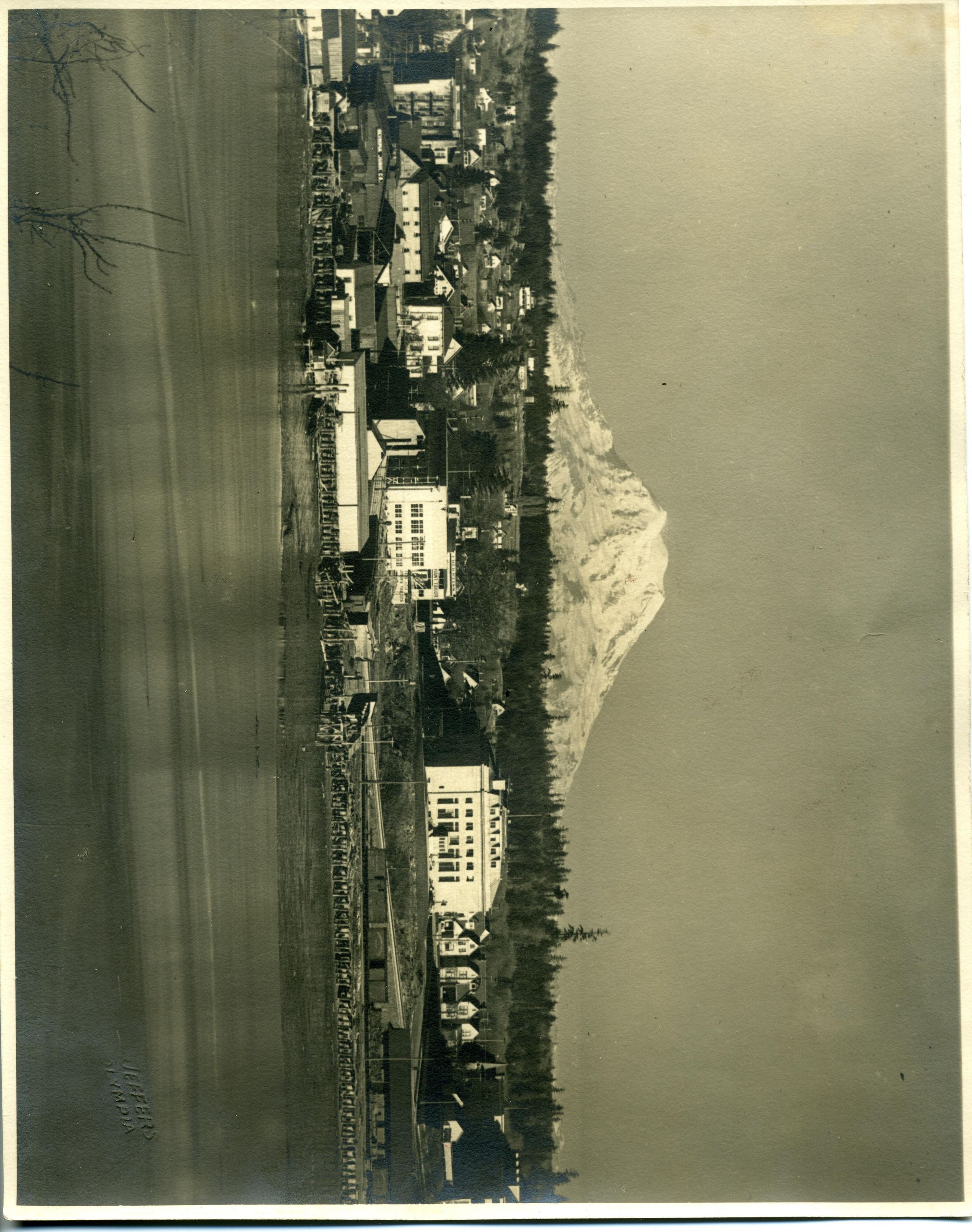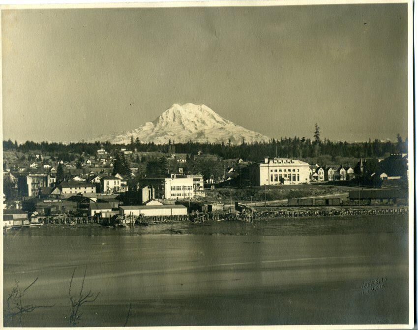 Black and white photo of Mount Rainier over water and buildings. The water is in the foreground and on the far side of the water are the structures of a waterfront with piers, commercial buildings, office buildings railroad cars, and streets and utility poles. Beyond that are houses and trees. The mountain is in the center background. It is completely covered in snow. The sky around it is clear. There is a white border on all sides. There is no information on the back.Made/Created
