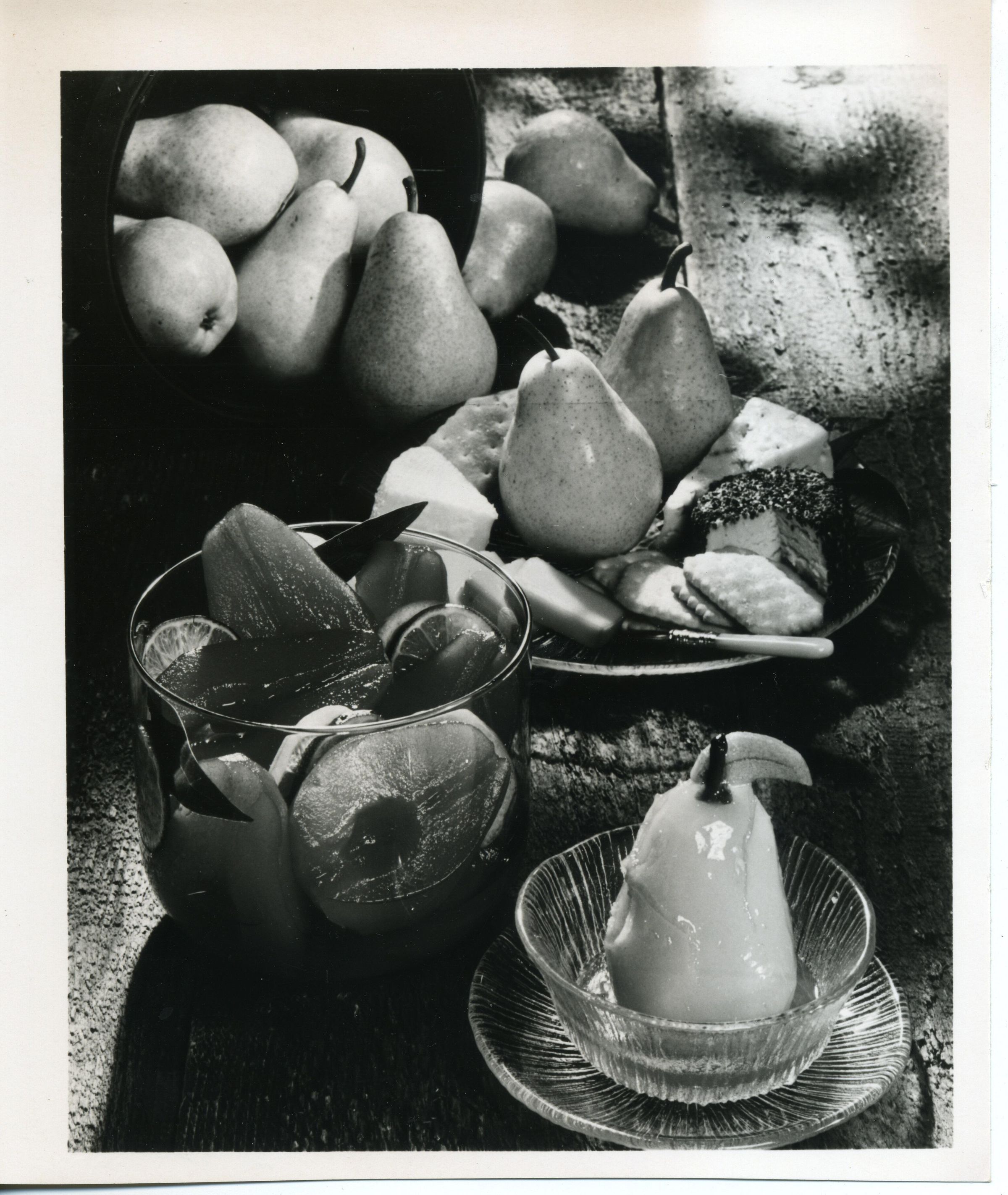 Black and white photo of fruit in dishes. At the bottom of the image is what seems to be a pear that has been coated with a shiny substance. It has a simulated leaf near the top and a black object in the center of the top. The pear is inside a glass dish that is on a glass saucer. Next are various fruits that have been sliced inside a glass dish. Next is a plate containing two pears, slices of cheese, and crackers as well as a serving utensil. Near the top of the image are pears in a dark colored bowl that is tipped on its side. and other pears that are loose. All these items are on a rough surfaced plastic sheet, and a part of the sheet is curled at the upper right. There is a white border on all sides. On the back in black ink is "100%".