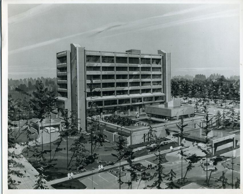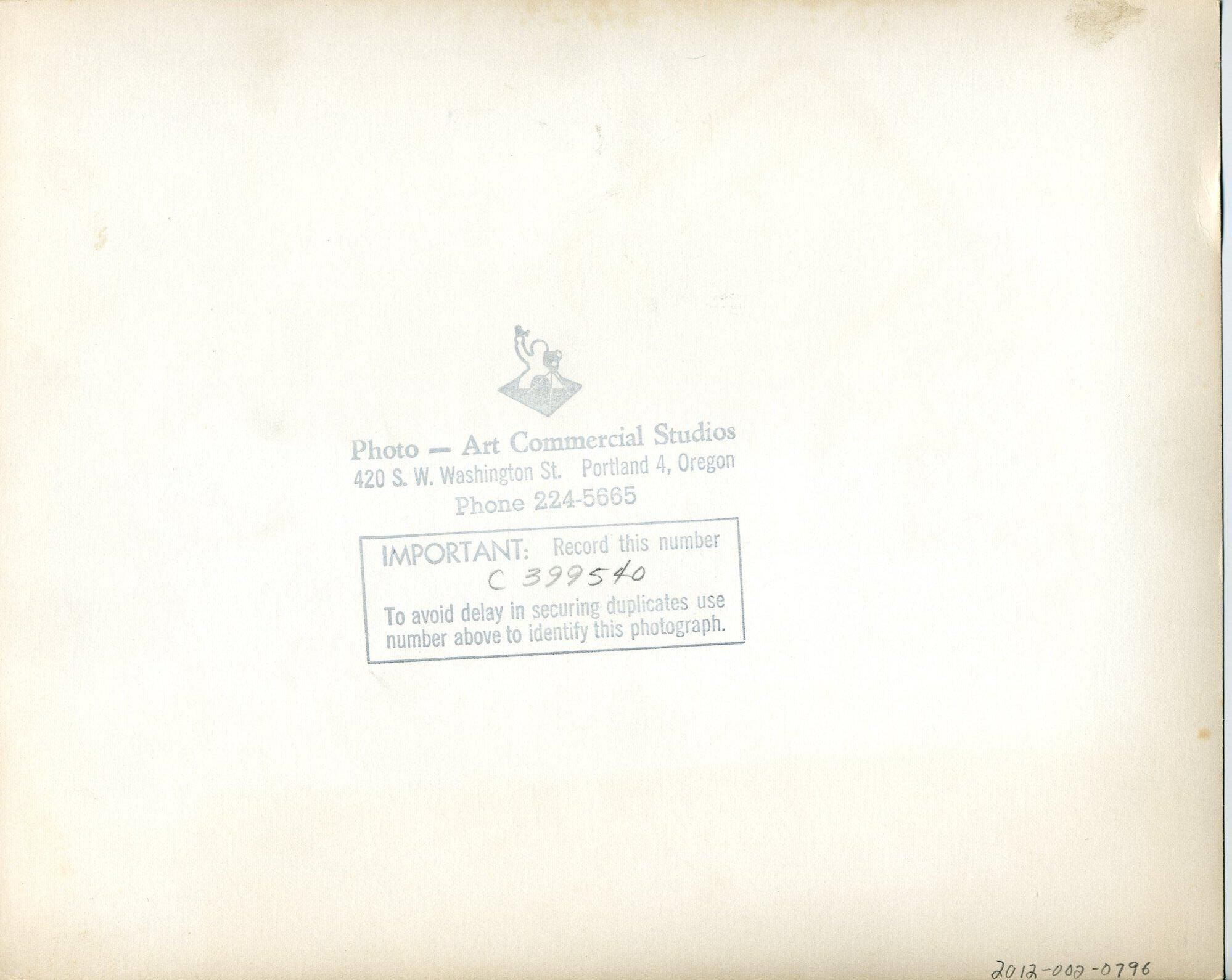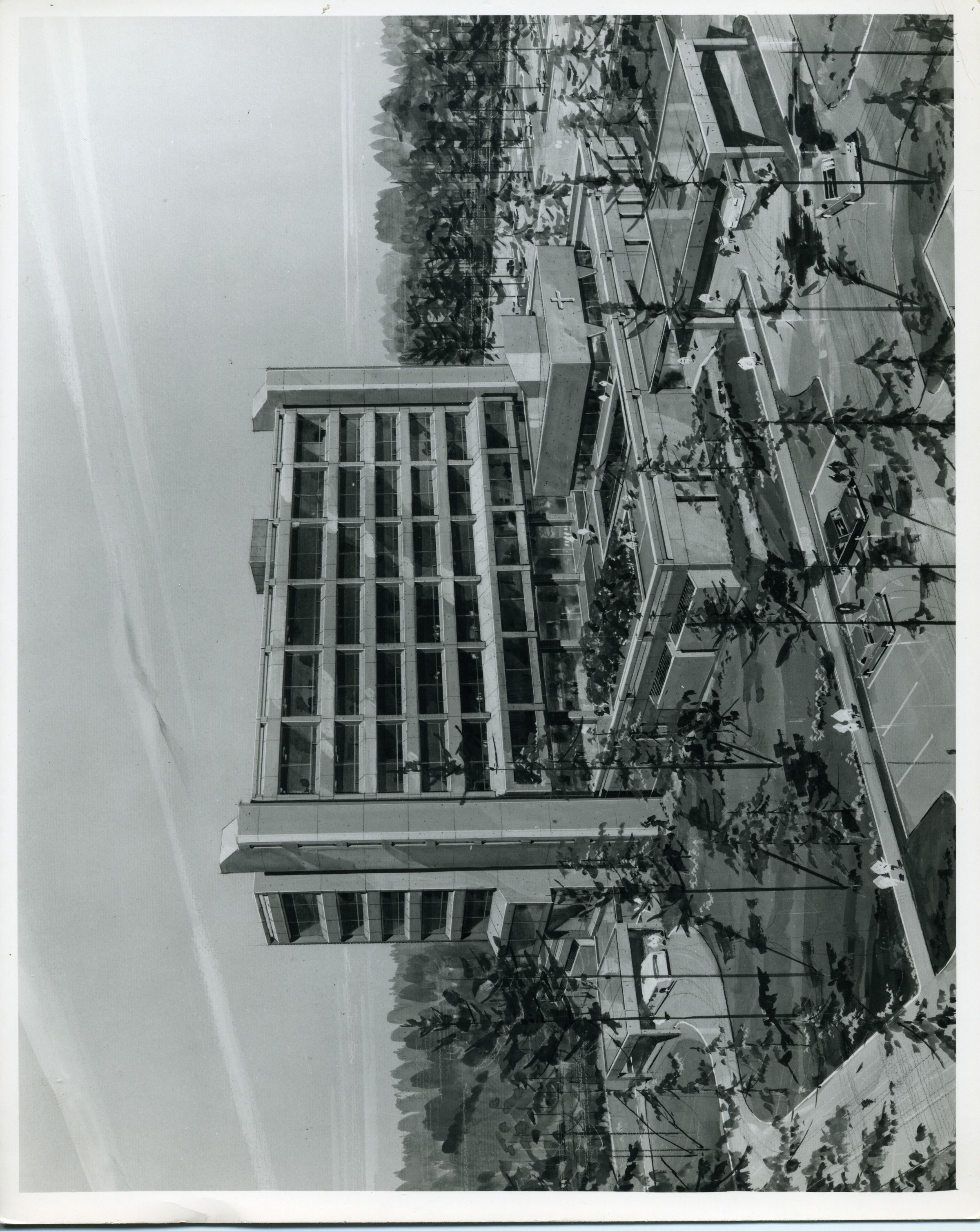 Black and white photo of a drawing of a building. The building seems to be a hospital. In the center of the print is an eight-story structure with solid walls at the corners and rows of windows in between. Attached to the structure and extending to the lower right corner of the print is a one-story building with solid walls and various shapes on its roof, including some trees. This same structure has a raised portion with windows and a cross emblem. Extending further is a covered entrance with a driveway and vehicles. Scattered throughout the drawing are trees, vehicles, sidewalks, and figures that appear to be wearing nun's habits. There are more trees in the background. There is a white border on all sides. On the back is a stamp that has an icon at the top featuring a figure and a camera on a tripod. The stamp says "Photo -- Art Commercial Studios 420 S. W. Washington St. Portland 4, Oregon Phone 224-5665" Inside a box is "Important: Record this number C 399540 [in pencil] To avoid delay in securing duplicates use number above to identify this photograph.".Made/Created
