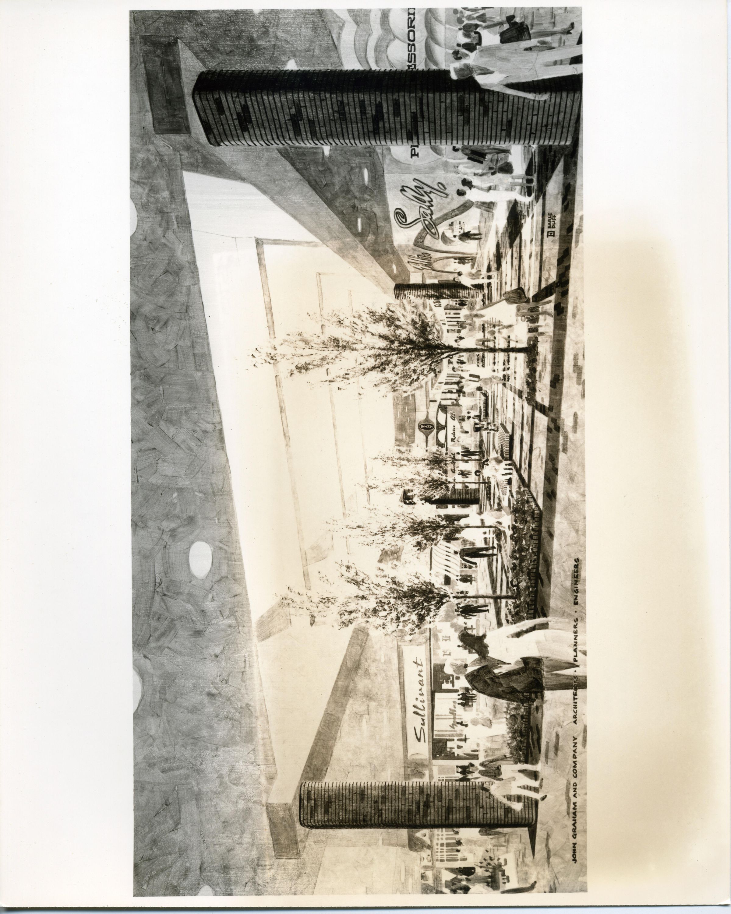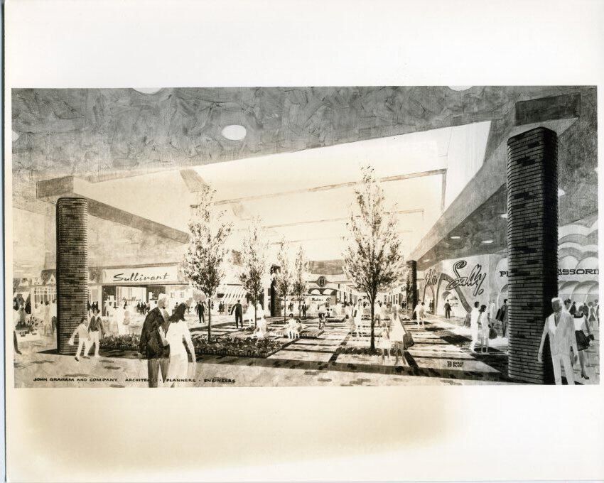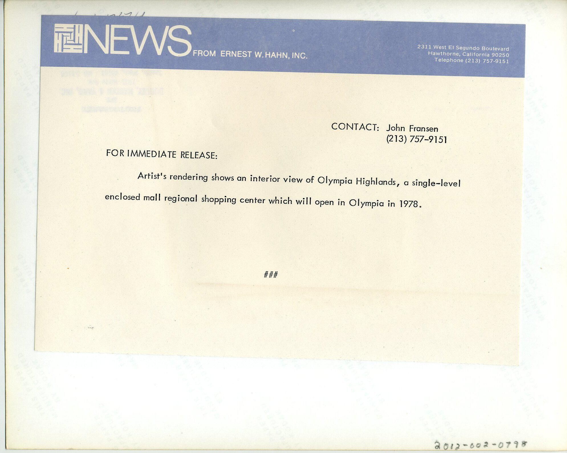 B;lack and white photo of a drawing of the future Olympia Highlands (Capital Mall). The drawing shows several one-story buildings, with trees, people, and cars. On one of the buildings is the name "Sullivant". On another is "Sally". Printed at the bottom of the drawing is "John graham and Company, Architects, Planners, engineers". There is a wide border at the top and bottom and a smaller border on the sides. On the back is a pasted-on paper with a heading that says "NEWS from Ernest W. Hahn, Inc. 2311 West El Segundo Boulevard Hawthorne, California 90250 Telephone (213) 757-9151". Typed on the paper is "For immediate release: Contact John Fronsen (213) 757-9151 Artist's rendering shows an interior view of Olympia Highlands, a single-level enclosed mall regional shopping center with will open in Olympia in 1978".Made/Created