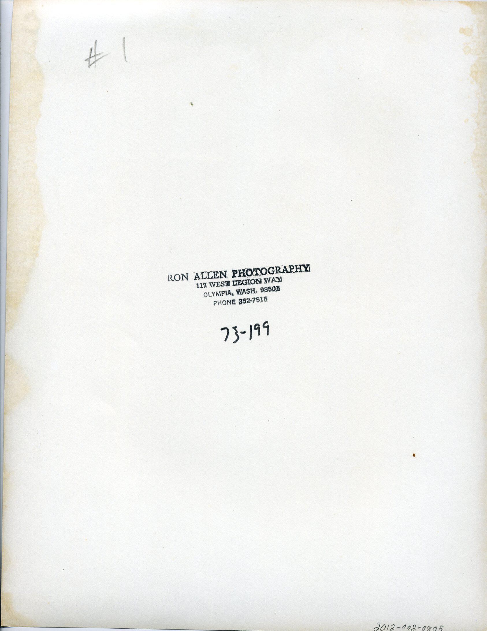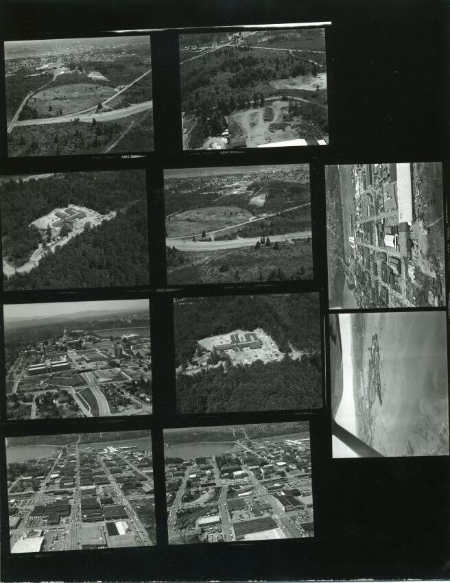 Black and white image of 10 aerial photos. The images are all approximately 2.25" by 2.75". There are eight in two columns on the left of the print and two more turned on their sides on the right. Beginning at the upper left and going down the column, the images are (1) a roadway with open land with a city in the background, (2) what appears to be a building in the midst of a forest, (3) Olympia's capitol grounds with the legislative building visible, (4) Olympia's downtown with parts of Budd Inlet and Capital Lake visible along with the Fourth and Fifth Avenue bridges leading to the west side, (5) a building and cleared land at the bottom, undeveloped land, and a road intersection at the top, (6) a section of a freeway with a city in the background, (7) a building on cleared ground in the midst of a forest, (8) Olympia's downtown with the Fourth and Fifth Avenue bridges visible, (9) Olympia's downtown with the Fourth and Fifth Avenue bridges visible, (10) Budd Inlet and the Port Peninsula visible. On the back is a stamp in black ink that says "Ron Allen Photography 117 West Legion Way Olympia, Wash. 98501 Phone 352-7515". In ink is "73-199".Made/Created