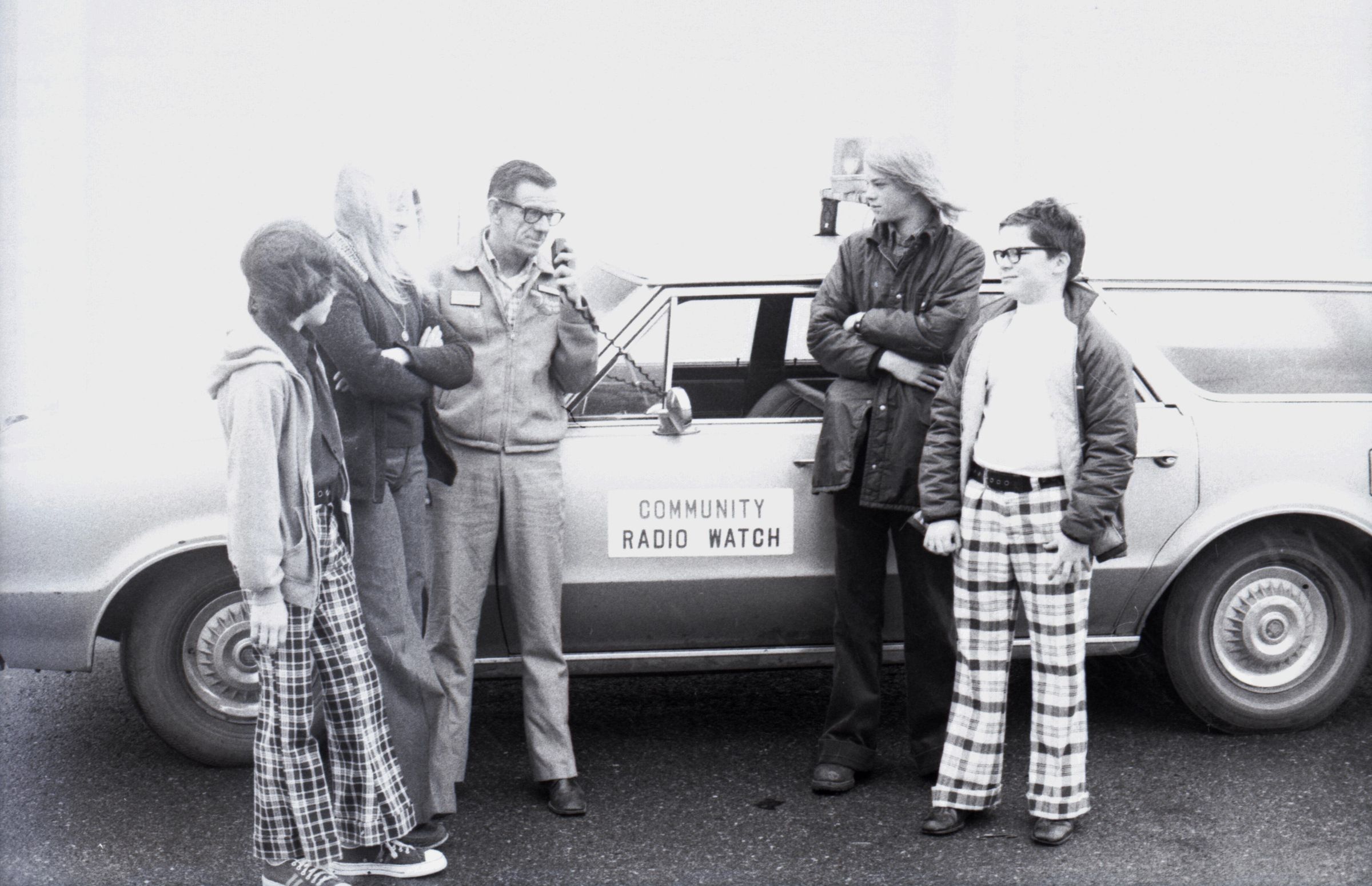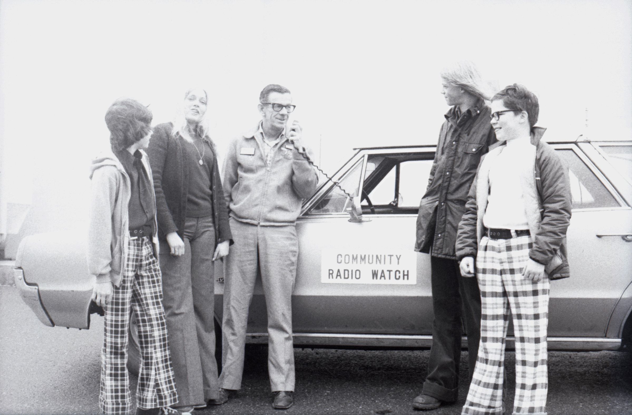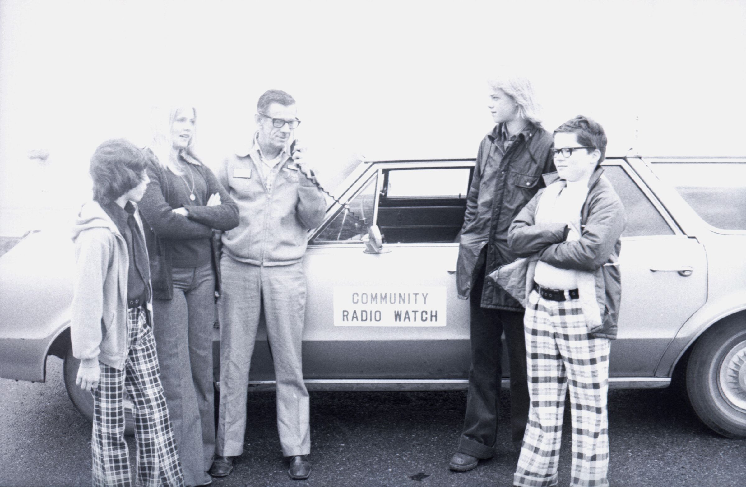 Diabetic Children, Unknown Date. These two black and white film negative strips were created for the Lacey Leader newspaper. These images show two boys, two young women and a man with glasses standing outside of a car. The car has a sign on the driver's side door which reads "COMMUNITY RADIO WATCH." The man has a CB radio microphone in his hand, and the microphone is attached to a cord running into the open driver's door window. Ken Balsley believed these images were related to the American Diabetes Association.