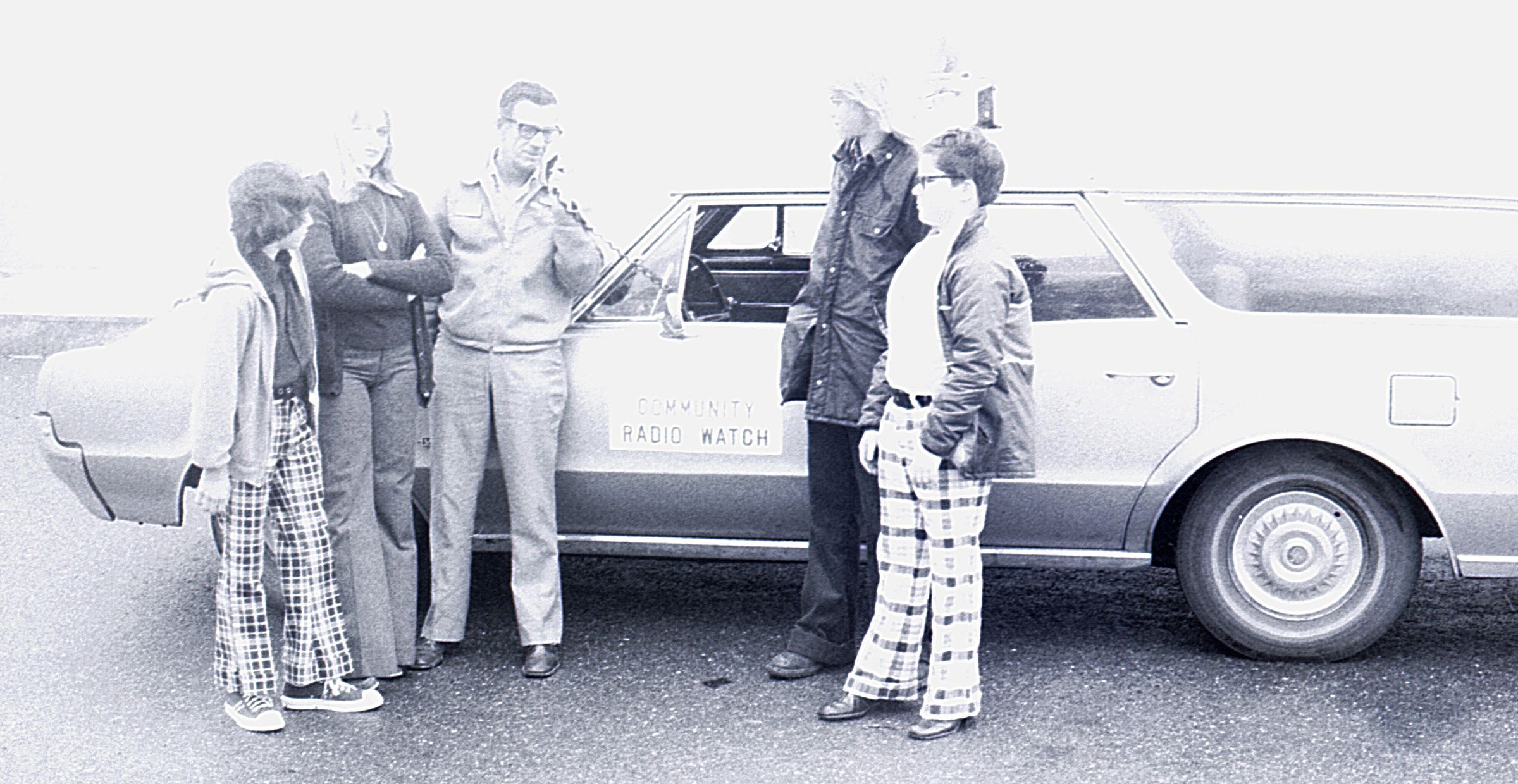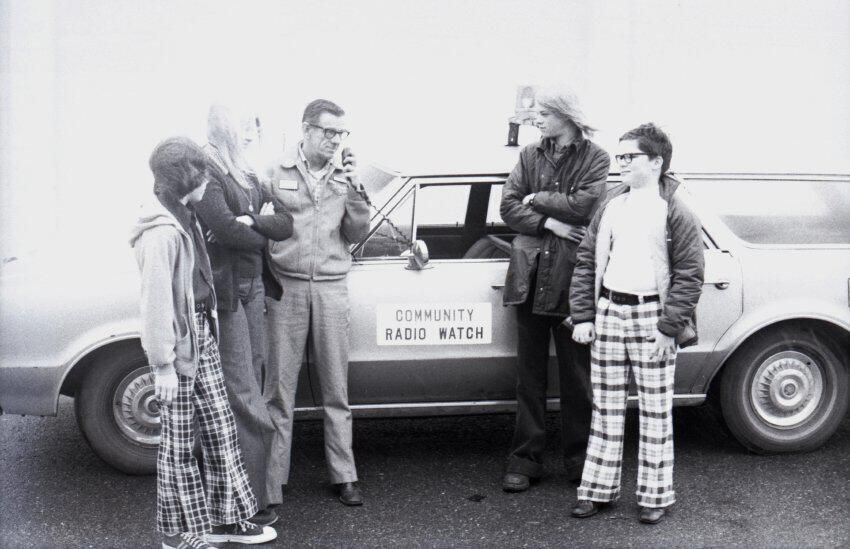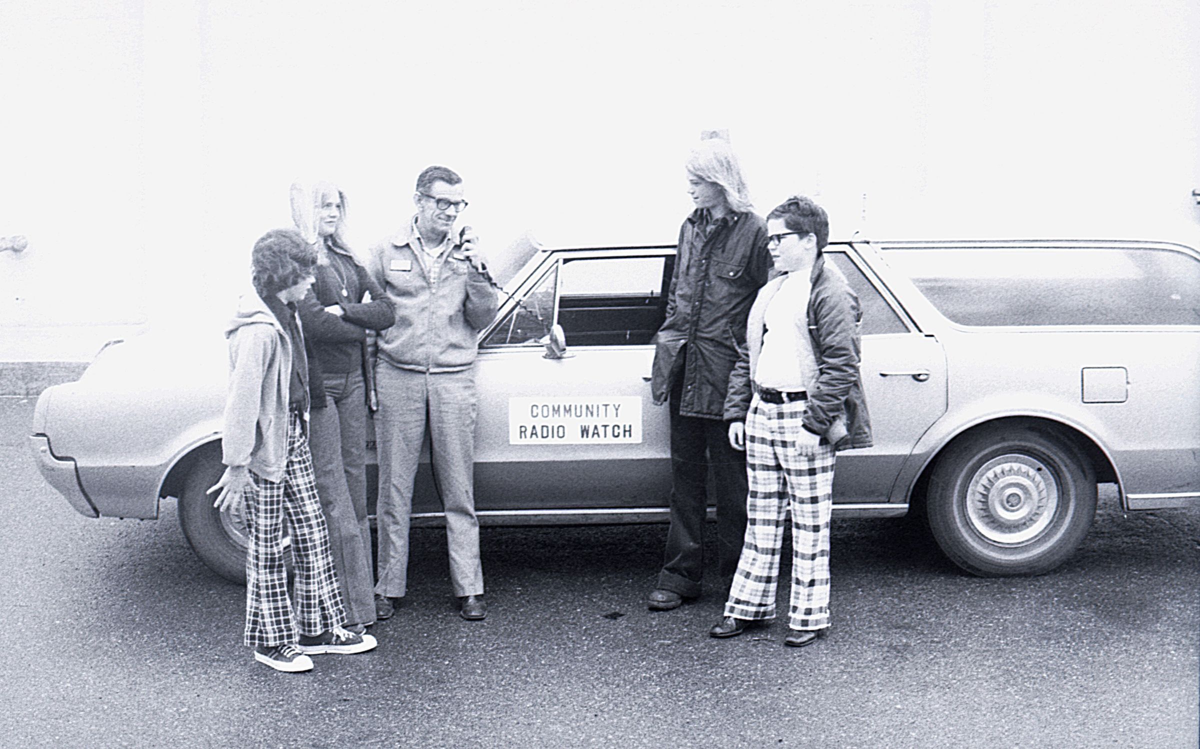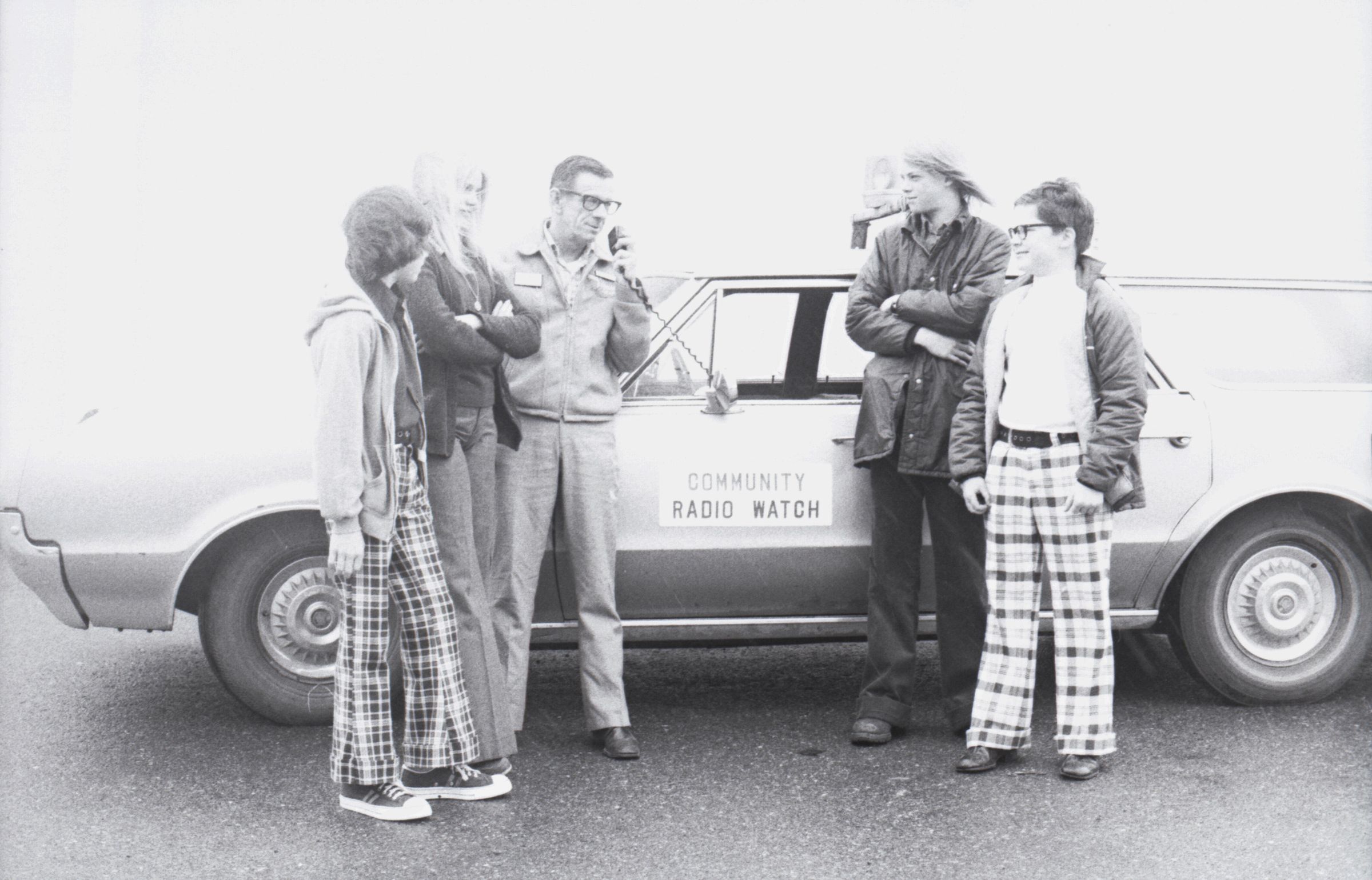 Diabetic Children, Unknown Date. These two black and white film negative strips were created for the Lacey Leader newspaper. These images show two boys, two young women and a man with glasses standing outside of a car. The car has a sign on the driver's side door which reads "COMMUNITY RADIO WATCH." The man has a CB radio microphone in his hand, and the microphone is attached to a cord running into the open driver's door window. Ken Balsley believed these images were related to the American Diabetes Association.