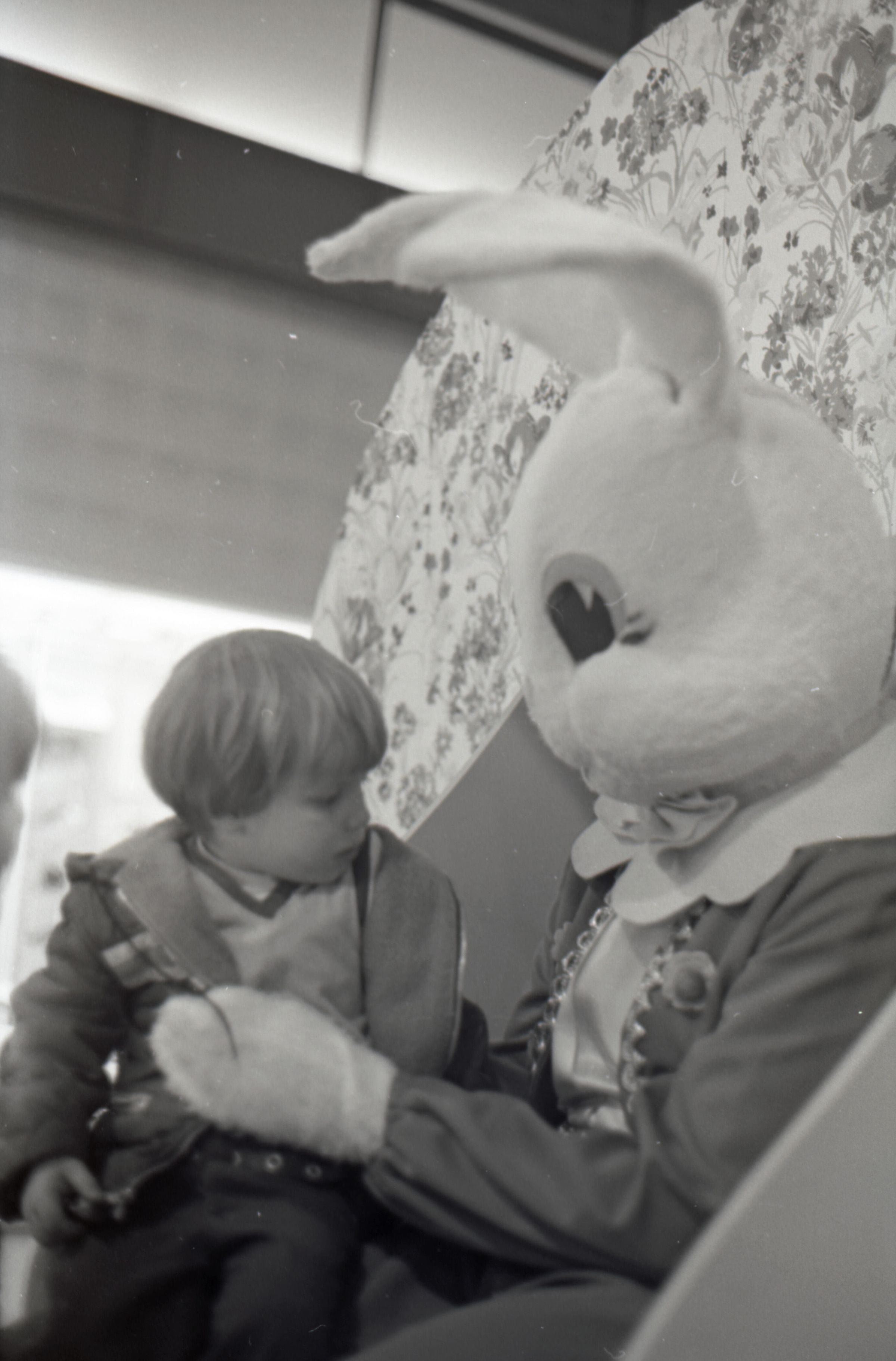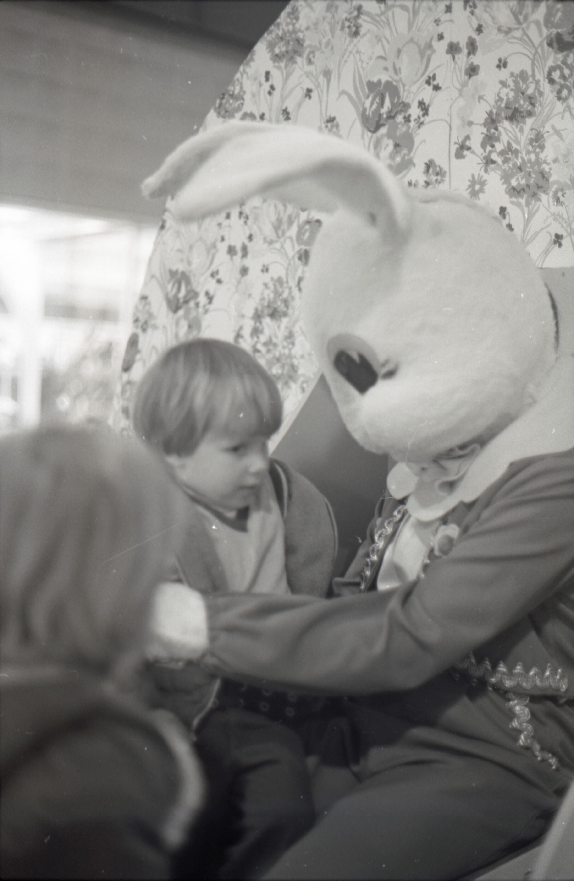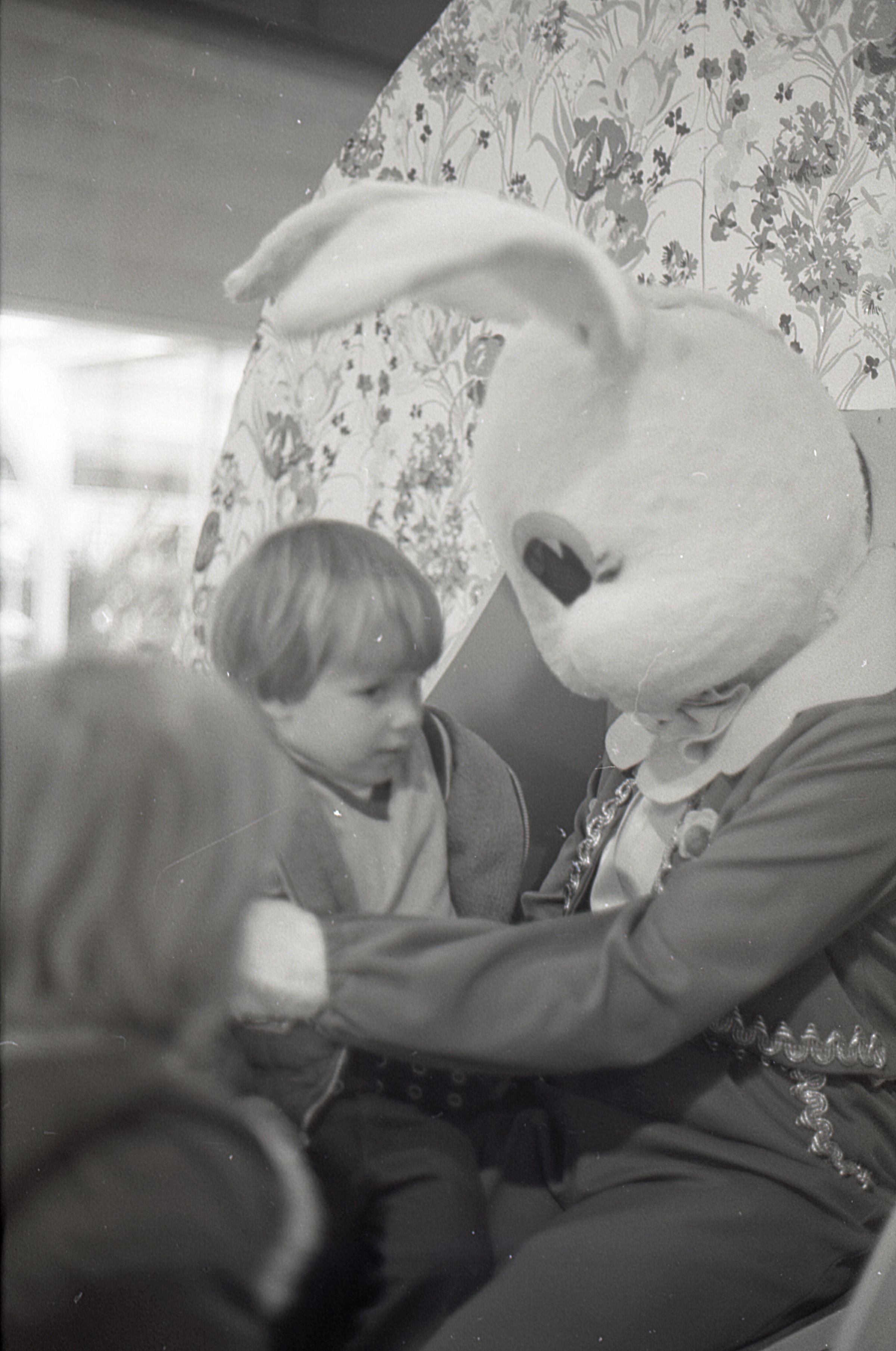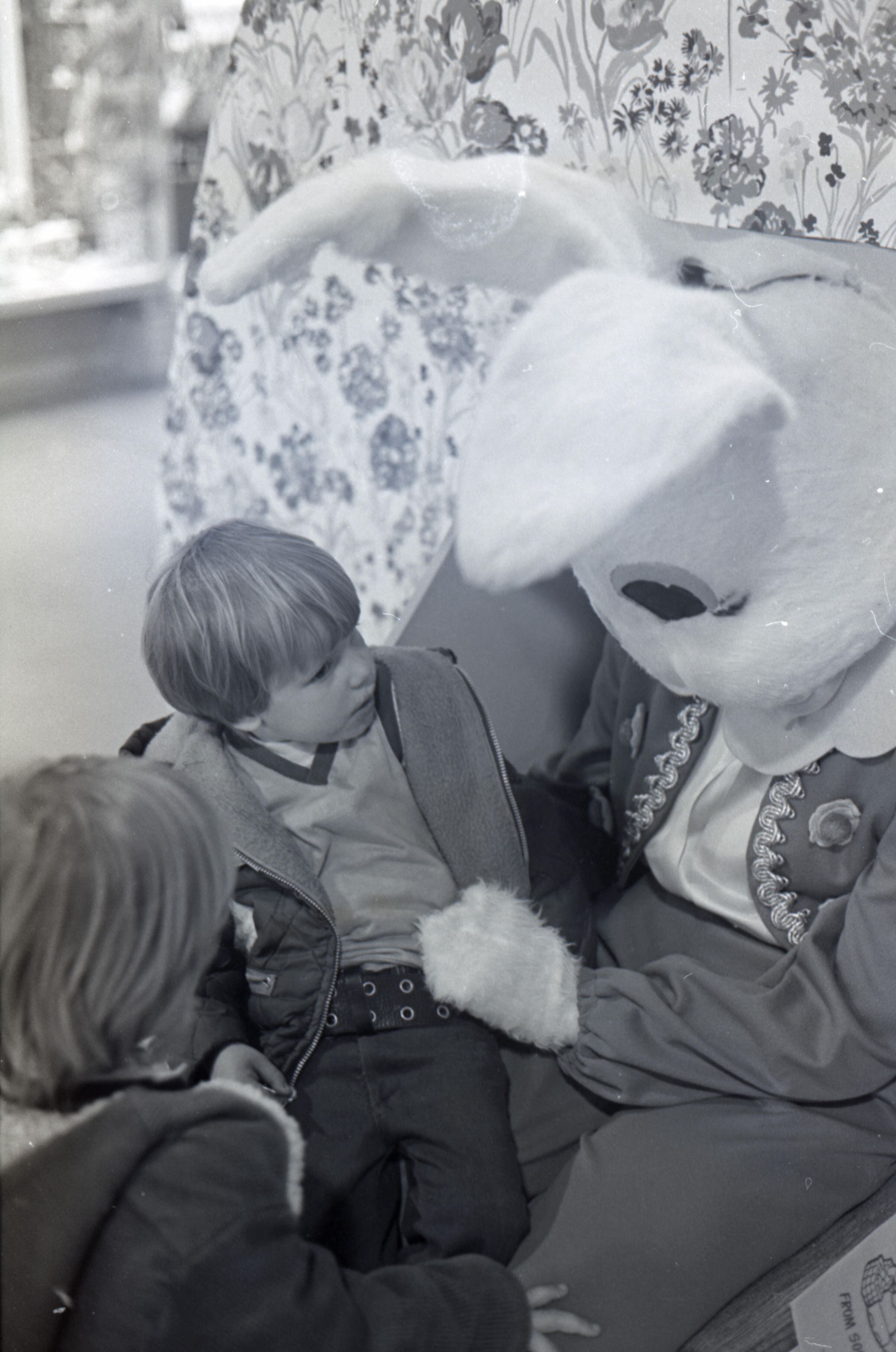 South Sound Easter Bunny, Unknown Date. These three black and white film negative strips were created for the Lacey Leader newspaper. These images show a small child sitting in the lap of someone dressed as the Easter Bunny. A second child is visible standing nearby in some of the images. Image 1 shows the child seated on the Easter Bunny's lap. The second child is visible in the bottom-left corner of the image looking toward the Easter Bunny. This second child is blurry. This image is oriented vertically. Image 2 shows the Easter Bunny with its left hand on the child on its lap's chest. Image 3 is very similar to the previous image, but here the child's right arm is partially visible in the bottom-left corner on the image. Image 4 is similar to the previous images, but here the image is oriented horizontally. Here the second child is visible from the waist up. Images 5-8 is nearly identical to image 2. Image 9 is very similar to the previous images, but here the photographer has moved away or zoomed out from their subjects slightly. this image is oriented vertically. Image 10 is very similar to the previous image, but here the image is oriented horizontally. Image 11 is nearly identical to image 9.
