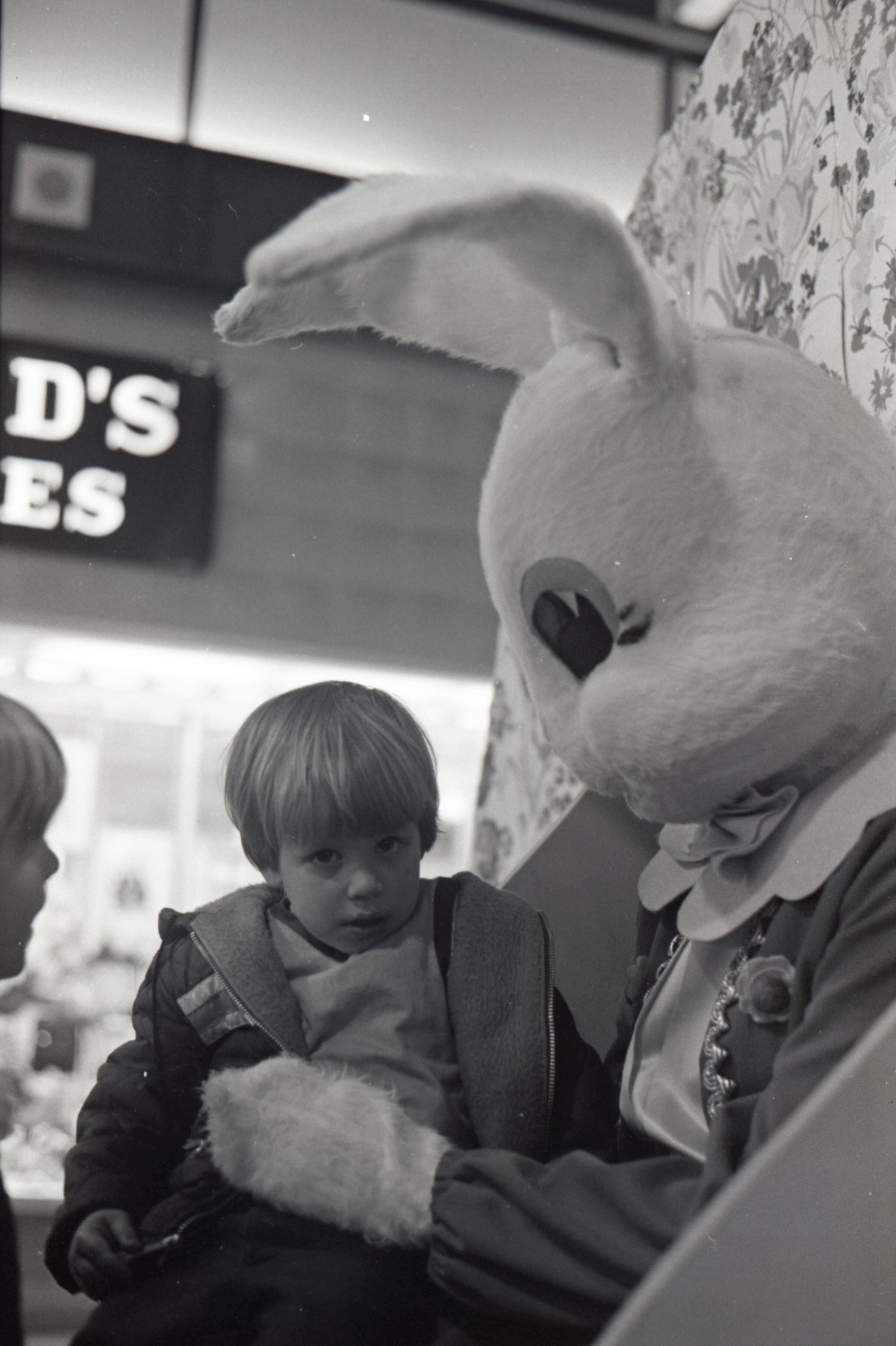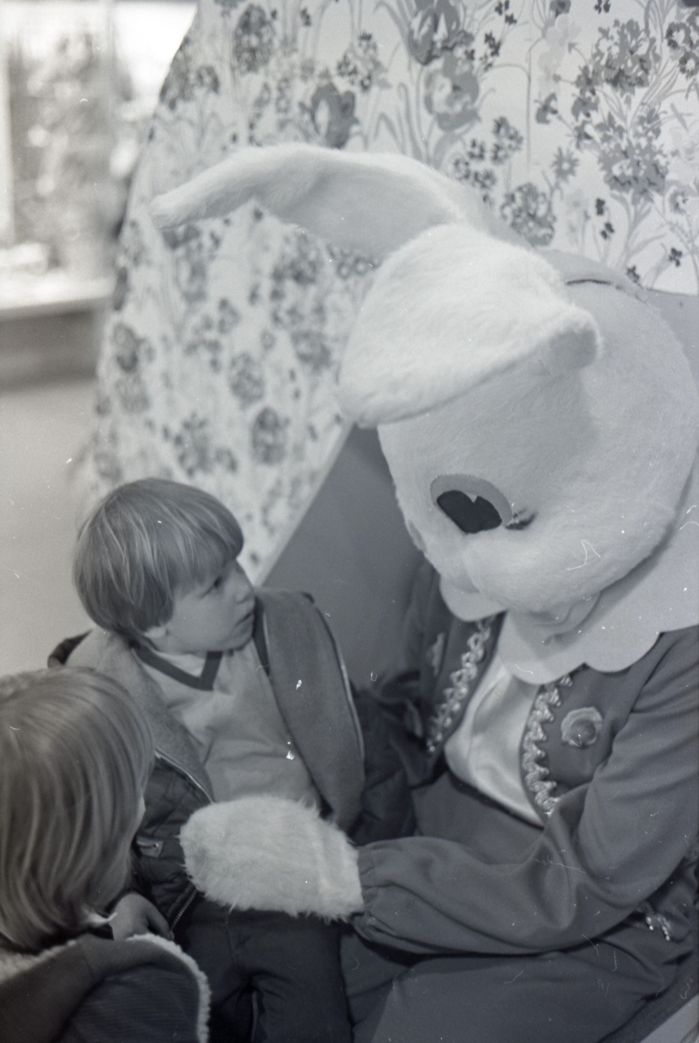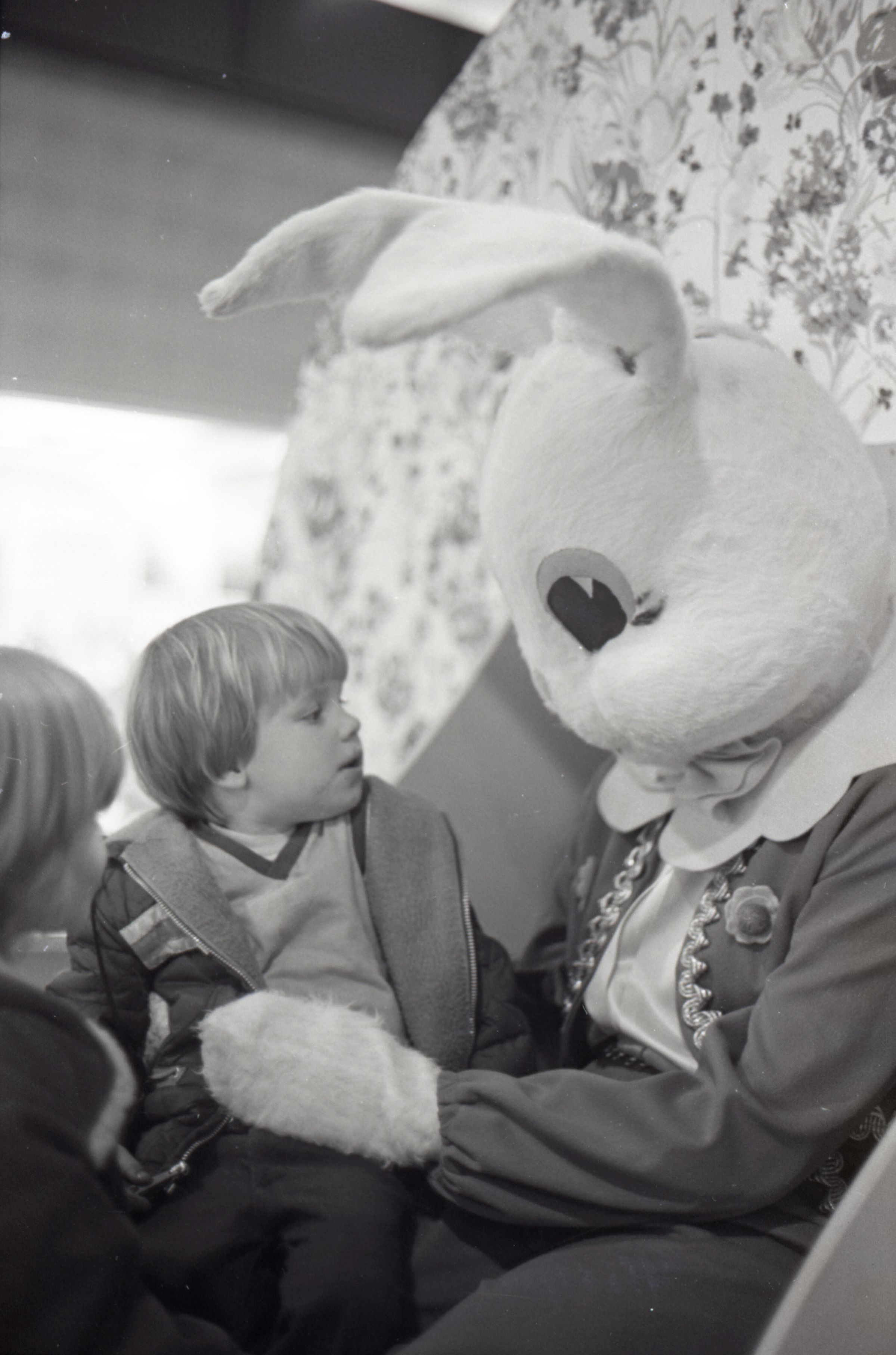 South Sound Easter Bunny, Unknown Date. These three black and white film negative strips were created for the Lacey Leader newspaper. These images show a small child sitting in the lap of someone dressed as the Easter Bunny. A second child is visible standing nearby in some of the images. Image 1 shows the child seated on the Easter Bunny's lap. The second child is visible in the bottom-left corner of the image looking toward the Easter Bunny. This second child is blurry. This image is oriented vertically. Image 2 shows the Easter Bunny with its left hand on the child on its lap's chest. Image 3 is very similar to the previous image, but here the child's right arm is partially visible in the bottom-left corner on the image. Image 4 is similar to the previous images, but here the image is oriented horizontally. Here the second child is visible from the waist up. Images 5-8 is nearly identical to image 2. Image 9 is very similar to the previous images, but here the photographer has moved away or zoomed out from their subjects slightly. this image is oriented vertically. Image 10 is very similar to the previous image, but here the image is oriented horizontally. Image 11 is nearly identical to image 9.
