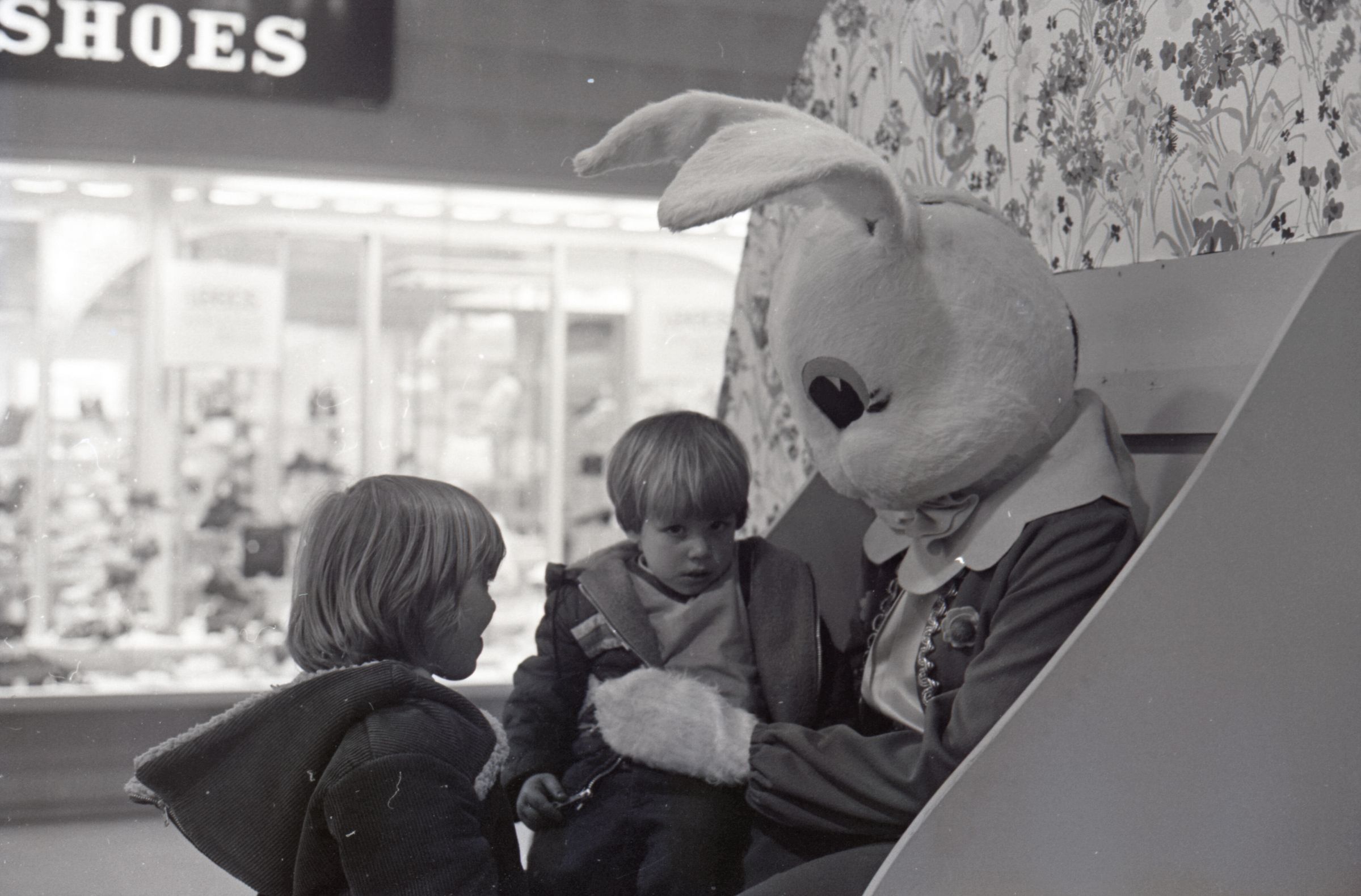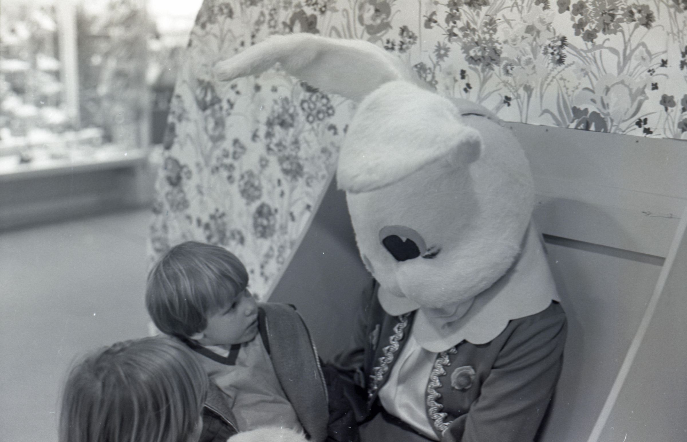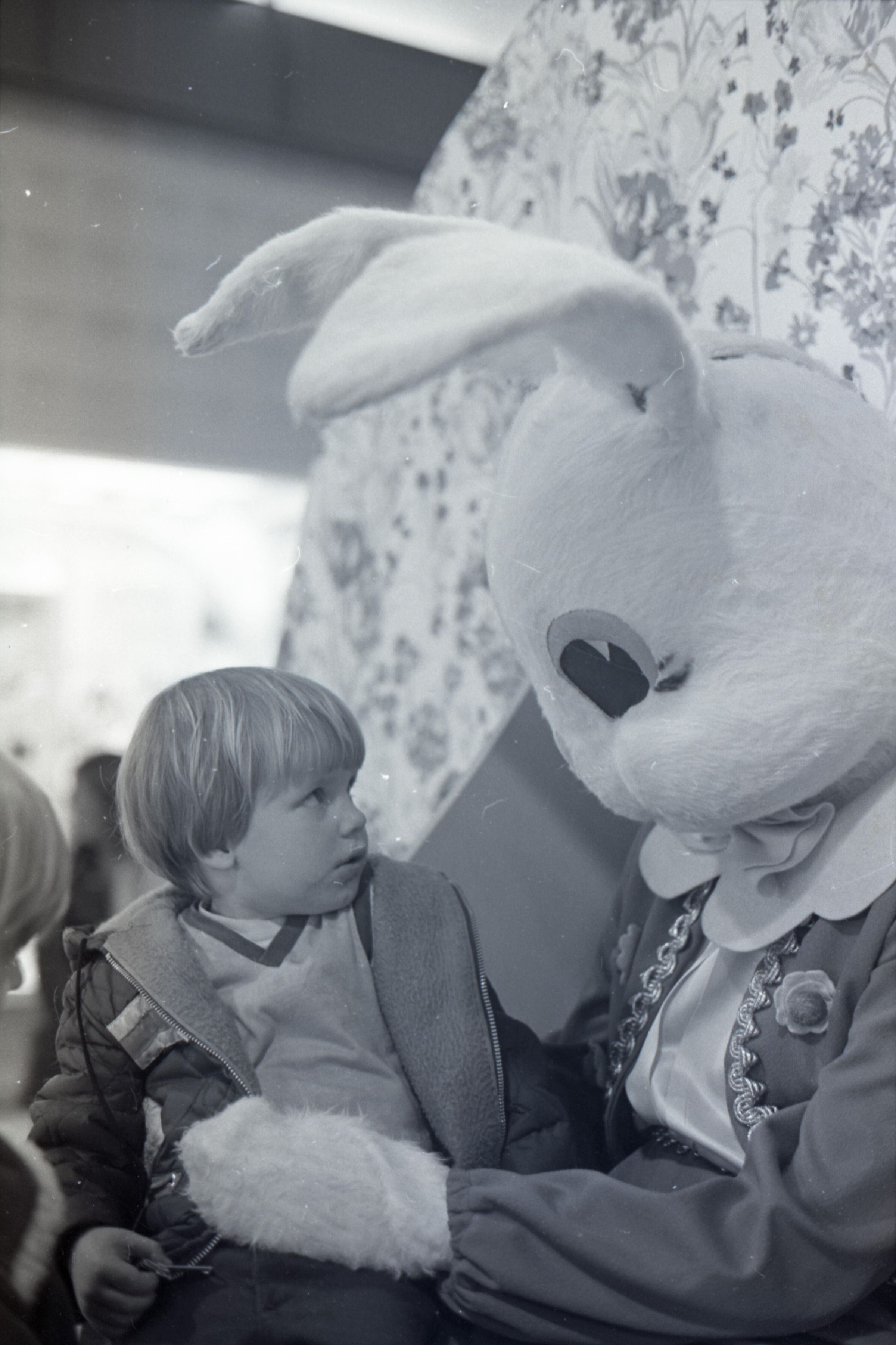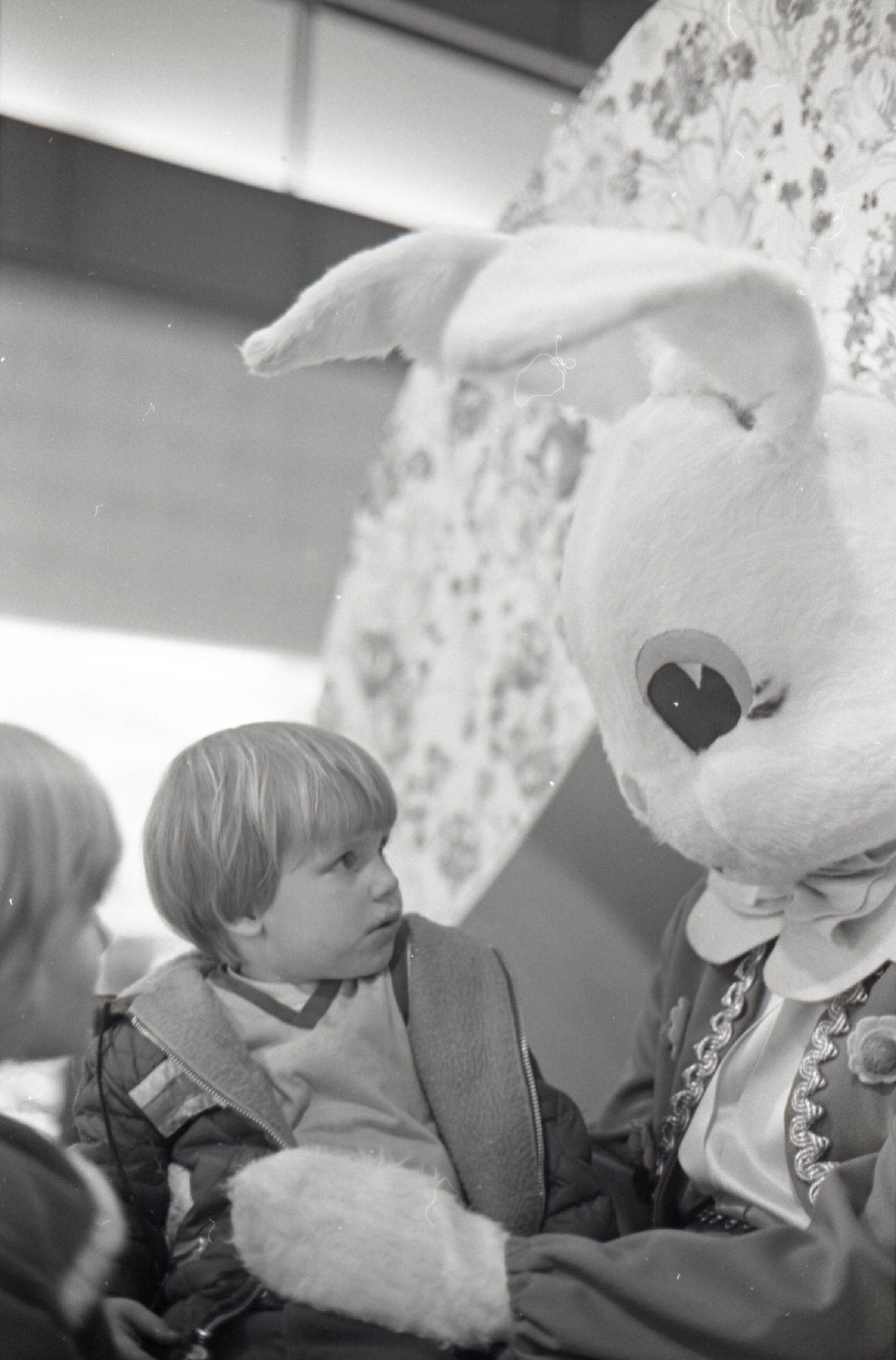 South Sound Easter Bunny, Unknown Date. These three black and white film negative strips were created for the Lacey Leader newspaper. These images show a small child sitting in the lap of someone dressed as the Easter Bunny. A second child is visible standing nearby in some of the images. Image 1 shows the child seated on the Easter Bunny's lap. The second child is visible in the bottom-left corner of the image looking toward the Easter Bunny. This second child is blurry. This image is oriented vertically. Image 2 shows the Easter Bunny with its left hand on the child on its lap's chest. Image 3 is very similar to the previous image, but here the child's right arm is partially visible in the bottom-left corner on the image. Image 4 is similar to the previous images, but here the image is oriented horizontally. Here the second child is visible from the waist up. Images 5-8 is nearly identical to image 2. Image 9 is very similar to the previous images, but here the photographer has moved away or zoomed out from their subjects slightly. this image is oriented vertically. Image 10 is very similar to the previous image, but here the image is oriented horizontally. Image 11 is nearly identical to image 9.