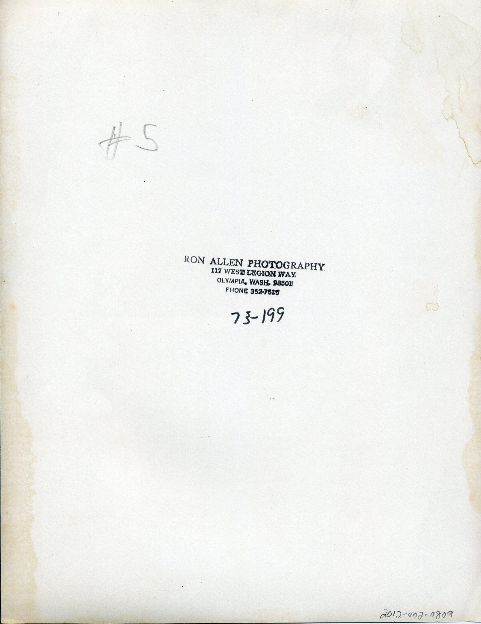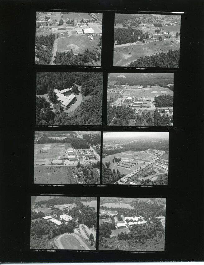 Black and white image of 8 aerial photos. The images are all approximately 2.25" by 2.75". They are in two columns. Beginning at the upper left and going down the column, the images are (1) buildings, parking areas, roads, a ball field, and trees in the foreground. (2) a building with a white roof and various extensions and a driveway among trees, (3) what appears to be commercial buildings and trees along a road, (4) buildings, parking area, and trees along with a "U" shaped driveway, (5) buildings, a water tower, trees, and bare ground, (6) buildings, bare ground, and trees, (7) buildings, trees, and bare ground on two sides of a road, (8) buildings inside a forested area. On the back is a stamp in black ink that says "Ron Allen Photography 117 West Legion Way Olympia, Wash. 98501 Phone 352-7515". In ink is "73-199", and in pencil is "#5".Made/Created