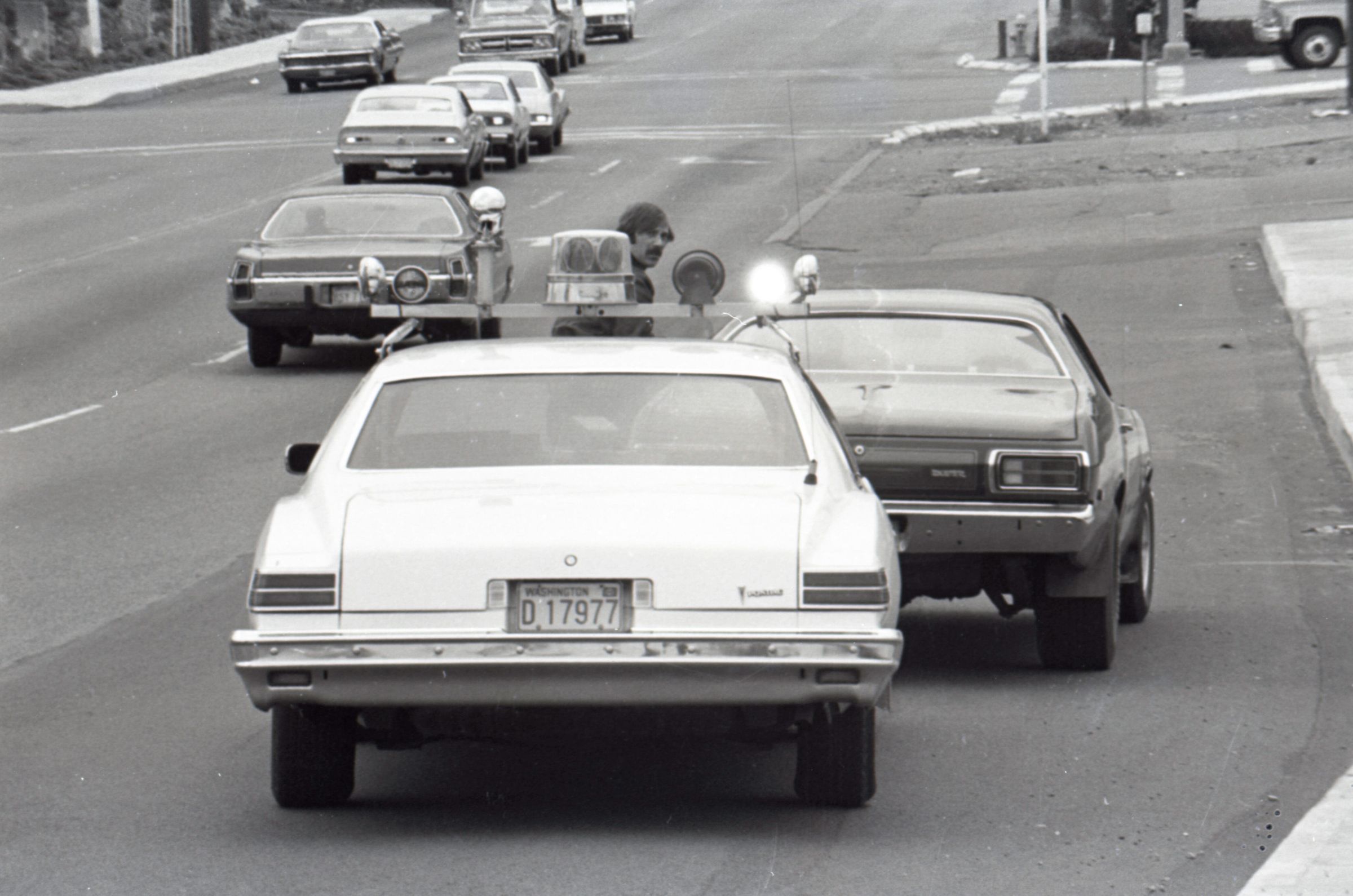 Police Patrol, 1978. These three black and white film negative strips were created for the Lacey Leader newspaper. These images show shots taken from the passenger seat of a police cruiser. The steering wheel and dashboard are visible in the images. Also shown is a police cruiser and a second car pulled over to the side of the road in a traffic stop. Image 14 shows an interior shot of a police cruiser. Visible at the left is the steering wheel with a person's left hand on it. Also visible is the left-hand side of the dashboard. A street and several buildings are visible through the car's windshield. Image 15 is very similar to the previous image, but here the photographer has panned to the right slightly. Only the thumb of the hand on the steering wheel is visible. Trees are visible through the windshield. Images 16 through 19 are nearly identical to image 15. Image 20 shows a police cruiser pulled over on the side of a road. A car parked in front of the police cruiser is almost completely obscured by the police cruiser. A man in a coat with a fur or wool collar is stading outside of the car in front of the police cruiser. This man is facing away from the camera. Two gas stations are visible in the background. Image 21 is similar to image 20, but here the photographer has moved to their left by approximately twenty feet. Here much more of the second car is visible. The driver's side door of the car is open. An SUV-style car is partially visible at the left-hand side of the image frame. Image 22 is very similar to th previous image, but here the police officer and the SUV-style car is not visible in the image frame. Image 23 is very similar to the previous image, but here a car is passing the police cruiser and the other parked car. Image 24 shows the same scene, but here the photographer has moved to a position lined up with the back of the police cruiser. The second car is partially visible to the right-hand side of the image frame. Imae 25 is very similar to the previous image, but here the photographer has moved closer to or zoomed in on the two cars. Image 26 is nearly identical to image 25.Made/Created