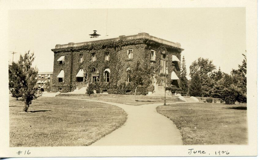 Black and white photo of the Salem, Oregon Post Office. The building is rectangular with two stories and a flat roof. The sides are covered with vines, probably Ivy. There is an entrance on the side and on the end. Some of the windows have awnings. There is a curved sidewalk starting at the bottom of the print and dividing toward the two entrances. There is grass in the foreground and a small tree. In the background are more trees and an object visible over the roof of the Post Office. There is a white border on all sides, and in the bottom border is written "#16 June, 1926". On the back is stamped "6527".