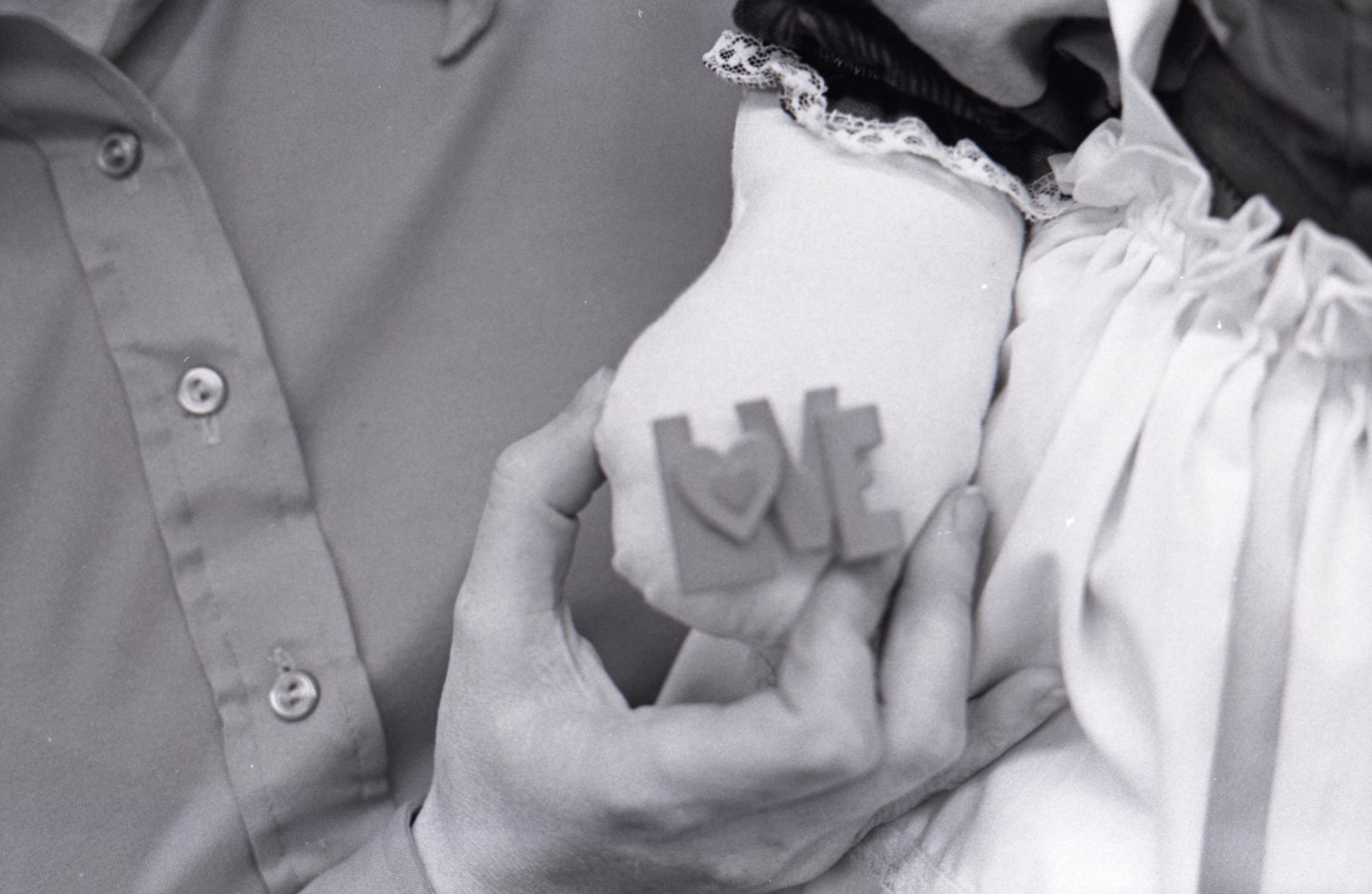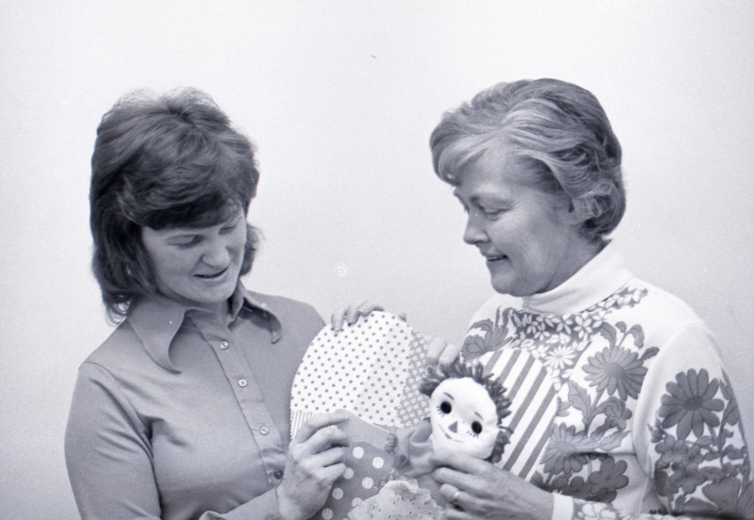 Women with Raggedy Ann Doll, Unknown Date. These two black and white film negative strips were created for the Lacey Leader newspaper. These images show two women playing with a Raggedy Ann doll. Image 38 shows the two women looking at each other and laughing. The doll is between them. Image 39 shows the woman on the left looking down at the doll and the woman on the right looking at the camera. Both women are smiling. Image 40 shows both women looking at the doll. Image 41 shows the doll on the left and the two women on the right. They are looking at the doll and smiling. Image 42 is very similar to image 41, but here the photographer has moved backward several feet. Image 43 is similar to image 40, but here a doorway is partially visible in the background. Image 44 is nearly identical to the previous image. This image is oriented horizontally. Image 1 is very similar to the previous image, but here the image is oriented vertically. Image 2 shows a piece of the doll which reads "LOVE." Image 3 shows both women facing toward the left-hand side of the image. The doll is in between the two women. Image 4 is very similar to the previous image, but here both women are smiling.