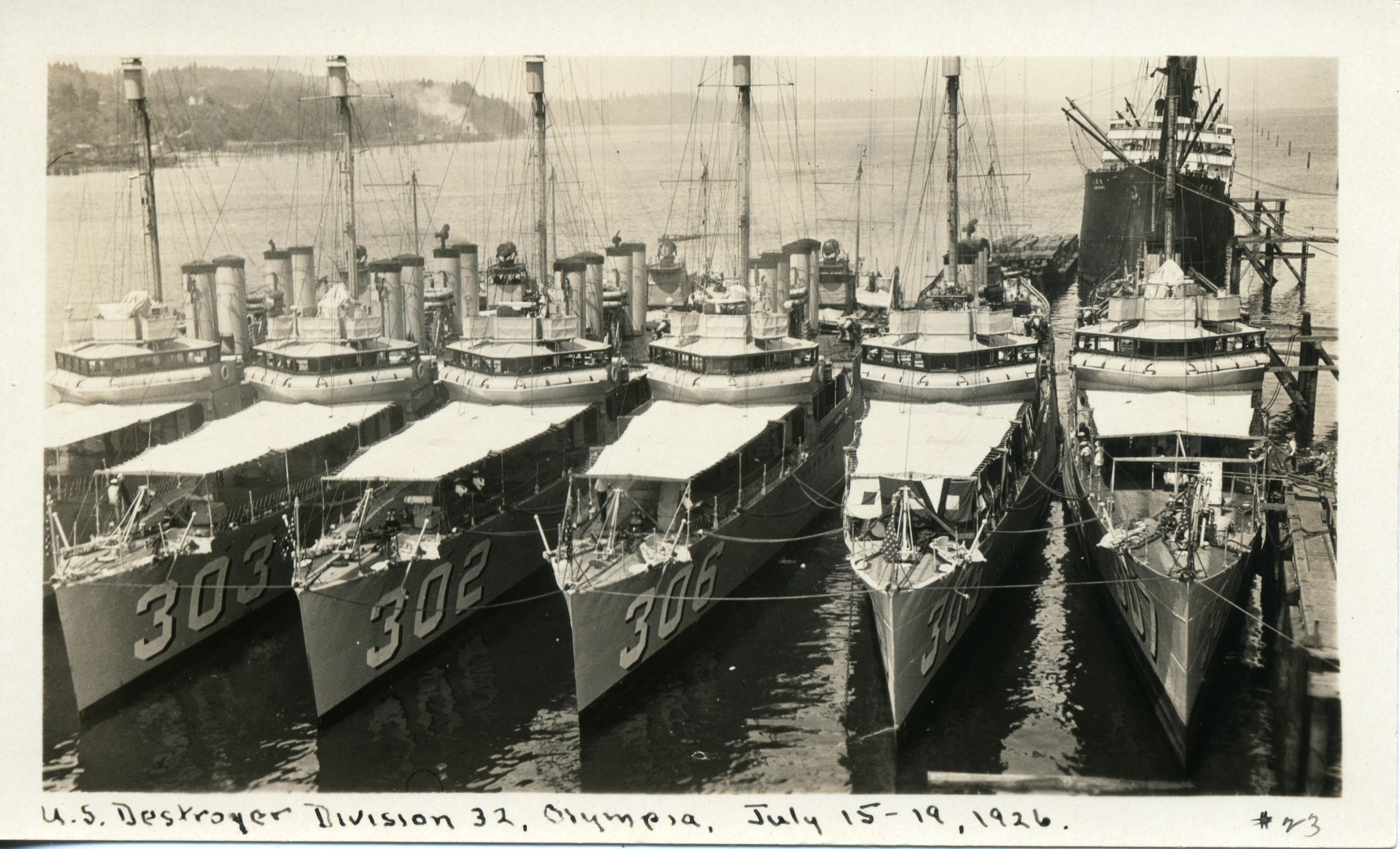 Black and white photo of Destroyer Division 32. There are six ships with their bows pointing at the camera. The one on the left is only partially visible. On each of the ships there is an awning over the fore deck, and behind that is the windows of the bridge, and then a mast and smoke stacks. There is a larger ship behind the destroyer at the right. Large numbers are on the hulls, the ones at the left being 303, 302, and 306. Behind the ships is the waters of Puget Sound and some hills. There is a white border on all sides, and in the bottom border is "U. S. Destroyer Division 32, Olympia, July 15, 926. #23". On the back is stamped "6800".