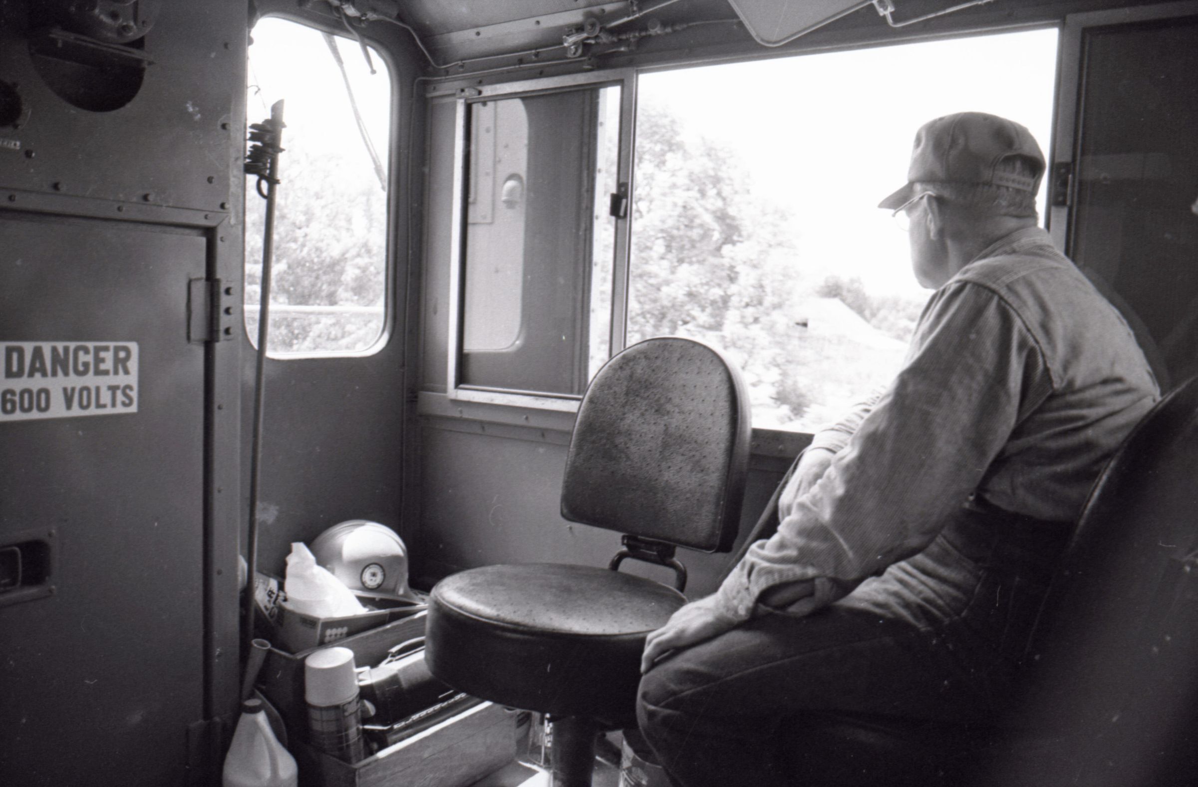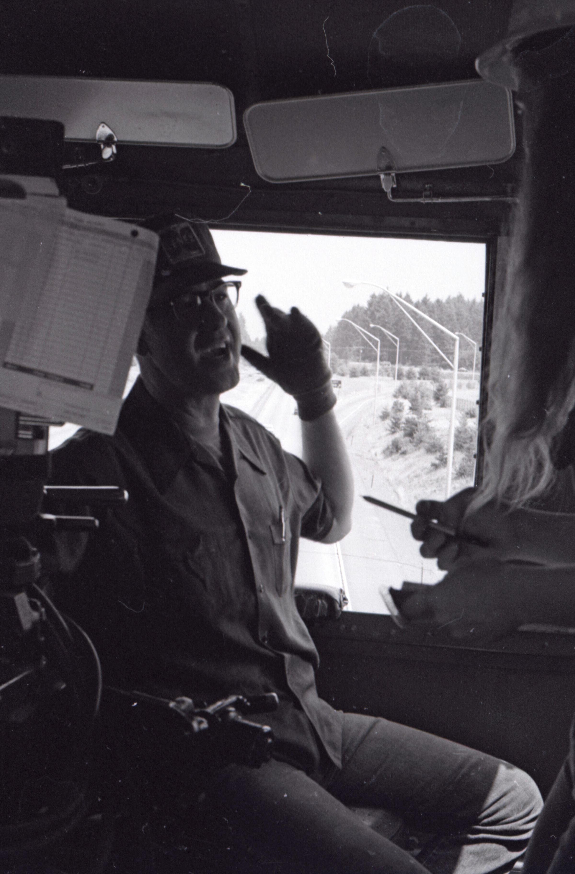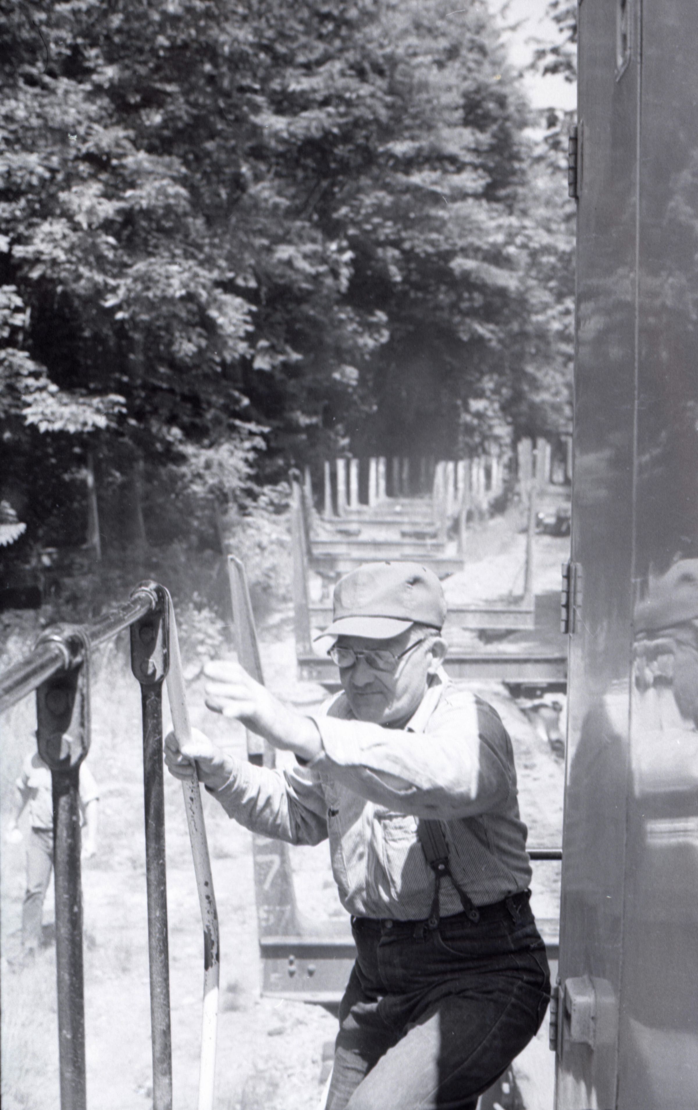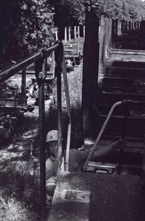 The images in group "a" show an empty logging train's journey from one location to another. Image 28a shows a man wearing a Weyerhaeuser hard hat climbing down a short ladder or set of stairs off of the train's engine. He is facing toward the right-hand side of the image. Image 29a shows the man at the bottom of the ladder or stairs. Here he is facing toward the camera. Image 30a shows a man in a Weyerhaueser hard hat at left standing on the ground, and the train's engineer leaning down off of the side of the train's engine at right. The two men are passing an unknown object from one to the other. The train's engineer is wearing glasses and a cap. Image 31a shows the engineer climbing farther up onto the train's engine. He is holding onto a railing with his right hand and reaching toward the same railing with his left hand. Here it can be seen that the engineer is wearing suspenders. Image 32a shows the engineer sitting in the control area of the train. This image was captured from inside the train's control area. His body is oriented toward the right-hand side of the image frame, and his head is turned toward his left and away from the camera. He is looking out of a window of the control area of the train. He is holding a cigarette in his left hand. Image 33a shows a woman with very long hair wearing a Weyerhaeuser hard hat. She is facing directly toward the camera and has a large smile on her face. This image was captured inside of the train's control area. Image 34a shows several empty logging cars. This image was captured looking down the long axis of the cars. In the background, beyond the end of the train is a densely forested area with a small passage visible for the train to pass through. This image is oriented vertically. Image 35a is very similar to the previous image, but here the image is oriented horizontally. Image 36a shows the train's engineer looking out one of the windows of the train's control area. This image was captured inside of the train's control area. The engineer's body is oriented toward the left-hand side of the image frame, and his head is turned away from the camera. This image is oriented vertically. Image 37a is nearly identical to the previous image. Image 38a is similar to the previous two images, showing the engineer in the same position. However, here the image is oriented horizontally, and the photographer has backed away or zoomed out from the engineer making more of the train control area visible. A small metal door with a label reading "DANGER 600 VOLTS" is visible at the left-hand edge of the image. An empty chair is immediately to the left of the engineer, and to the left of the chair is a pile of what appears to be boxes with a hard hat on top. Image 39a is nearly identical to the previous image. Image 40a is very similar to the previous two images, but here the photographer has zoomed in or moved closer to the engineer. The pile of boxes topped with a hard hat is still partially visible in this image. Image 41a shows the engineer seated with his body oriented generally toward the camera, and his head turned slightly toward the right-hand side of the image. There is a paper document hanging in the top-left corner of the image, and this document is obscuring most of the engineer's face. The woman seen in image 33a is partially visible at the right-hand edge of the image. The engineer is in a position suggesting that he is manipulating some controls of the train, but the image is underexposed, making it difficult to make out. Image 42a is similar to image 41a, but here the engineer is raising his left hand toward his mouth and appears to be shouting. Image 43a is very similar to image 41a, but here the engineer is facing fully toward the right-hand side of the image frame. He is shown in profile. Image 44a is nearly identical to image 43a. Image 1a shows an exterior shot of the train's engine and one of the empty log cars. The log car is closer to the camera, with the engine beyond it. The number 765 is on the left and right sides of the back of the train. The train is in a lightly wooded area. The end of the log car is visible in the bottom-left corner of the image frame. Image 2a is very similar to the previous image, but here the photographer has moved closer to or zoomed in on the log car and engine. Image 3a shows several of the empty log cars. The engine is not visible in this image. Image 4a shows an exterior shot of a train engine. A man can be seen through the window of the train engine. He is looking toward the camera and smiling. A Weyerhauser logo and the number 602 is visible on the side of the engine.