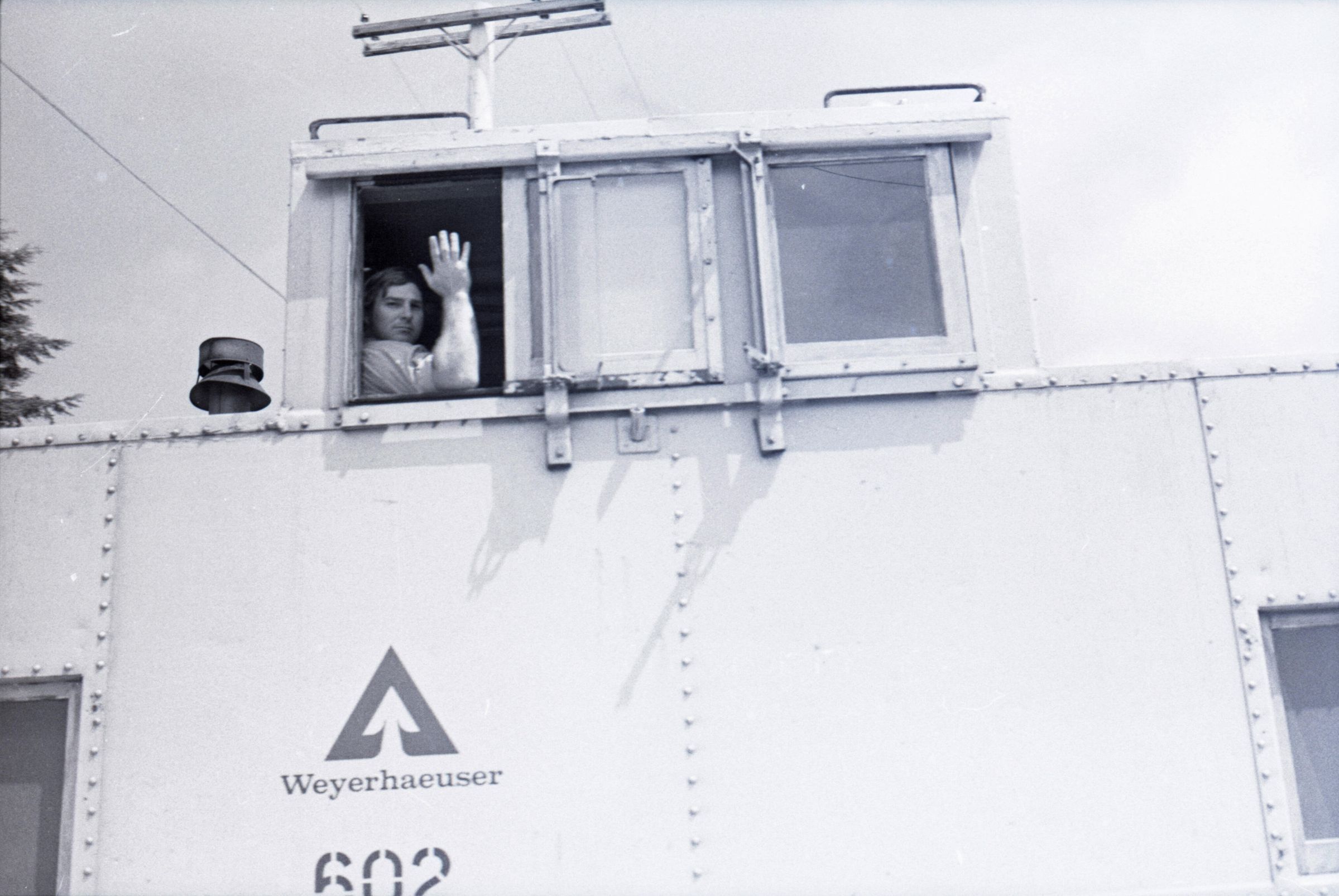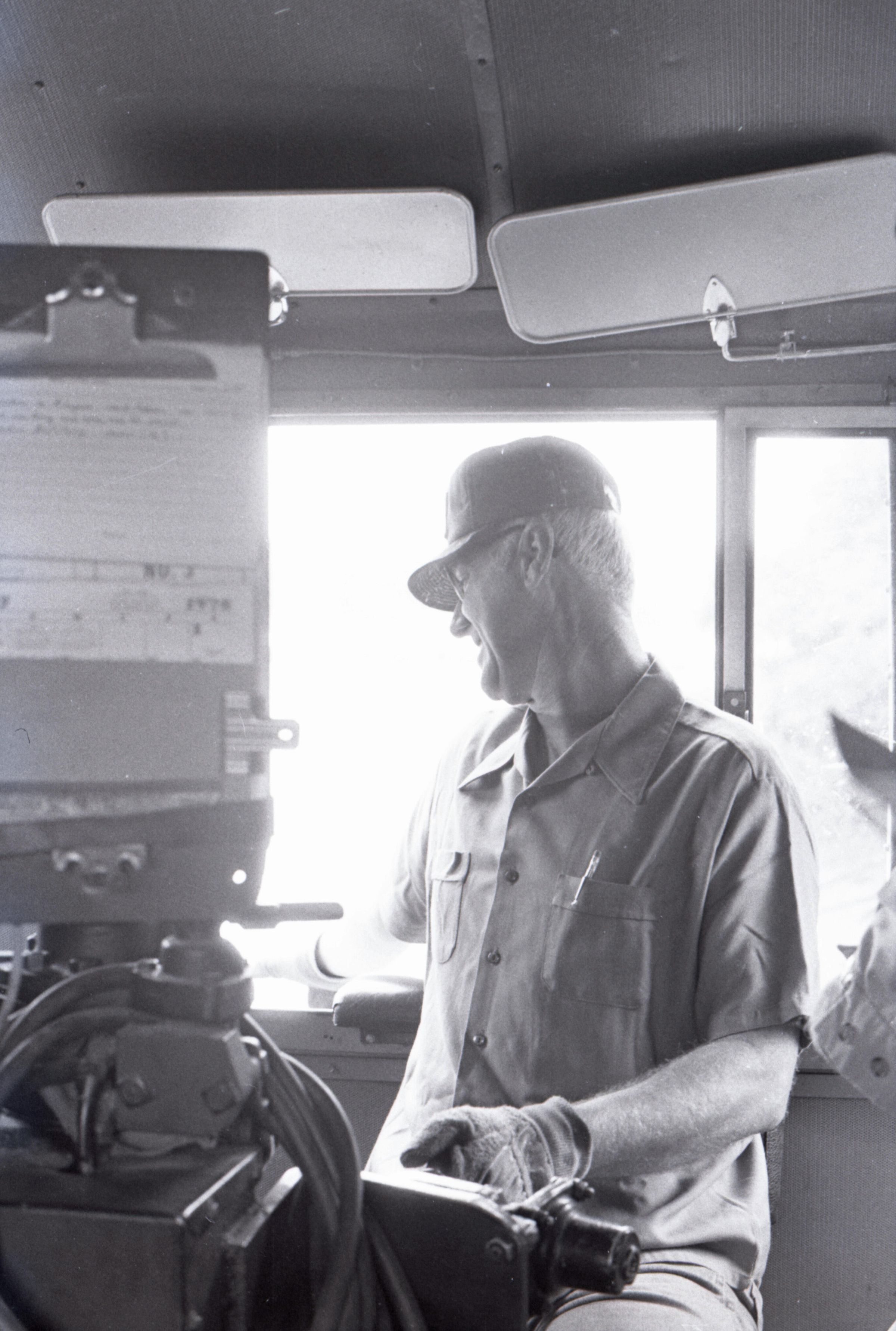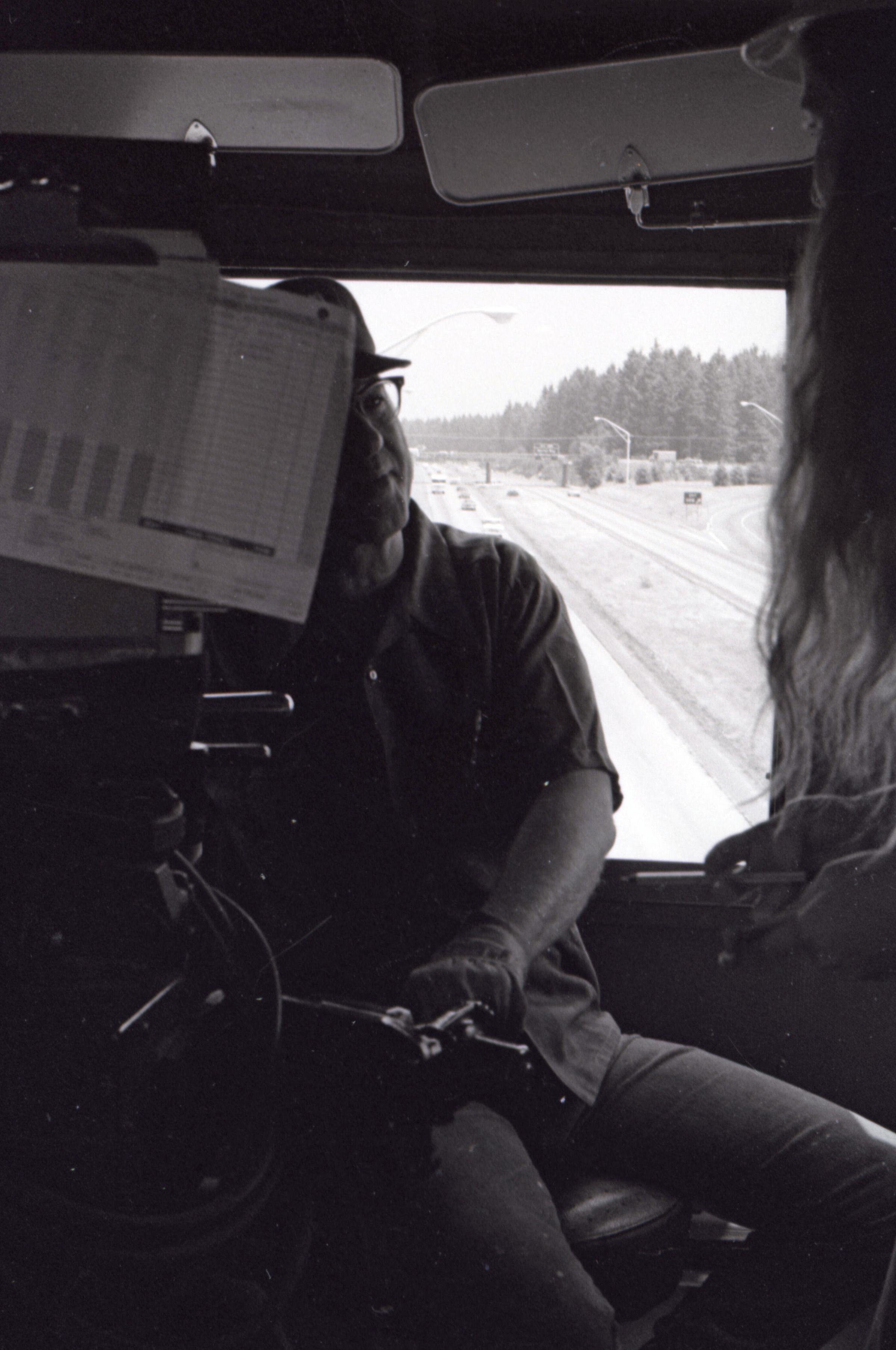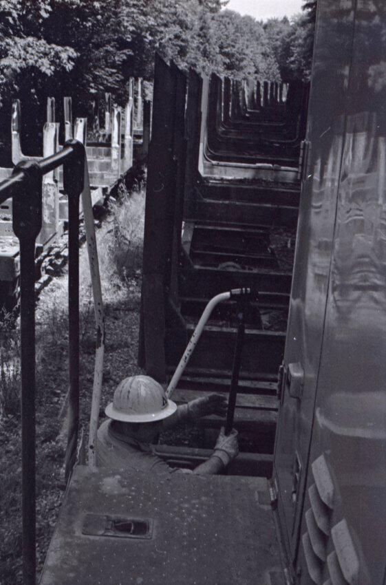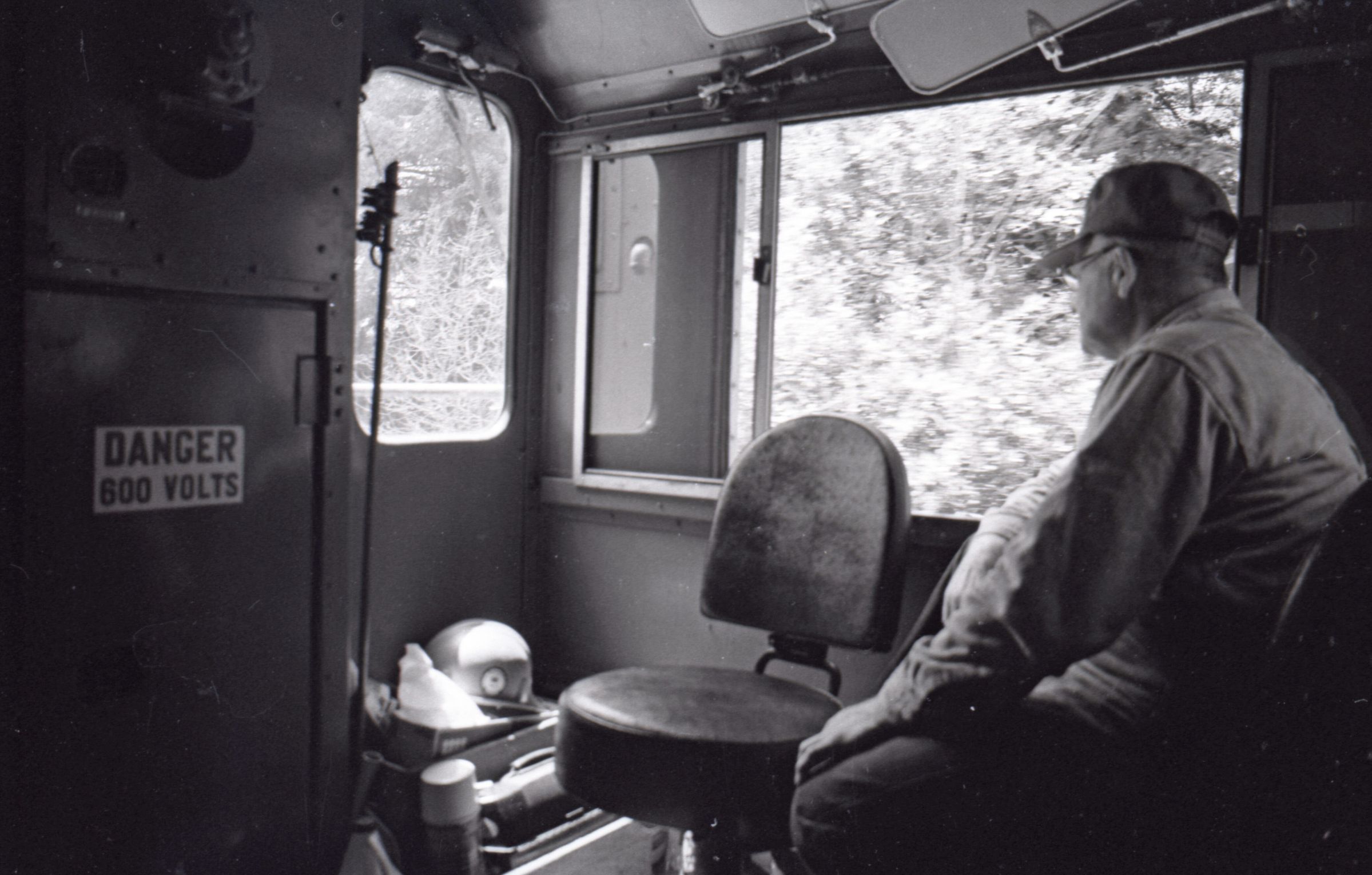 The images in group "a" show an empty logging train's journey from one location to another. Image 28a shows a man wearing a Weyerhaeuser hard hat climbing down a short ladder or set of stairs off of the train's engine. He is facing toward the right-hand side of the image. Image 29a shows the man at the bottom of the ladder or stairs. Here he is facing toward the camera. Image 30a shows a man in a Weyerhaueser hard hat at left standing on the ground, and the train's engineer leaning down off of the side of the train's engine at right. The two men are passing an unknown object from one to the other. The train's engineer is wearing glasses and a cap. Image 31a shows the engineer climbing farther up onto the train's engine. He is holding onto a railing with his right hand and reaching toward the same railing with his left hand. Here it can be seen that the engineer is wearing suspenders. Image 32a shows the engineer sitting in the control area of the train. This image was captured from inside the train's control area. His body is oriented toward the right-hand side of the image frame, and his head is turned toward his left and away from the camera. He is looking out of a window of the control area of the train. He is holding a cigarette in his left hand. Image 33a shows a woman with very long hair wearing a Weyerhaeuser hard hat. She is facing directly toward the camera and has a large smile on her face. This image was captured inside of the train's control area. Image 34a shows several empty logging cars. This image was captured looking down the long axis of the cars. In the background, beyond the end of the train is a densely forested area with a small passage visible for the train to pass through. This image is oriented vertically. Image 35a is very similar to the previous image, but here the image is oriented horizontally. Image 36a shows the train's engineer looking out one of the windows of the train's control area. This image was captured inside of the train's control area. The engineer's body is oriented toward the left-hand side of the image frame, and his head is turned away from the camera. This image is oriented vertically. Image 37a is nearly identical to the previous image. Image 38a is similar to the previous two images, showing the engineer in the same position. However, here the image is oriented horizontally, and the photographer has backed away or zoomed out from the engineer making more of the train control area visible. A small metal door with a label reading "DANGER 600 VOLTS" is visible at the left-hand edge of the image. An empty chair is immediately to the left of the engineer, and to the left of the chair is a pile of what appears to be boxes with a hard hat on top. Image 39a is nearly identical to the previous image. Image 40a is very similar to the previous two images, but here the photographer has zoomed in or moved closer to the engineer. The pile of boxes topped with a hard hat is still partially visible in this image. Image 41a shows the engineer seated with his body oriented generally toward the camera, and his head turned slightly toward the right-hand side of the image. There is a paper document hanging in the top-left corner of the image, and this document is obscuring most of the engineer's face. The woman seen in image 33a is partially visible at the right-hand edge of the image. The engineer is in a position suggesting that he is manipulating some controls of the train, but the image is underexposed, making it difficult to make out. Image 42a is similar to image 41a, but here the engineer is raising his left hand toward his mouth and appears to be shouting. Image 43a is very similar to image 41a, but here the engineer is facing fully toward the right-hand side of the image frame. He is shown in profile. Image 44a is nearly identical to image 43a. Image 1a shows an exterior shot of the train's engine and one of the empty log cars. The log car is closer to the camera, with the engine beyond it. The number 765 is on the left and right sides of the back of the train. The train is in a lightly wooded area. The end of the log car is visible in the bottom-left corner of the image frame. Image 2a is very similar to the previous image, but here the photographer has moved closer to or zoomed in on the log car and engine. Image 3a shows several of the empty log cars. The engine is not visible in this image. Image 4a shows an exterior shot of a train engine. A man can be seen through the window of the train engine. He is looking toward the camera and smiling. A Weyerhauser logo and the number 602 is visible on the side of the engine.