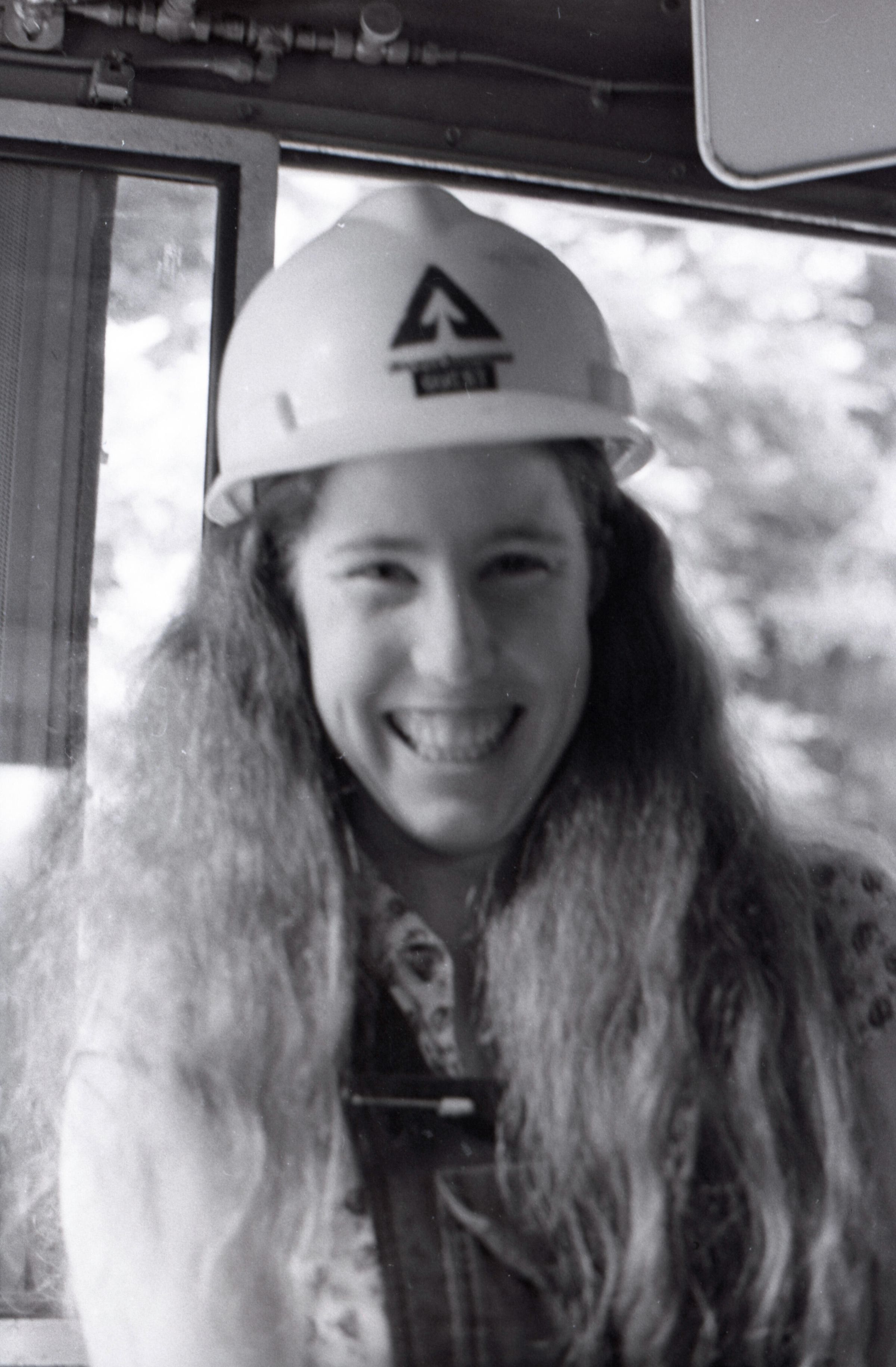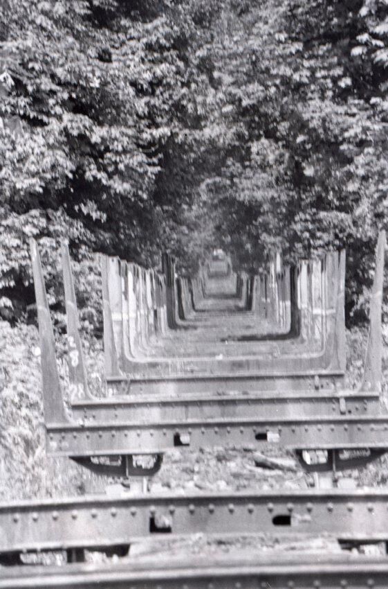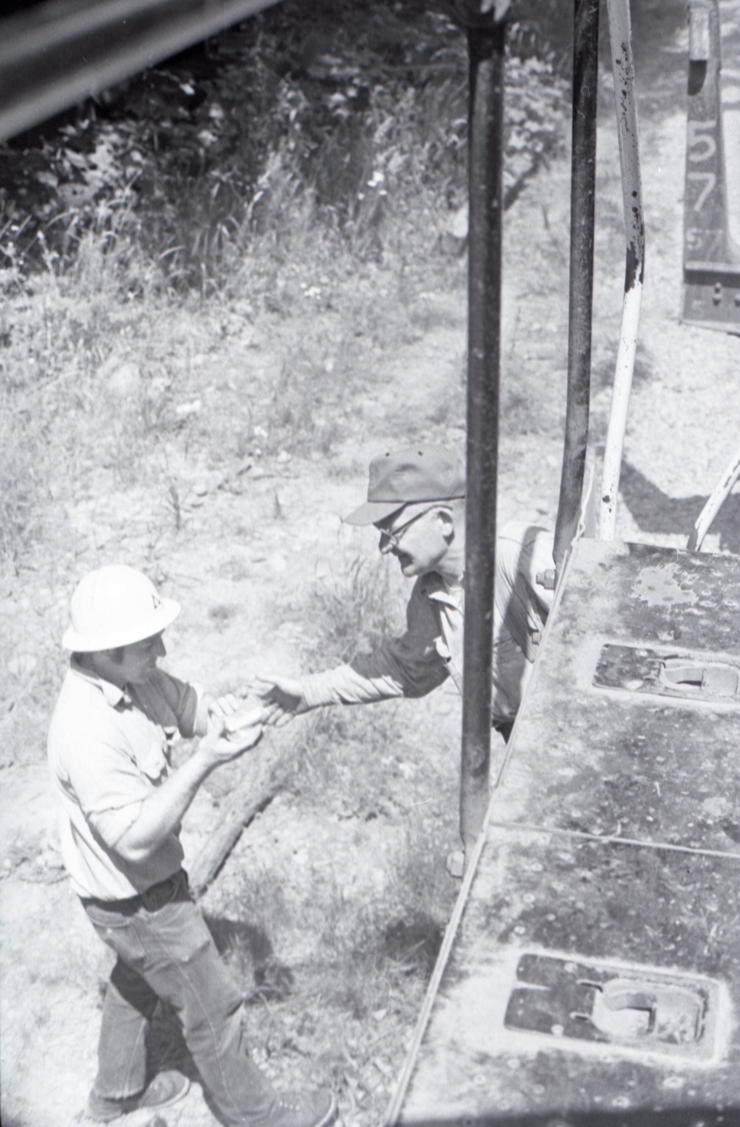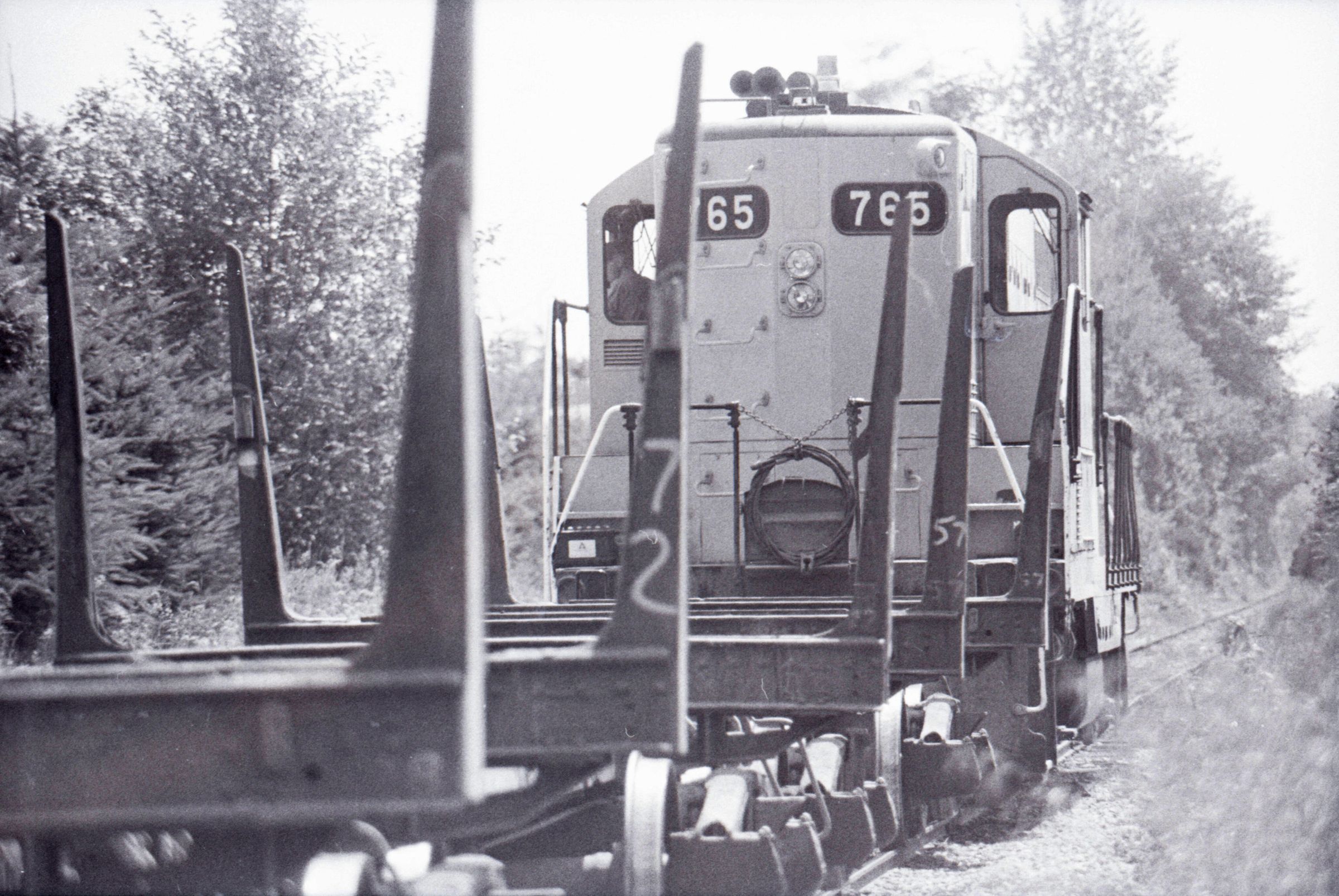 The images in group "a" show an empty logging train's journey from one location to another. Image 28a shows a man wearing a Weyerhaeuser hard hat climbing down a short ladder or set of stairs off of the train's engine. He is facing toward the right-hand side of the image. Image 29a shows the man at the bottom of the ladder or stairs. Here he is facing toward the camera. Image 30a shows a man in a Weyerhaueser hard hat at left standing on the ground, and the train's engineer leaning down off of the side of the train's engine at right. The two men are passing an unknown object from one to the other. The train's engineer is wearing glasses and a cap. Image 31a shows the engineer climbing farther up onto the train's engine. He is holding onto a railing with his right hand and reaching toward the same railing with his left hand. Here it can be seen that the engineer is wearing suspenders. Image 32a shows the engineer sitting in the control area of the train. This image was captured from inside the train's control area. His body is oriented toward the right-hand side of the image frame, and his head is turned toward his left and away from the camera. He is looking out of a window of the control area of the train. He is holding a cigarette in his left hand. Image 33a shows a woman with very long hair wearing a Weyerhaeuser hard hat. She is facing directly toward the camera and has a large smile on her face. This image was captured inside of the train's control area. Image 34a shows several empty logging cars. This image was captured looking down the long axis of the cars. In the background, beyond the end of the train is a densely forested area with a small passage visible for the train to pass through. This image is oriented vertically. Image 35a is very similar to the previous image, but here the image is oriented horizontally. Image 36a shows the train's engineer looking out one of the windows of the train's control area. This image was captured inside of the train's control area. The engineer's body is oriented toward the left-hand side of the image frame, and his head is turned away from the camera. This image is oriented vertically. Image 37a is nearly identical to the previous image. Image 38a is similar to the previous two images, showing the engineer in the same position. However, here the image is oriented horizontally, and the photographer has backed away or zoomed out from the engineer making more of the train control area visible. A small metal door with a label reading "DANGER 600 VOLTS" is visible at the left-hand edge of the image. An empty chair is immediately to the left of the engineer, and to the left of the chair is a pile of what appears to be boxes with a hard hat on top. Image 39a is nearly identical to the previous image. Image 40a is very similar to the previous two images, but here the photographer has zoomed in or moved closer to the engineer. The pile of boxes topped with a hard hat is still partially visible in this image. Image 41a shows the engineer seated with his body oriented generally toward the camera, and his head turned slightly toward the right-hand side of the image. There is a paper document hanging in the top-left corner of the image, and this document is obscuring most of the engineer's face. The woman seen in image 33a is partially visible at the right-hand edge of the image. The engineer is in a position suggesting that he is manipulating some controls of the train, but the image is underexposed, making it difficult to make out. Image 42a is similar to image 41a, but here the engineer is raising his left hand toward his mouth and appears to be shouting. Image 43a is very similar to image 41a, but here the engineer is facing fully toward the right-hand side of the image frame. He is shown in profile. Image 44a is nearly identical to image 43a. Image 1a shows an exterior shot of the train's engine and one of the empty log cars. The log car is closer to the camera, with the engine beyond it. The number 765 is on the left and right sides of the back of the train. The train is in a lightly wooded area. The end of the log car is visible in the bottom-left corner of the image frame. Image 2a is very similar to the previous image, but here the photographer has moved closer to or zoomed in on the log car and engine. Image 3a shows several of the empty log cars. The engine is not visible in this image. Image 4a shows an exterior shot of a train engine. A man can be seen through the window of the train engine. He is looking toward the camera and smiling. A Weyerhauser logo and the number 602 is visible on the side of the engine.