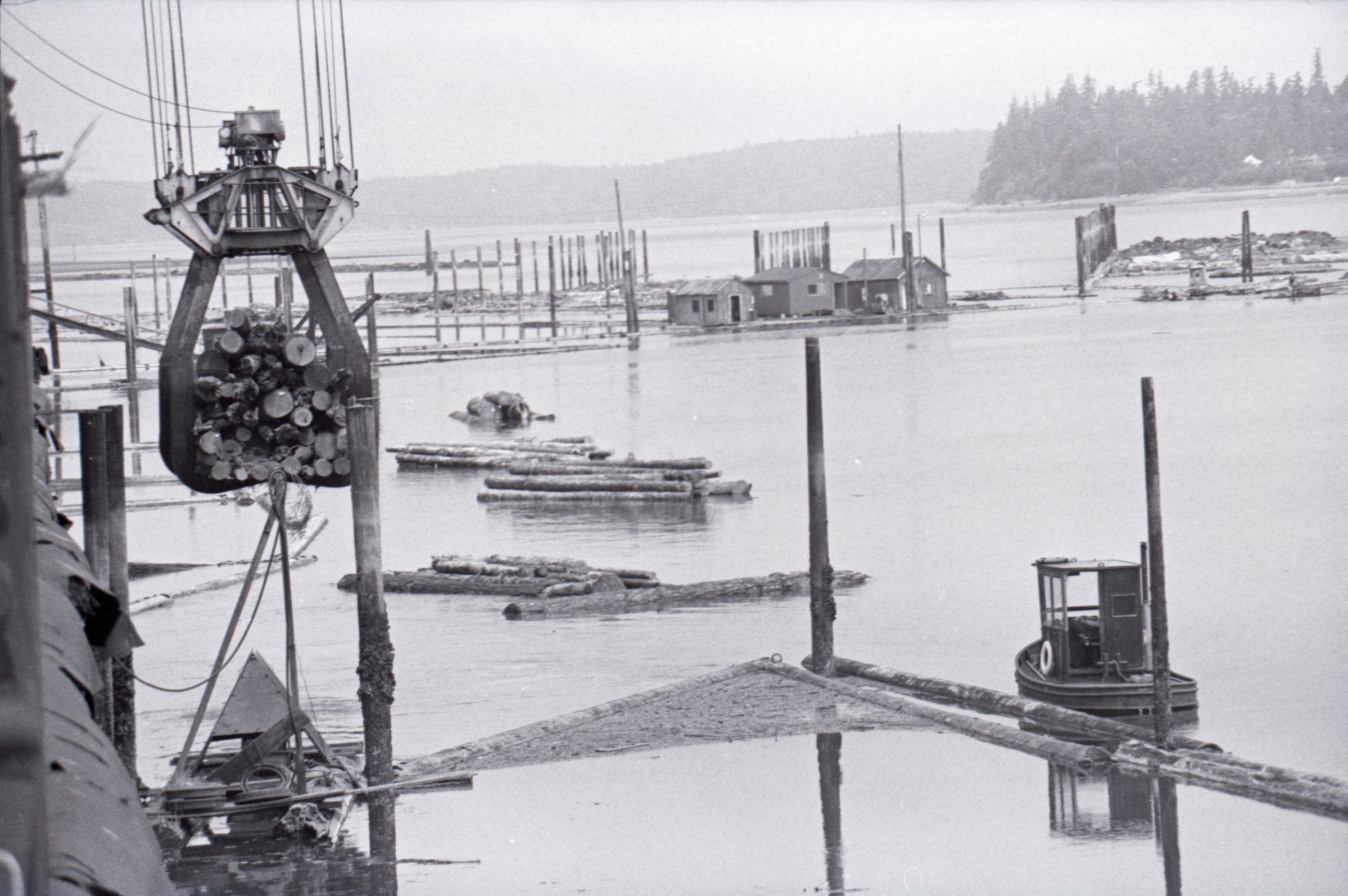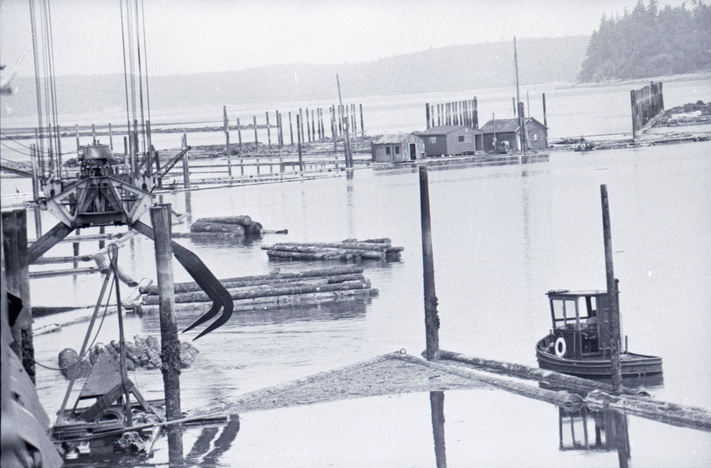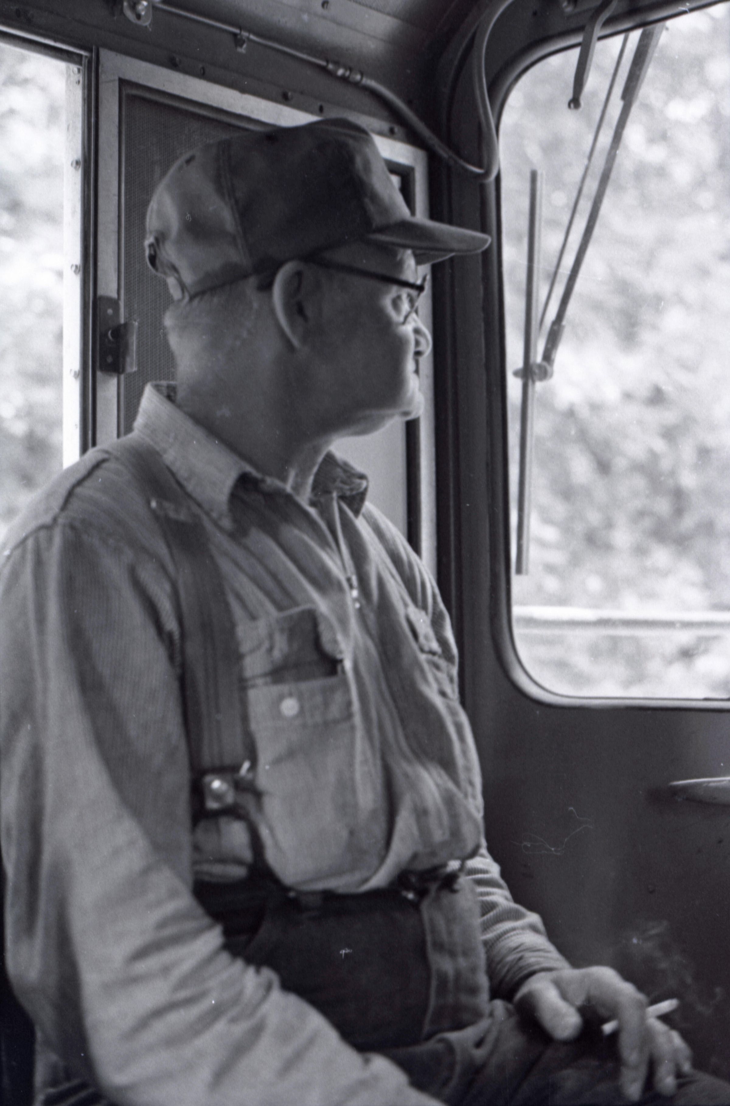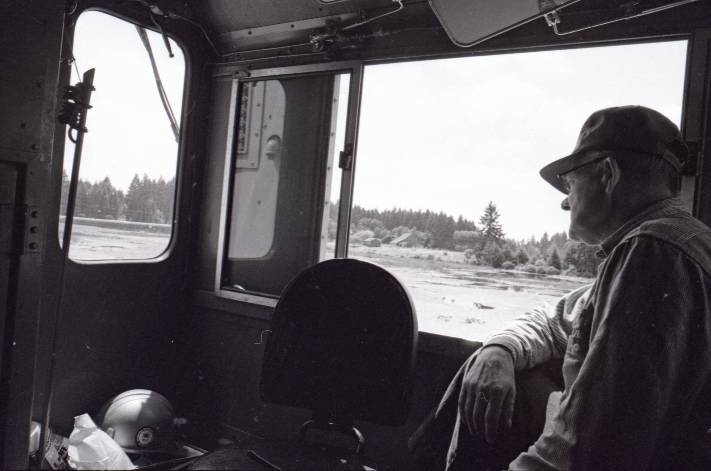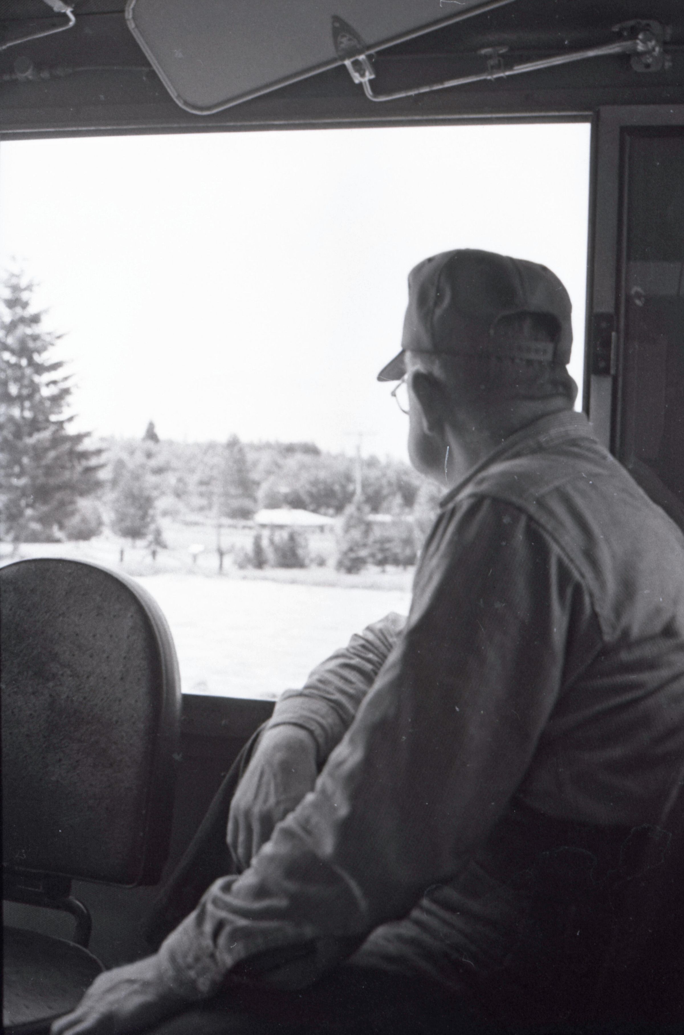 The images in group "b" show logs being unloaded via crane from log cars on a train, and placed into a body of water to be floated to another location. Image 43b shows two crane-mounted log "grabbers" which are closed and empty hanging over an empty log car. Image 44b shows a partially-filled log car on rails at the left-hand side of the image, and a body of water at right. A crane is hanging over the log car, and its "grabber" unit is holding a load of logs over the water. Image 1b is very similar to the previous image , but here the "grabber" unit with its load of logs has dropped down several feet closer to the water. Image 2b is similar to the previous two images, but here the "grabber" is even closer to the water. Image 3b is similar to the previous three images, but here the log car is no longer within the image frame. Image 4b is very similar to the previous image, but here the photographer has zoomed in on or moved closer to the "grabber." Image 5b was captured from the small catwalk attached to the side of a train engine. The image looks down the long axis of the train, and the log cars are empty. There is a body of water to the left and a wooded area in the distance. Image 6b shows a train engineer seated in the control area of a train. He is facing toward the left-hand side of the image frame and is shown in profile. He is wearing glasses, a cap, and thick gloves. A clipboard is hanging in the top-left quadrant of the image frame. A person is partially visible at the right-hand edge of the image frame. Image 7b is very similar to the previous image, but here the photographer has zoomed in on the engineer or moved closer to him. The clipboard is still visible in this image, but the second person is not. Image 8b is very similar to the previous image, but here the engineer has tipped his head slightly to his right and away from the camera. Images 9b through 11b are nearly identical to image 7b. Image 12b shows a body of water with several bundles of logs floating in it. A crane "grabber" unit is visible near the bottom-left corner of the image, and it appears to have just dropped one of the bundles of logs into the water. A small tugboat is visible near the bottom-right corner. A series of docks and large collections of floating logs are visible in the background. Image 13b is very similar to the previous image, but here the photographer has panned to the right slightly. The "grabber" unit is not visible in this image. Image 14b is very similar to the previous two images, but here the photographer has zoomed out considerably. A grabber unit with a load of logs is visible. Image 15b is very similar to the previous image, but here the photographer has again zoomed in. Image 16b is very similar to the previous image, but here the grabber unit has moved closer to the water. Image 17b shows a very blurry shot of an unknown object. Image 18b shows a train engineer seated in the control area of a train engine. He is seated in front of the train controls with his hands folded in his lap. His body is oriented toward the camera, but his head is turned to the left toward the controls. The front of his cap reads "CENEX." Two people are partially visible at the right-hand edge of the image. This image is oriented vertically. Image 19b is similar to the previous image, but here the engineer's head is turned more dramatically toward the left-hand side of the image frame. He is shown in profile. This image is oriented horizontally. Image 20 shows a tugboat on the water. It is facing toward the camera. Two logs are floating end-to-end alongside the tugboat to the right. Image 21b is nearly identical to the previous image.