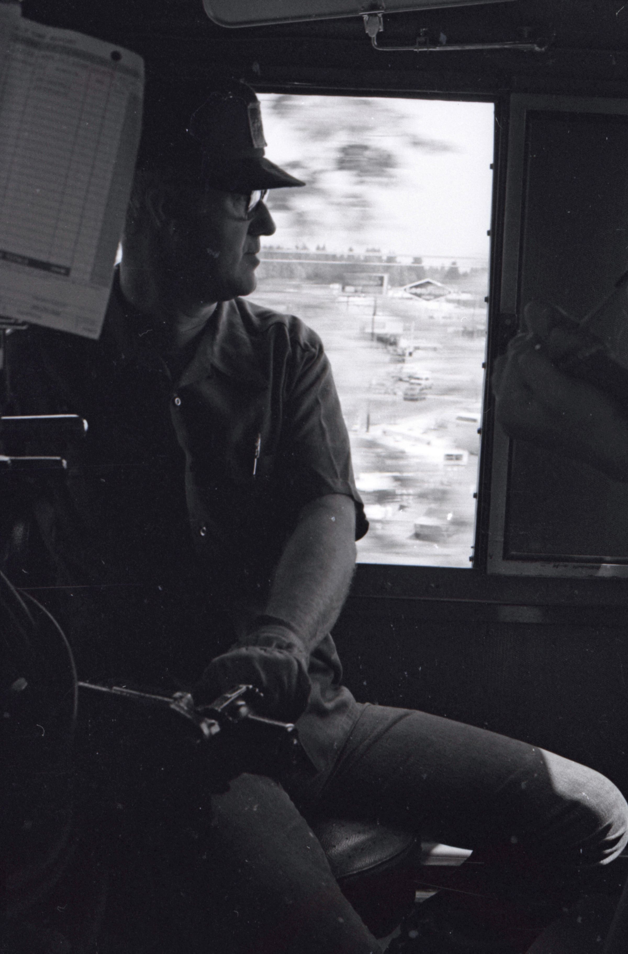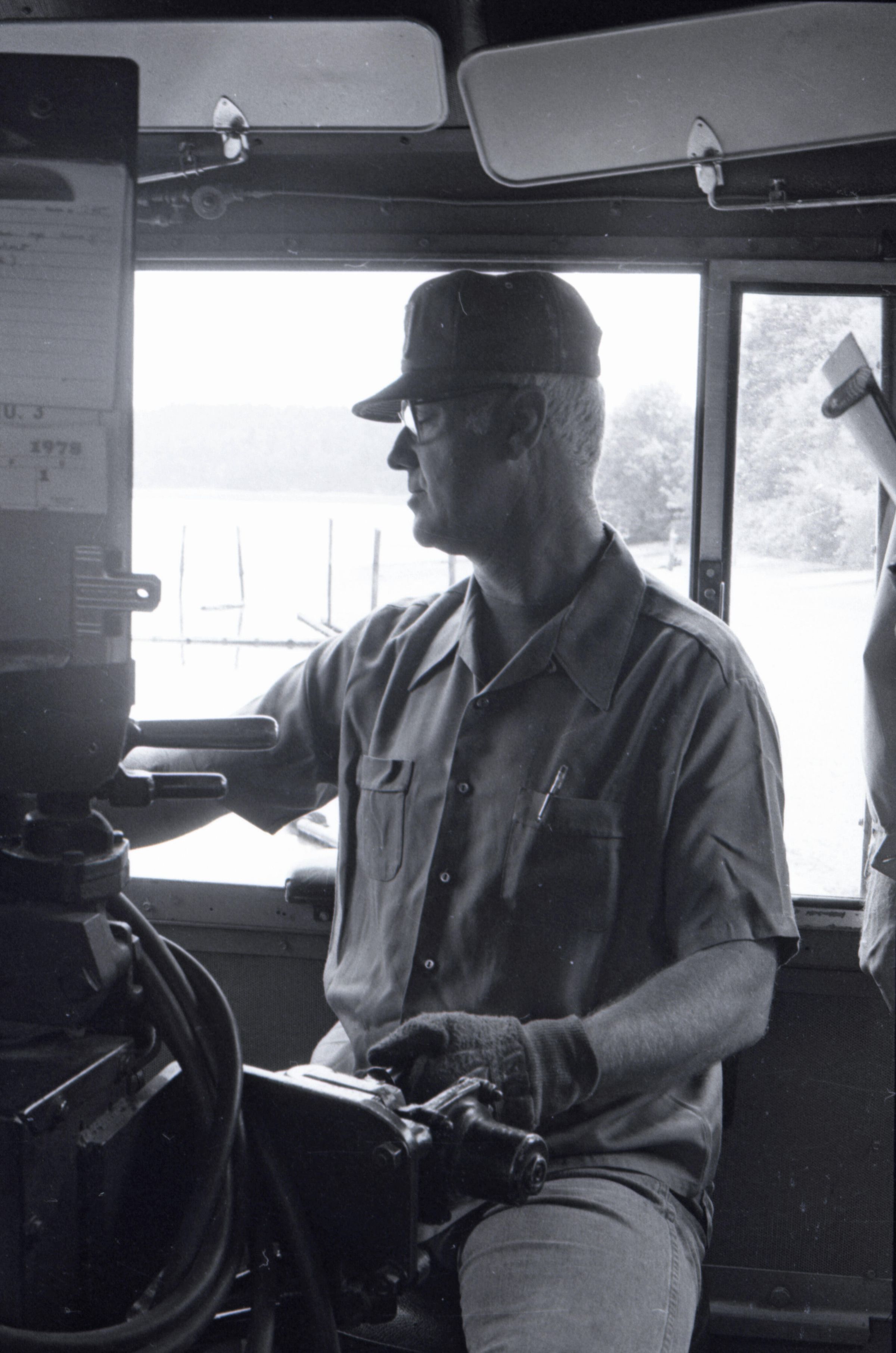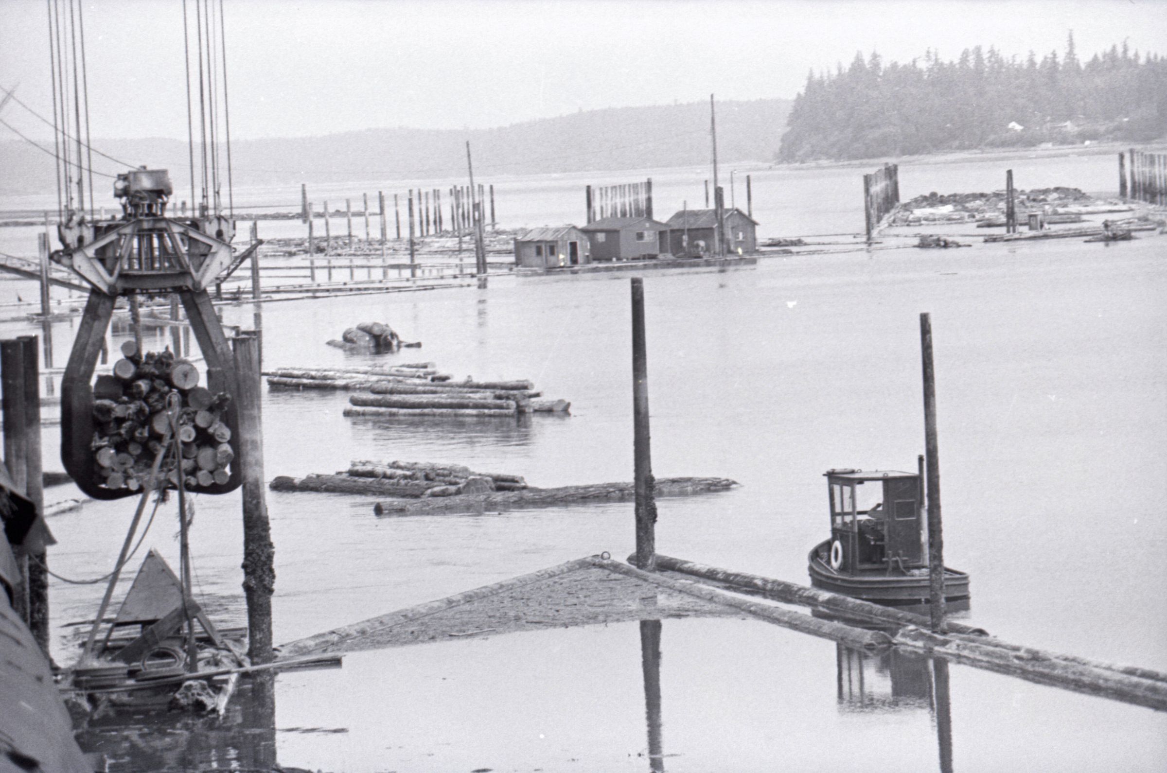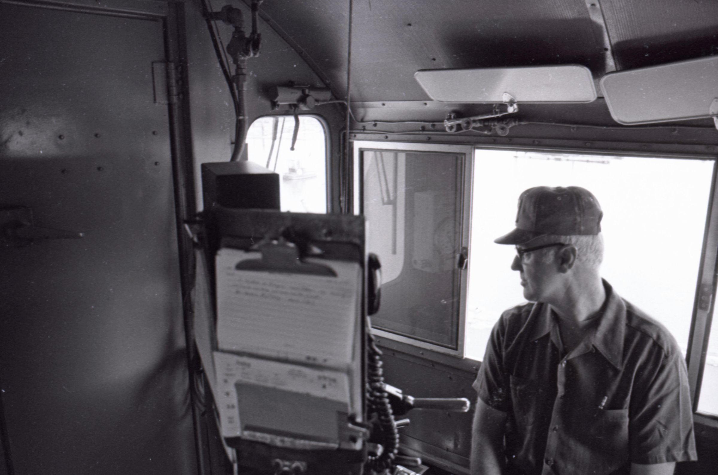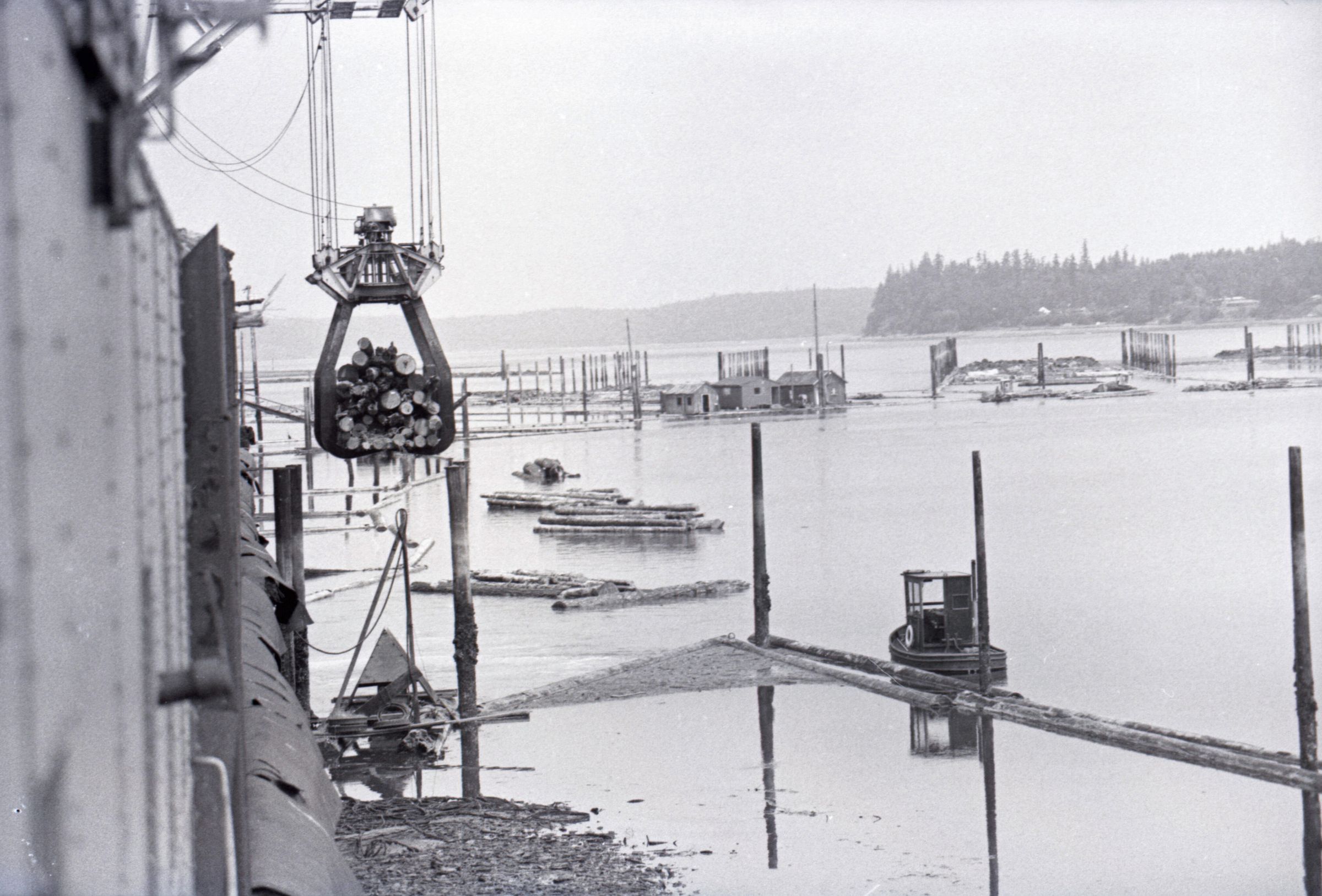 The images in group "b" show logs being unloaded via crane from log cars on a train, and placed into a body of water to be floated to another location. Image 43b shows two crane-mounted log "grabbers" which are closed and empty hanging over an empty log car. Image 44b shows a partially-filled log car on rails at the left-hand side of the image, and a body of water at right. A crane is hanging over the log car, and its "grabber" unit is holding a load of logs over the water. Image 1b is very similar to the previous image , but here the "grabber" unit with its load of logs has dropped down several feet closer to the water. Image 2b is similar to the previous two images, but here the "grabber" is even closer to the water. Image 3b is similar to the previous three images, but here the log car is no longer within the image frame. Image 4b is very similar to the previous image, but here the photographer has zoomed in on or moved closer to the "grabber." Image 5b was captured from the small catwalk attached to the side of a train engine. The image looks down the long axis of the train, and the log cars are empty. There is a body of water to the left and a wooded area in the distance. Image 6b shows a train engineer seated in the control area of a train. He is facing toward the left-hand side of the image frame and is shown in profile. He is wearing glasses, a cap, and thick gloves. A clipboard is hanging in the top-left quadrant of the image frame. A person is partially visible at the right-hand edge of the image frame. Image 7b is very similar to the previous image, but here the photographer has zoomed in on the engineer or moved closer to him. The clipboard is still visible in this image, but the second person is not. Image 8b is very similar to the previous image, but here the engineer has tipped his head slightly to his right and away from the camera. Images 9b through 11b are nearly identical to image 7b. Image 12b shows a body of water with several bundles of logs floating in it. A crane "grabber" unit is visible near the bottom-left corner of the image, and it appears to have just dropped one of the bundles of logs into the water. A small tugboat is visible near the bottom-right corner. A series of docks and large collections of floating logs are visible in the background. Image 13b is very similar to the previous image, but here the photographer has panned to the right slightly. The "grabber" unit is not visible in this image. Image 14b is very similar to the previous two images, but here the photographer has zoomed out considerably. A grabber unit with a load of logs is visible. Image 15b is very similar to the previous image, but here the photographer has again zoomed in. Image 16b is very similar to the previous image, but here the grabber unit has moved closer to the water. Image 17b shows a very blurry shot of an unknown object. Image 18b shows a train engineer seated in the control area of a train engine. He is seated in front of the train controls with his hands folded in his lap. His body is oriented toward the camera, but his head is turned to the left toward the controls. The front of his cap reads "CENEX." Two people are partially visible at the right-hand edge of the image. This image is oriented vertically. Image 19b is similar to the previous image, but here the engineer's head is turned more dramatically toward the left-hand side of the image frame. He is shown in profile. This image is oriented horizontally. Image 20 shows a tugboat on the water. It is facing toward the camera. Two logs are floating end-to-end alongside the tugboat to the right. Image 21b is nearly identical to the previous image.