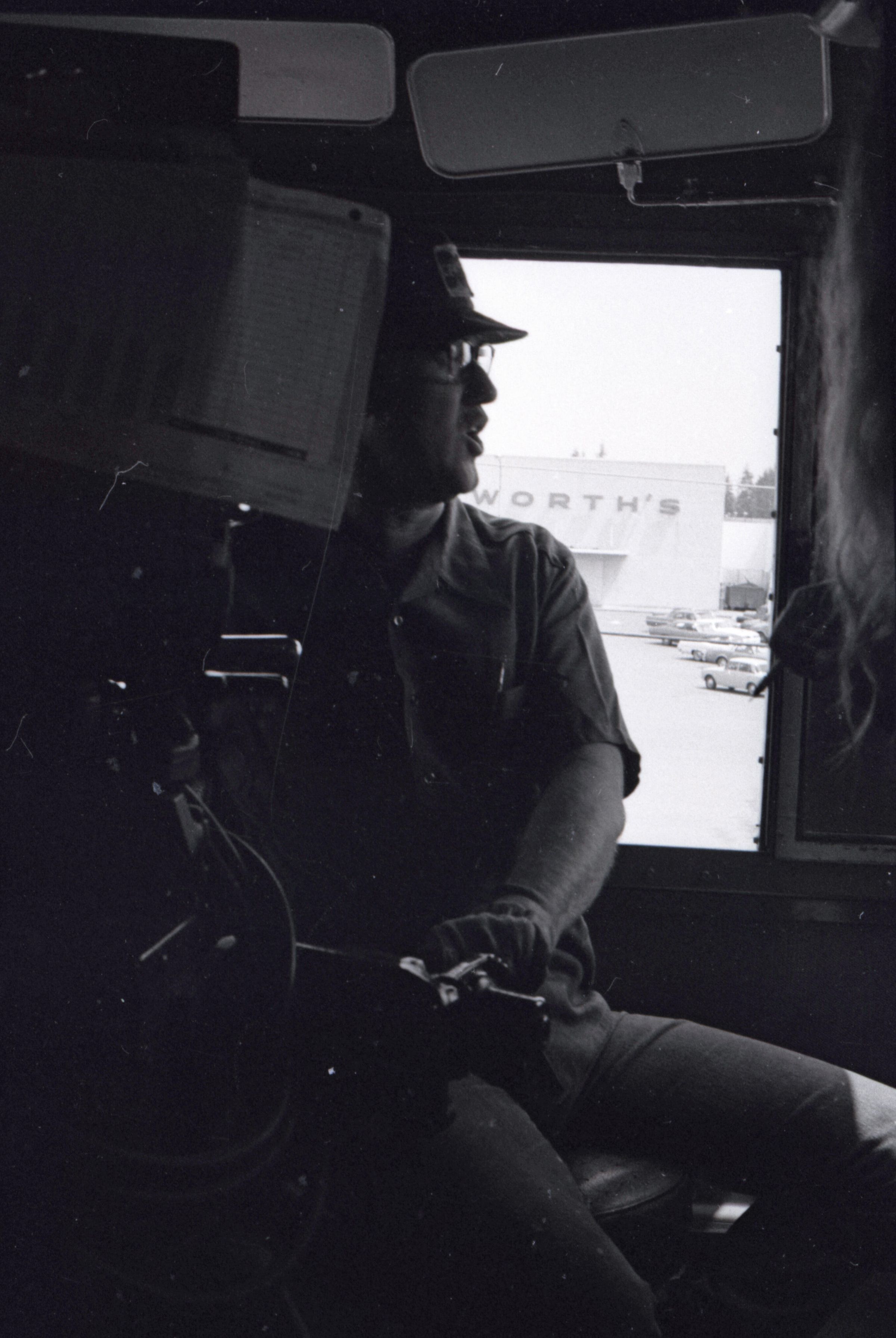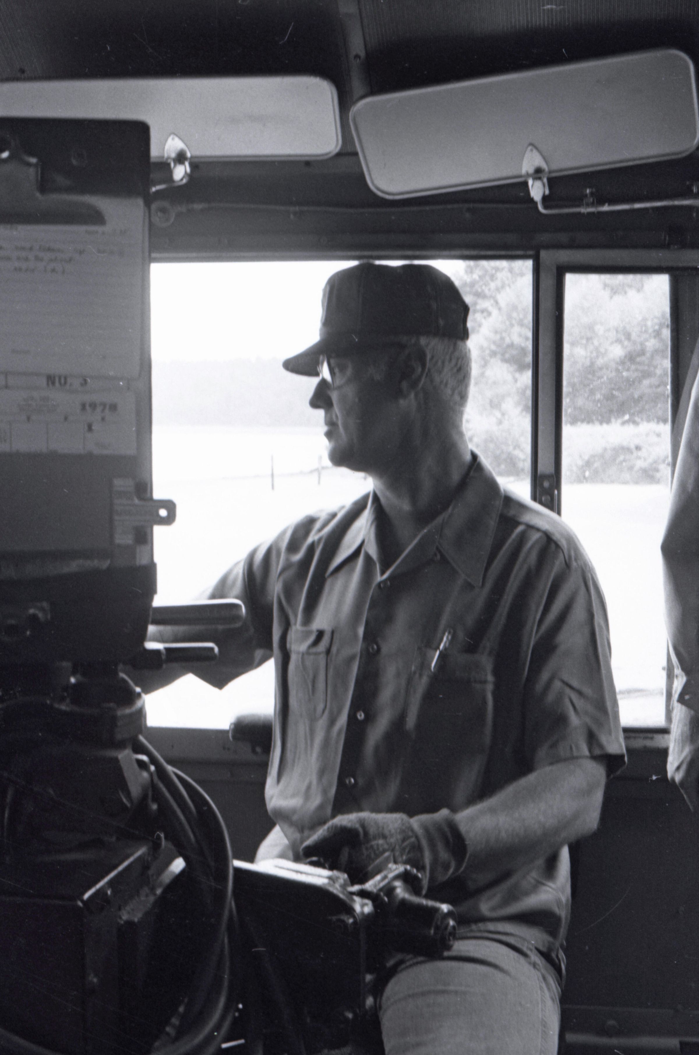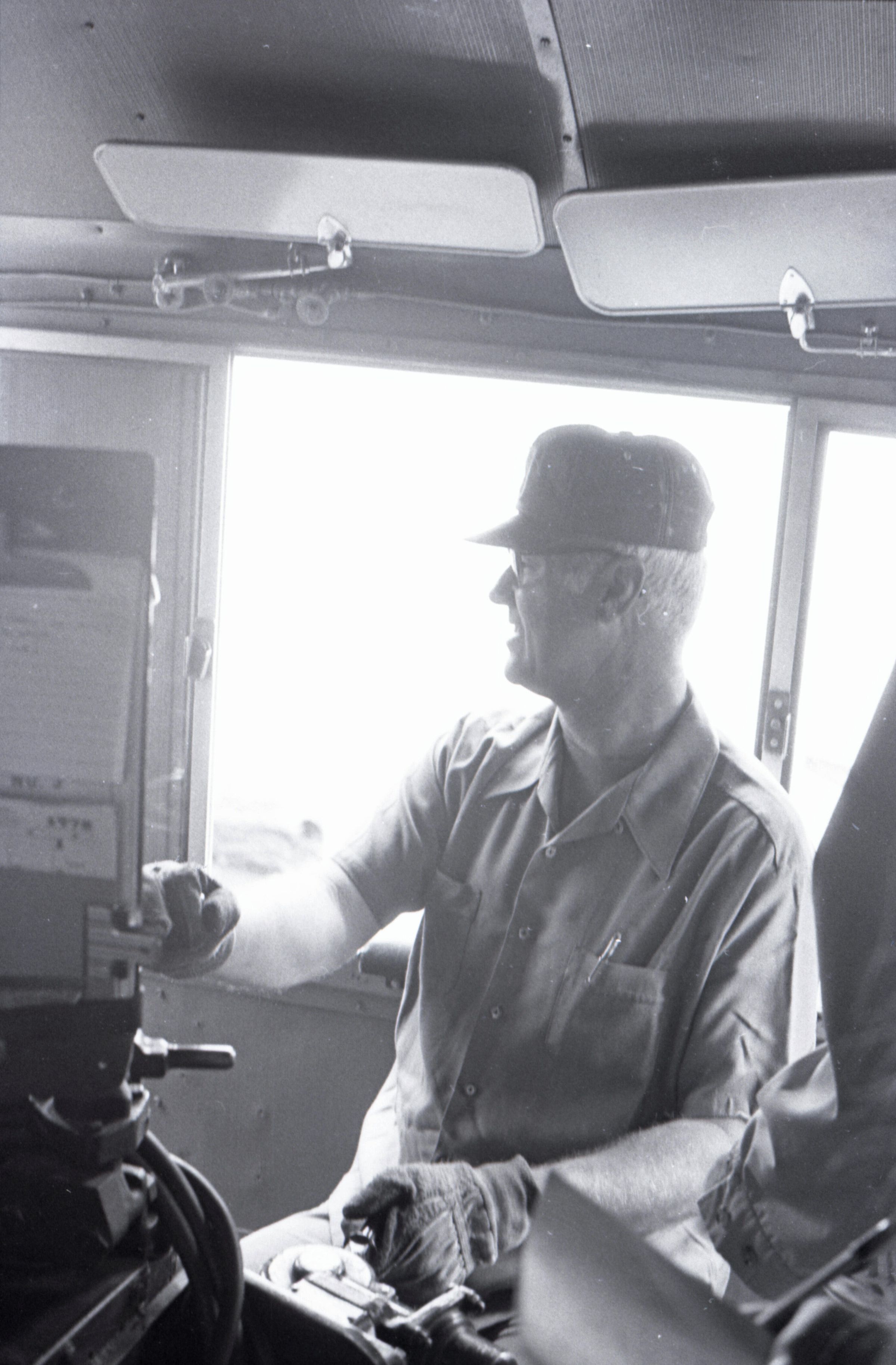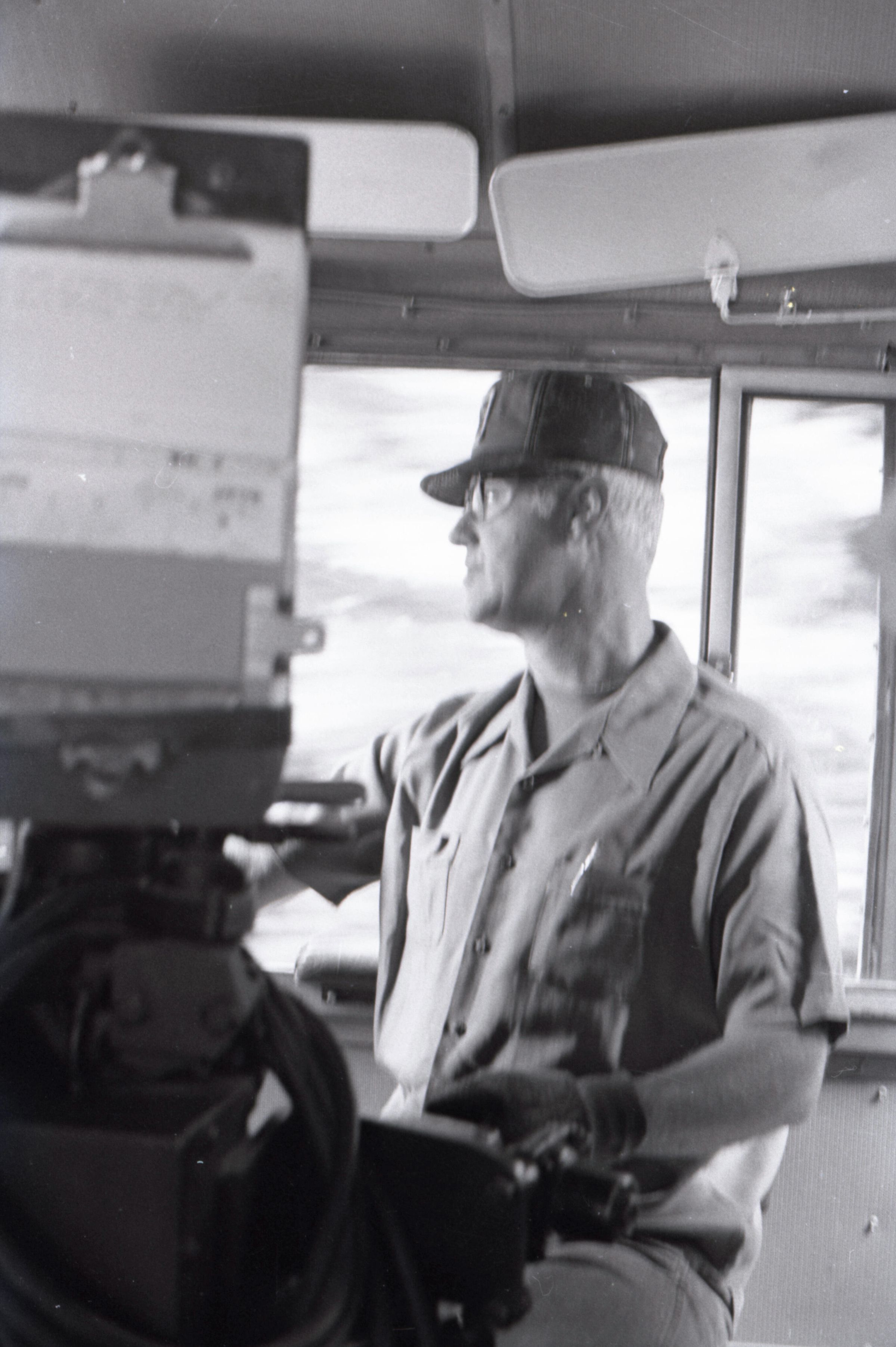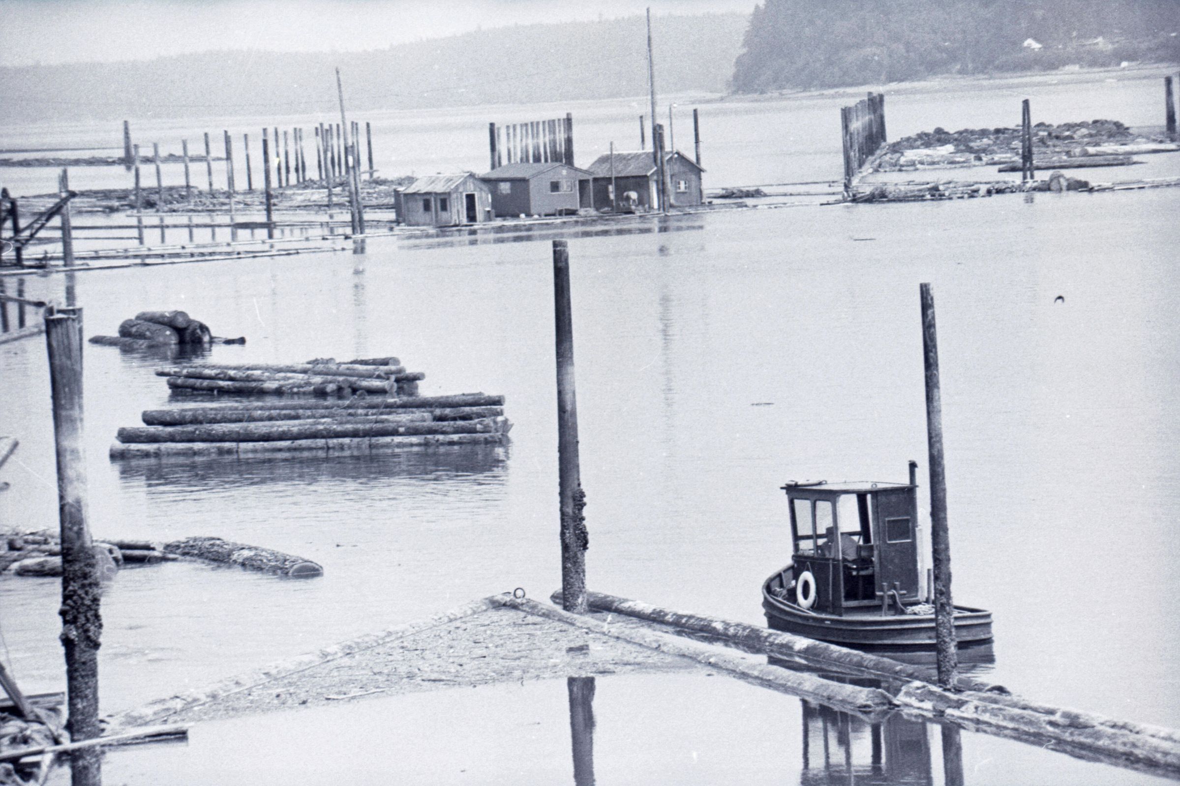 The images in group "b" show logs being unloaded via crane from log cars on a train, and placed into a body of water to be floated to another location. Image 43b shows two crane-mounted log "grabbers" which are closed and empty hanging over an empty log car. Image 44b shows a partially-filled log car on rails at the left-hand side of the image, and a body of water at right. A crane is hanging over the log car, and its "grabber" unit is holding a load of logs over the water. Image 1b is very similar to the previous image , but here the "grabber" unit with its load of logs has dropped down several feet closer to the water. Image 2b is similar to the previous two images, but here the "grabber" is even closer to the water. Image 3b is similar to the previous three images, but here the log car is no longer within the image frame. Image 4b is very similar to the previous image, but here the photographer has zoomed in on or moved closer to the "grabber." Image 5b was captured from the small catwalk attached to the side of a train engine. The image looks down the long axis of the train, and the log cars are empty. There is a body of water to the left and a wooded area in the distance. Image 6b shows a train engineer seated in the control area of a train. He is facing toward the left-hand side of the image frame and is shown in profile. He is wearing glasses, a cap, and thick gloves. A clipboard is hanging in the top-left quadrant of the image frame. A person is partially visible at the right-hand edge of the image frame. Image 7b is very similar to the previous image, but here the photographer has zoomed in on the engineer or moved closer to him. The clipboard is still visible in this image, but the second person is not. Image 8b is very similar to the previous image, but here the engineer has tipped his head slightly to his right and away from the camera. Images 9b through 11b are nearly identical to image 7b. Image 12b shows a body of water with several bundles of logs floating in it. A crane "grabber" unit is visible near the bottom-left corner of the image, and it appears to have just dropped one of the bundles of logs into the water. A small tugboat is visible near the bottom-right corner. A series of docks and large collections of floating logs are visible in the background. Image 13b is very similar to the previous image, but here the photographer has panned to the right slightly. The "grabber" unit is not visible in this image. Image 14b is very similar to the previous two images, but here the photographer has zoomed out considerably. A grabber unit with a load of logs is visible. Image 15b is very similar to the previous image, but here the photographer has again zoomed in. Image 16b is very similar to the previous image, but here the grabber unit has moved closer to the water. Image 17b shows a very blurry shot of an unknown object. Image 18b shows a train engineer seated in the control area of a train engine. He is seated in front of the train controls with his hands folded in his lap. His body is oriented toward the camera, but his head is turned to the left toward the controls. The front of his cap reads "CENEX." Two people are partially visible at the right-hand edge of the image. This image is oriented vertically. Image 19b is similar to the previous image, but here the engineer's head is turned more dramatically toward the left-hand side of the image frame. He is shown in profile. This image is oriented horizontally. Image 20 shows a tugboat on the water. It is facing toward the camera. Two logs are floating end-to-end alongside the tugboat to the right. Image 21b is nearly identical to the previous image.