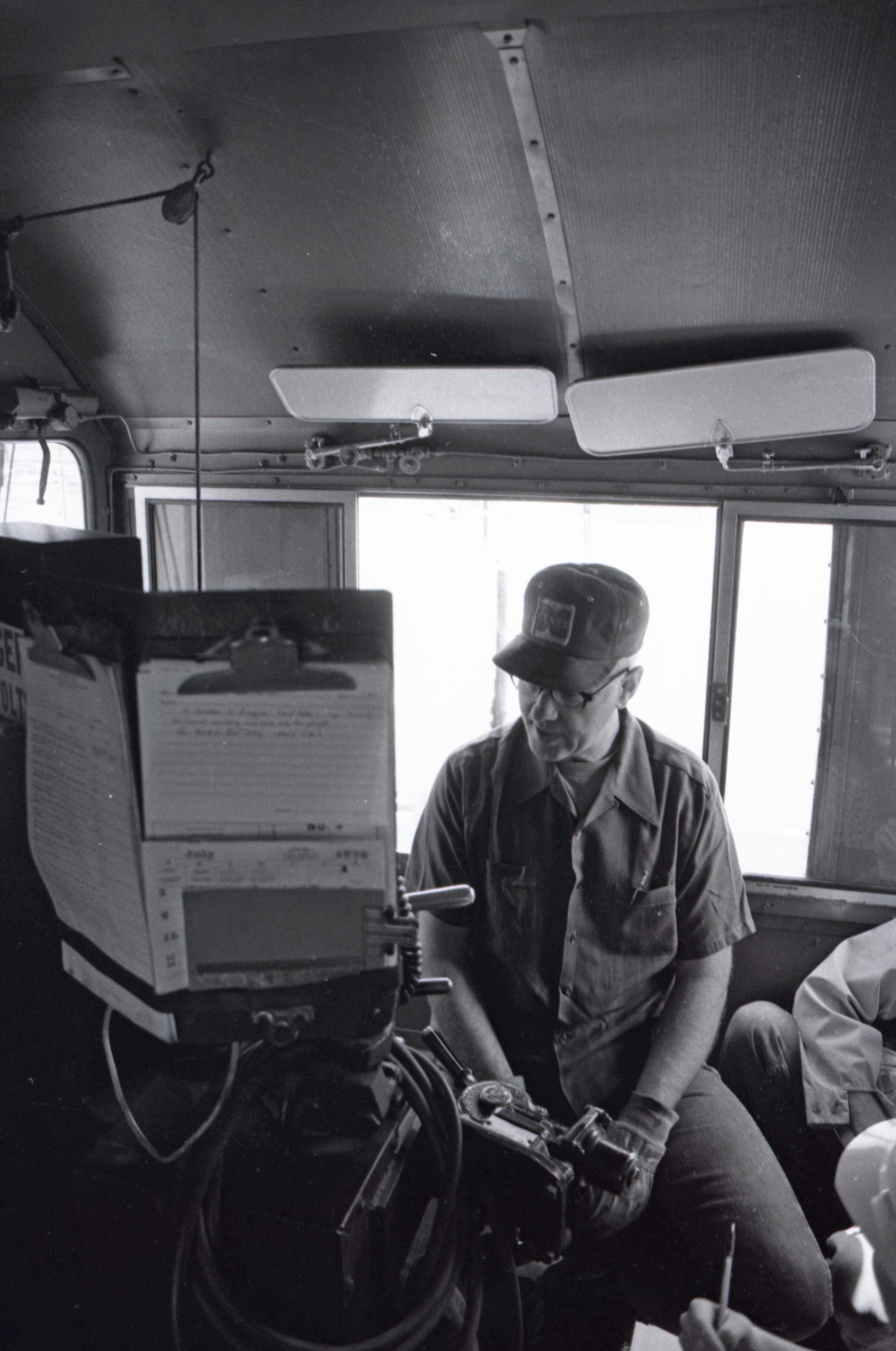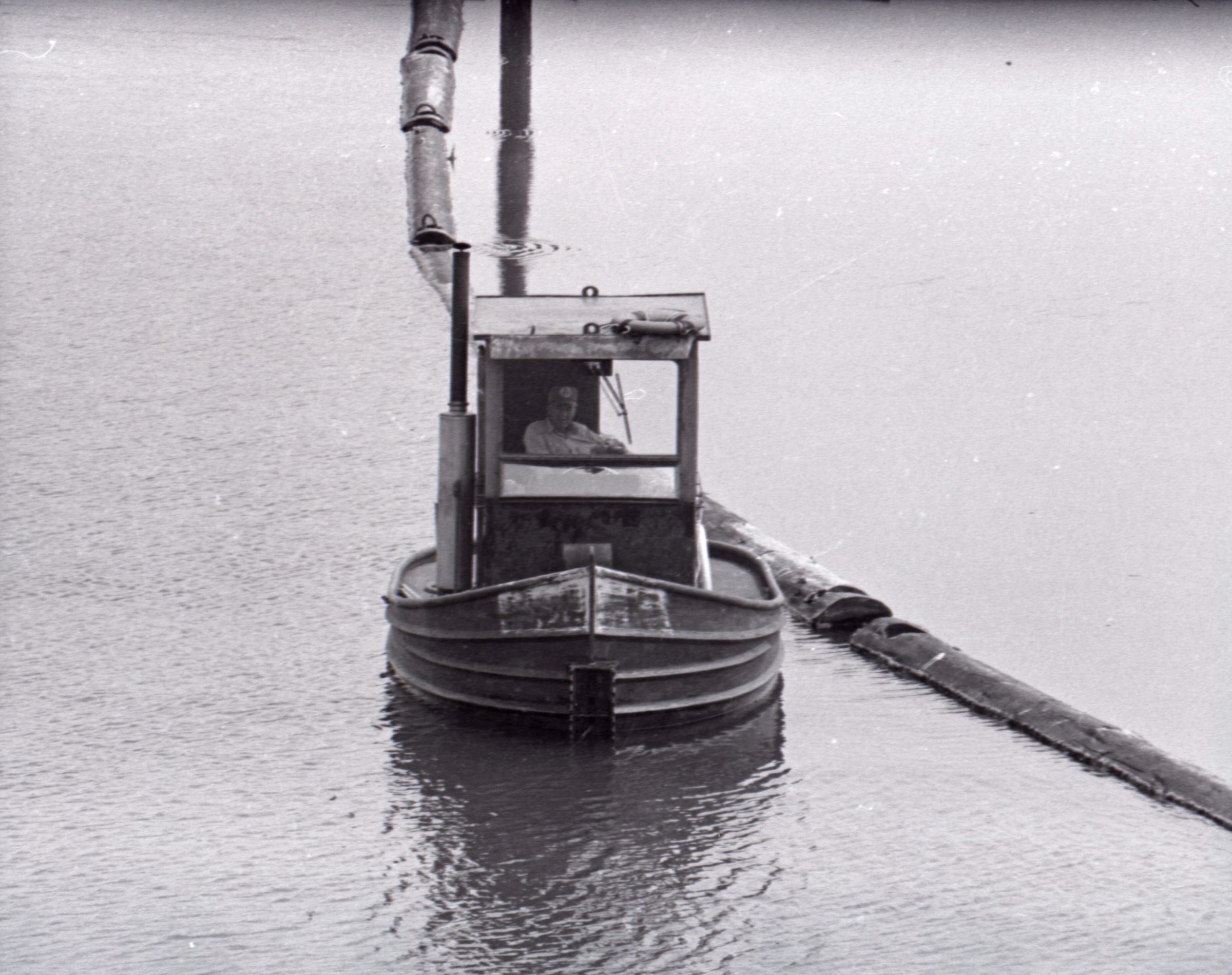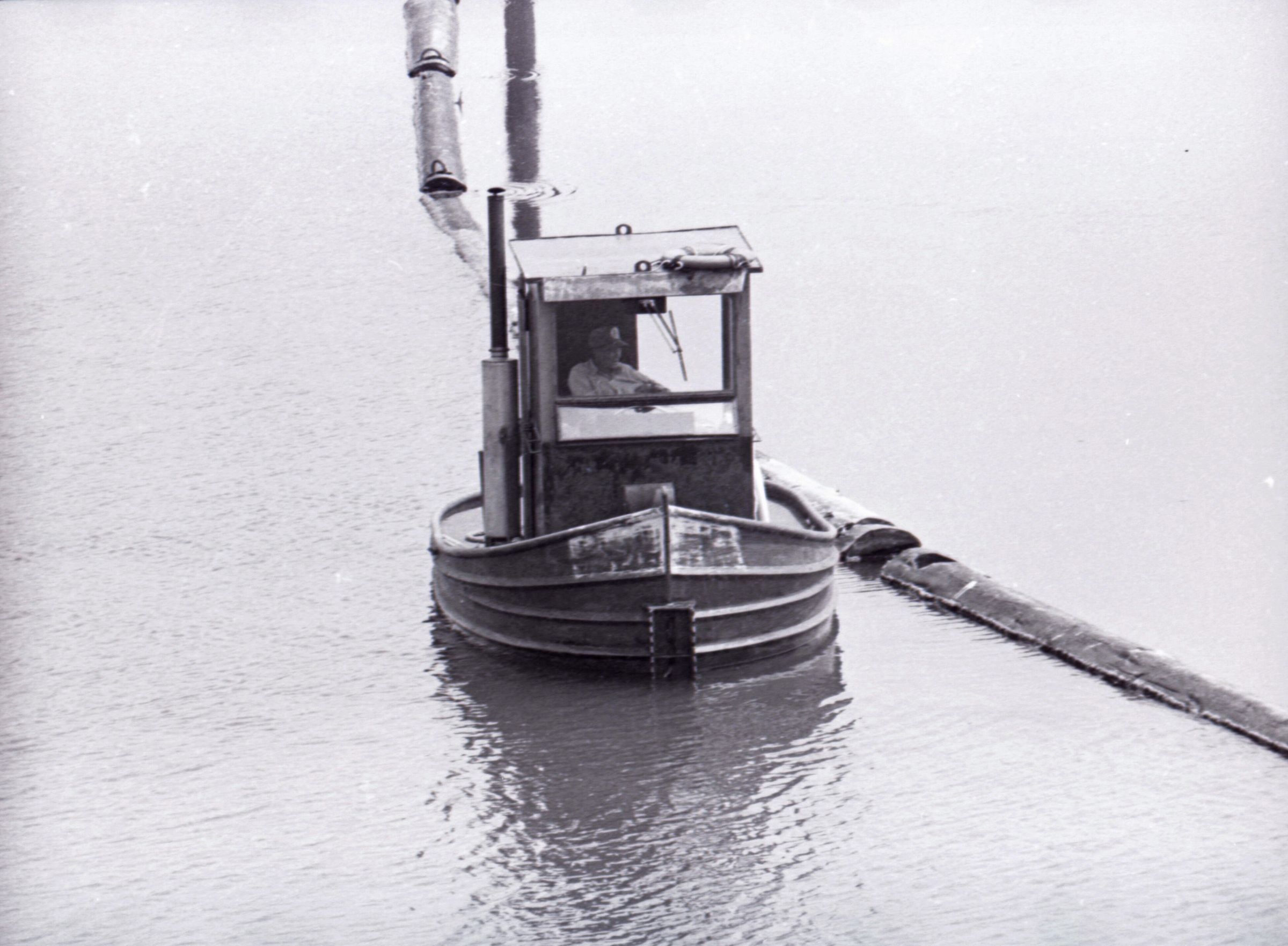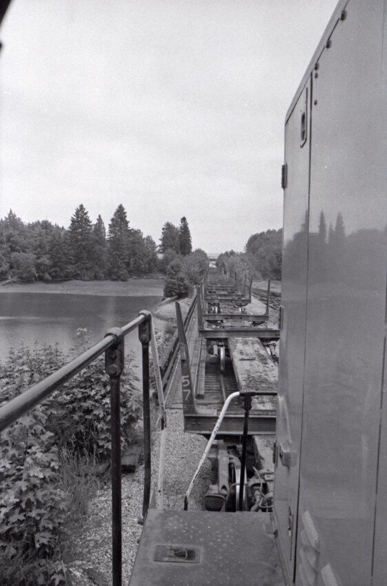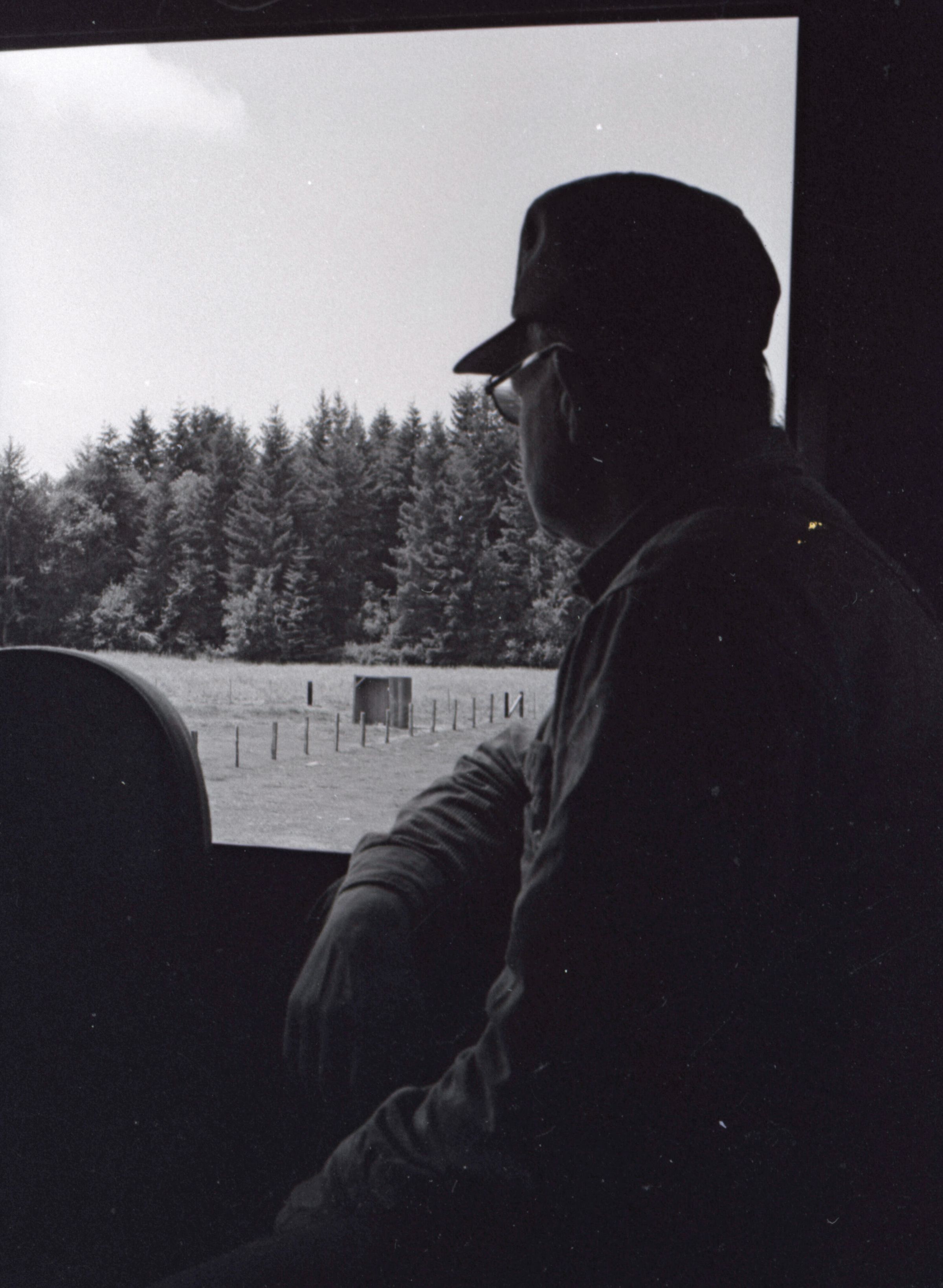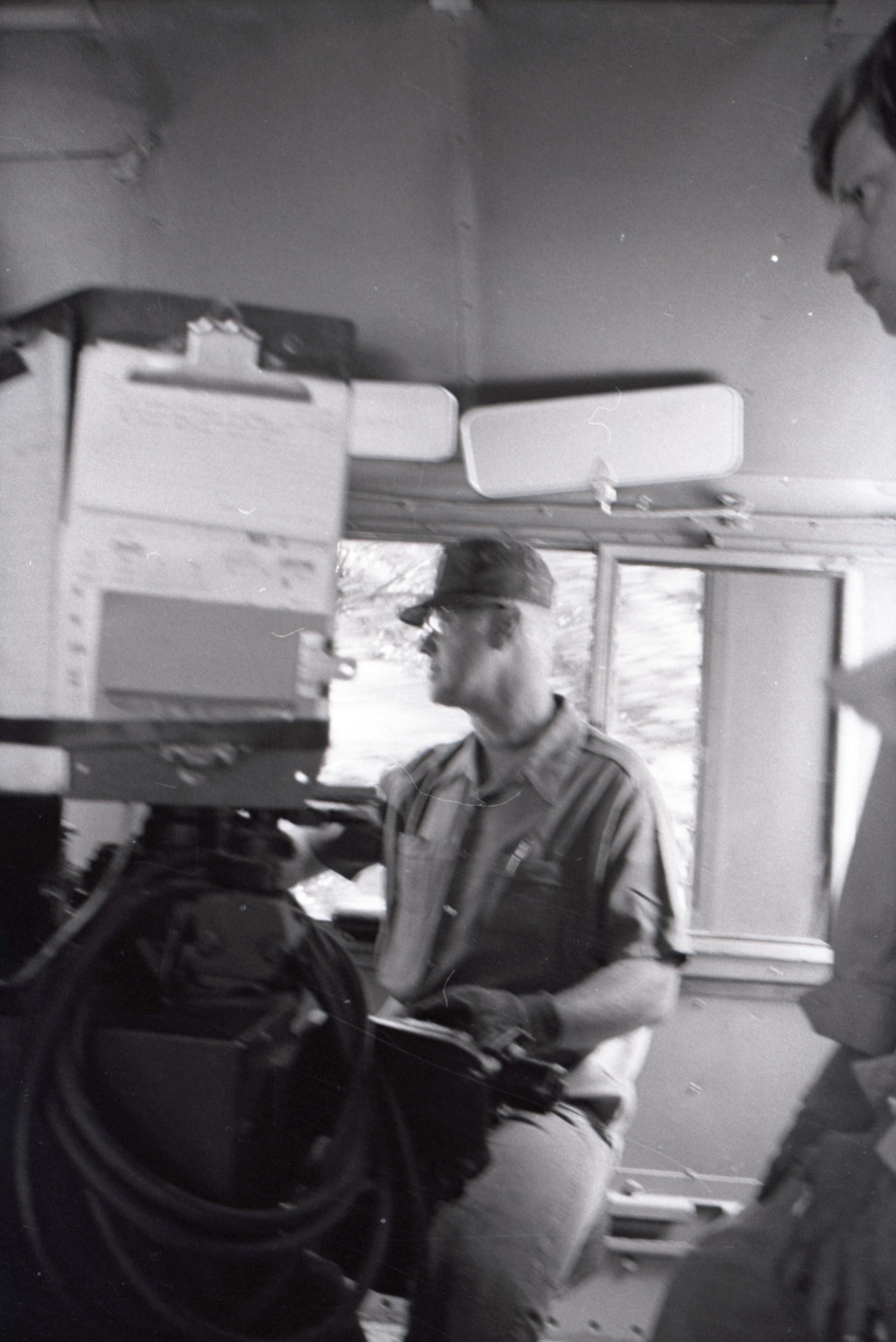 The images in group "b" show logs being unloaded via crane from log cars on a train, and placed into a body of water to be floated to another location. Image 43b shows two crane-mounted log "grabbers" which are closed and empty hanging over an empty log car. Image 44b shows a partially-filled log car on rails at the left-hand side of the image, and a body of water at right. A crane is hanging over the log car, and its "grabber" unit is holding a load of logs over the water. Image 1b is very similar to the previous image , but here the "grabber" unit with its load of logs has dropped down several feet closer to the water. Image 2b is similar to the previous two images, but here the "grabber" is even closer to the water. Image 3b is similar to the previous three images, but here the log car is no longer within the image frame. Image 4b is very similar to the previous image, but here the photographer has zoomed in on or moved closer to the "grabber." Image 5b was captured from the small catwalk attached to the side of a train engine. The image looks down the long axis of the train, and the log cars are empty. There is a body of water to the left and a wooded area in the distance. Image 6b shows a train engineer seated in the control area of a train. He is facing toward the left-hand side of the image frame and is shown in profile. He is wearing glasses, a cap, and thick gloves. A clipboard is hanging in the top-left quadrant of the image frame. A person is partially visible at the right-hand edge of the image frame. Image 7b is very similar to the previous image, but here the photographer has zoomed in on the engineer or moved closer to him. The clipboard is still visible in this image, but the second person is not. Image 8b is very similar to the previous image, but here the engineer has tipped his head slightly to his right and away from the camera. Images 9b through 11b are nearly identical to image 7b. Image 12b shows a body of water with several bundles of logs floating in it. A crane "grabber" unit is visible near the bottom-left corner of the image, and it appears to have just dropped one of the bundles of logs into the water. A small tugboat is visible near the bottom-right corner. A series of docks and large collections of floating logs are visible in the background. Image 13b is very similar to the previous image, but here the photographer has panned to the right slightly. The "grabber" unit is not visible in this image. Image 14b is very similar to the previous two images, but here the photographer has zoomed out considerably. A grabber unit with a load of logs is visible. Image 15b is very similar to the previous image, but here the photographer has again zoomed in. Image 16b is very similar to the previous image, but here the grabber unit has moved closer to the water. Image 17b shows a very blurry shot of an unknown object. Image 18b shows a train engineer seated in the control area of a train engine. He is seated in front of the train controls with his hands folded in his lap. His body is oriented toward the camera, but his head is turned to the left toward the controls. The front of his cap reads "CENEX." Two people are partially visible at the right-hand edge of the image. This image is oriented vertically. Image 19b is similar to the previous image, but here the engineer's head is turned more dramatically toward the left-hand side of the image frame. He is shown in profile. This image is oriented horizontally. Image 20 shows a tugboat on the water. It is facing toward the camera. Two logs are floating end-to-end alongside the tugboat to the right. Image 21b is nearly identical to the previous image.
